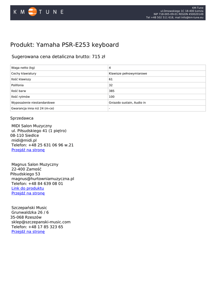 KM-Tune ul.Dmowskiego 1C 18-400 Łomża NIP 718-005-09-01 REGON 450020149 Tel +48 502 511 618, mail [email protected] Produkt: Yamaha PSR-E253 keyboard Sugerowana cena detaliczna brutto: 715 zł Waga netto (kg) 4 Cechy klawiatury Klawisze pełnowymiarowe Ilość klawiszy 61 Polifonia 32 Ilość barw 385 Ilość rytmów 100 Wyposażenie niestandardowe Gniazdo sustain, Audio in Gwarancja inna niż 24 (m-ce) - o Sprzedawca MIDI Salon Muzyczny ul. Piłsudskiego 41 (1 piętro) 08-110 Siedlce [email protected] Telefon: +48 25 631 06 96 w.21 Przejdź na stronę Magnus Salon Muzyczny 22-400 Zamość Piłsudskiego 53 [email protected] Telefon: +48 84 639 08 01 Link do produktu Przejdź na stronę Szczepański Music Grunwaldzka 26 / 6 35-068 Rzeszów [email protected] Telefon: +48 17 85 323 65 Przejdź na stronę Powered by TCPDF (www.tcpdf.org)