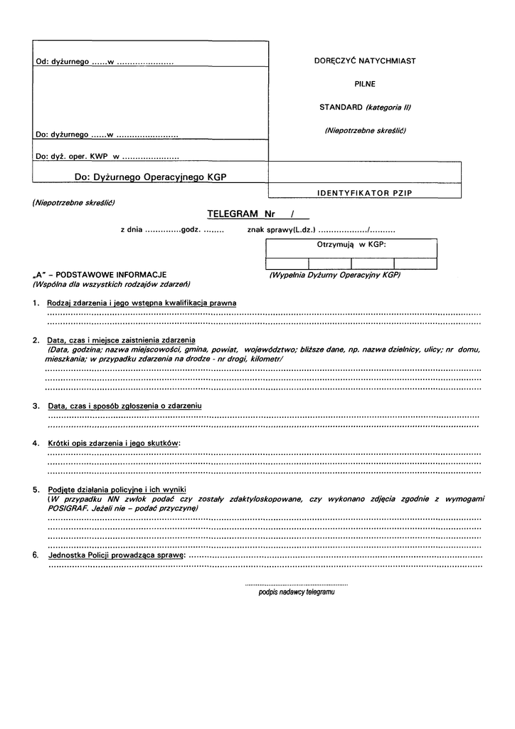 DORĘCZYĆ NATYCHMIAST Od: dyżurnego ......w PILNE STANDARD (kategoria II) (Niepotrzebne skreślić) Do: dyżurnego ......w Do: dyż. oper. KWP w Do: Dyżurnego Operacyjnego KGP I D E N T Y F I K A T O R PZIP (Niepotrzebne skreślić) TELEGRAM Nr z dnia ..............godz. ........ / znak sprawyd.dz.) .................../....... Otrzymują w KGP: „A" - PODSTAWOWE INFORMACJE (Wspólna dla wszystkich rodzajów zdarzeń) 1. 2. l l (Wypełnia Dyżurny Operacyjny KGP) Rodzaj zdarzenia i jego wstępna kwalifikacja prawna Data, czas i miejsce zaistnienia zdarzenia (Data, godzina; nazwa miejscowości, gmina, powiat, województwo; bliższe dane, np. nazwa dzielnicy, ulicy; nr domu, mieszkania; w przypadku zdarzenia na drodze - nr drogi, kilometr/ 3. Data, czas i sposób zgłoszenia o zdarzeniu 4. Krótki opis zdarzenia i jego skutków: 5. Podjęte działania policyjne i ich wyniki (W przypadku NN zwłok podać czy zostały zdaktyloskopowane, czy wykonano zdjęcia zgodnie z wymogami POSlGRAF. Jeżeli nie - podać przyczyną) 6. Jednostka Policji prowadząca sprawę: .................................................................................................................. podpis nadawcy telegramu „B1" - DODATKOWE INFORMACJE O PRZESTĘPSTWIE l OSOBACH Z NIM ZWIĄZANYCH 7. Poprzednie telegramy dot. tego zdarzenia (nr telegramu i data nadania - jeżeli część „B 1" stanowi samodzielny dokument) 8. Informacje o sprawcy(ach) 9. Informacje o pokrzywdzonym (ych). 10. Zabezpieczone ślady kryminalistyczne. 11. Cechy i numery identyfikacyjne przedmiotów utraconych w wyniku przestępstwa 12. Inne istotne dane uzupełniające podpis nadawcy telegramu „B2" - DODATKOWE INFORMACJE O OSOBIE ZAGINIONEJ 7. Dane rysopisowe i znaki szczególne 8. Dokładny opis ubioru 9. Adres miejsca zamieszkania 10. Inne istotne dane uzupełniające: (W szczególności podać czy zabezpieczono - z miejsca zamieszkania, pracy itp. mogące pochodzić od osoby zaginionej: 1) ślady linii papilarnych, 2) materiał do badań DNA, taki jak włosy, niedopałki, szczoteczka do zębów, zaschnięta krew, używana odzież, 3) zdjęcia - w tym spełniające wymogi POSIGRAF, 4) zdjęcia R TG czaszki, zębów, złamań.) podpis nadawcy telegramu „B3" - DODATKOWE INFORMACJE O ZNALEZIENIU NN ZWŁOK 7. Miejsce znalezienia zwłok 8. Prawdopodobna przyczyna śmierci 9. Dane rysopisowe i znaki szczególne 10. Dokładny opis ubioru 11. Dane uprawnionego podmiotu, który dokonał pobrania materiału biologicznego w celu identyfikacji NN zwłok (Zakład Medycyny Sądowej, lekarz medycyny zatrudniony w komórce kryminalistyki, biegły, osoba przeszkolona) 12. Inne istotne dane uzupełniające: podpis nadawcy telegramu „B4" - DODATKOWE INFORMACJE: O WYPADKU DROGOWYM l OSOBACH W NIM UCZESTNICZĄCYCH 7. Poprzednie telegramy dot. tego zdarzenia (nr telegramu i data nadania - jeżeli część „B4" stanowi samodzielny dokument) 8. Szczegółowe dane o uczestnikach zdarzenia (imię, nazwisko, imiona rodziców, nazwisko rodowe matki, data i miejsce urodzenia, PESEL lub obywatelstwo, adres miejsca zamieszkania, dane dokumentu tożsamości, stan trzeźwości, dane pojazdu - marka, nr rejestracyjny, nr polisy ubezpieczeniowej, właściciel, rodzaj, dane dokumentu uprawniającego do kierowania pojazdem - nr dokumentu, kategoria, data wydania, kto wydał) 9. Szczegółowy opis zdarzenia (wskazanie kierunku ruchu pojazdu, pieszego, sposób zachowania się uczestników zdarzenia, warunki atmosferyczne itp.) 10. Zabezpieczone ślady kryminalistyczne 11. Miejsce przewiezienia poszkodowanych w wyniku zdarzenia (szpital, przychodnia, ZMS) 12. Inne istotne dane uzupełniające: podpis nadawcy telegramu „B5" - DODATKOWE INFORMACJE O ZBIOROWYM NARUSZENIU PRAWA (ZAKŁÓCENIU PORZĄDKU PUBLICZNEGO) l OSOBACH Z NIM ZWIĄZANYCH 7. Poprzednie telegramy dot. tego zdarzenia (nr telegramu i data nadania - jeżeli część „B5" stanowi samodzielny dokument) 8. Informacje o sprawcach 9. Informacje o pokrzywdzonych / poszkodowanych 10. Informacje o szkodach w mieniu 11. Zabezpieczone dowody rzeczowe 12. Inne istotne dane uzupełniające: podpis nadawcy telegramu