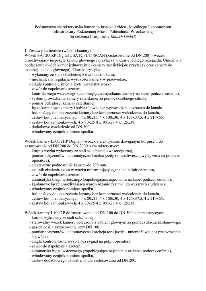 Podstawowa charakterystyka kamer do inspekcji video „Mobilnego Laboratorium Infrastruktury Podziemnej Miast” Politechniki Wrocławskiej (urządzenia firmy firmy Rausch GmbH) 1. Zestawy kamerowe (wózki i kamery) Wózek SAT200ZP Digital z SATCPU11/SCAN (zastosowanie od DN 200) - wózek umoŜliwiający inspekcję kanału głównego i przyłącza w czasie jednego przejazdu. UmoŜliwia podłączenie dwóch kamer jednocześnie (kamery satelickiej do przyłączy oraz kamery do inspekcji kanału głównego). Charakterystyka: - wykonany ze stali szlachetnej z dwoma silnikami, - mechaniczna regulacja wysokości kamery w przewodzie, - ciągła kontrola ciśnienia azotu wewnątrz wózka, - zawór do napełniania azotem, - kontrola biegu wstecznego (zapobiegająca najechaniu kamery na kabel podczas cofania), - system prowadzenia kamery satelitarnej za pomocą osobnego silnika, - pomiar odległości kamery satelitarnej, - łącze kardanowe kamery i kabla ułatwiające wprowadzanie zestawu do kanału, - hak słuŜący do opuszczania kamery bez konieczności wchodzenia do kanału, - zestaw kół pneumatycznych: 4 x 80x25, 4 x 100x30, 4 x 125x37,5, 4 x 210x65, - zestaw kół kamionkowych: 4 x 80x25 4 x 100x28 4 x 125x38, - dodatkowe oświetlenie od DN 300, - wbudowany czujnik pomiaru spadku. Wózek kamery L500/2HP Digital – wózek z elektrycznie dźwiganym korpusem do zastosowania od DN 200 do DN 2000 o charakterystyce: - korpus wózka wykonany ze stali szlachetnej kwasoodpornej, - pomiar horyzontów i automatyczna korekta jazdy (z moŜliwością wyłączenia na pulpicie operatora), - elektryczne podnoszenie kamery do 290 mm, - czujnik ciśnienia azotu w wózku transmitujący sygnał na pulpit operatora, - zawór do napełniania azotem, - automatyka biegu wstecznego (zapobiegająca najechaniu na kabel podczas cofania), - kardanowe łącze umoŜliwiająca wprowadzanie zestawu do węŜszych studzienek, - wbudowany czujnik pomiaru spadku, - hak słuŜący do opuszczania kamery bez konieczności wchodzenia do kanału, - zestaw kół pneumatycznych: 4 x 80x25, 4 x 100x30, 4 x 125x37,5, 4 x 210x65, - zestaw kół kamionkowych: 4 x 80x25 4 x 100x28 4 x 125x38. Wózek kamery L100/2P do zastosowania od DN 100 do DN 500 o charakterystyce: - korpus wykonany ze stali szlachetnej, - sterowalny wózek kamery połączony z kablem głównym za pomocą złącza kardanowego, - gąsienice dla zastosowania przy DN 100, - pomiar horyzontów i automatyczna korekcja toru jazdy – uniemoŜliwiająca przewrócenie się wózka, - ciągła kontrola azotu wysyłająca sygnał na pulpit operatora, - zawór do napełniania azotem, - automatyka biegu wstecznego (zapobiegająca najechaniu na kabel podczas cofania), - wbudowany czujnik pomiaru spadku, - zestaw dodatkowego oświetlenia dla zastosowania od DN 200. Kamera PanCam do zastosowania z wózkiem L500: - kamera skanująca do inspekcji i znajdowania uszkodzeń w systemie 3D wraz z rozwinięciem 2D, - 360° panoramiczny obiektyw o rozdzielczości 2 MegaPiksela, - system kompresji video oraz kompresji danych. Kamera SK200ZP 12 do połączenia z wózkami SAT200 oraz L500: - kamera o dwóch osiach obrotu, rotacja: 540° wychylenie: 300°, - automatyczna przysłona (z moŜliwością przejścia w tryb ręczny), - autofocus (z moŜliwością przejścia w tryb ręczny), - pole widzenia: f 4,2 – 42,0 mm, - przysłona: F 1,8 – 2,9, - ciągła kontrola ciśnienia gazu transmitująca sygnał na pulpit operatora, - zastosowanie od DN 200 do DN 1600, - wymiary: 250 x 147 x 145mm, waga: 6,5 kg, - dodatkowe oświetlenie 2 x 20W, - zestaw diod laserowych do pomiaru wymiarów uszkodzeń. 2. Windy kablowe: ELKA 600 – główna winda kablowa z automatyką biegu wstecznego i systemem układania kabla na bębnie o charakterystyce: - synchronizacja z ruchem zestawu kamerowego, - kontrola napięcia (siły naciągu) kabla, - pomiar długości odwiniętego kabla, - płynna regulacja rozwijania i zwijania kabla – regulacja szybkości - ramię teleskopowe z moŜliwością ustawienia pod róŜnymi kątami, umoŜliwiające wycentrowanie kabla nad studzienką, - zintegrowana winda elektryczna do opuszczania oraz podnoszenia zestawu kamerowego, - sterowanie bębnem i kamerą z pomieszczenia operatora i sterowanie noŜne windą elektryczną (przy opuszczaniu i podnoszeniu kamery w studzience kanalizacyjnej) z zewnątrz pojazdu, - kabel RAU 9.1 o długości 400 m, - oświetlenie halogenowe studzienki, - bezobsługowe łoŜysko ślizgowe – klasa ochrony IP54. QUADTRO_SAT – w pełni automatyczna winda kablowa dla 120 m kabla RAU 7 oraz 30 m kabla pchającego (do inspekcji przykanalików od strony kanału głównego) o charakterystyce: - wymiary: 540 x 320 x 810 mm, waga: 34 kg, - łoŜysko ślizgowe – klasa ochrony IP54, - zasilanie 230 V AC, - ustawiane ramię wraz z automatyką układania kabla na bębnie, - sprzęgło przeciwprzeciąŜeniowe, - kabel RAU 7 o długości 120 m i kabel pchający o długości 30 m.