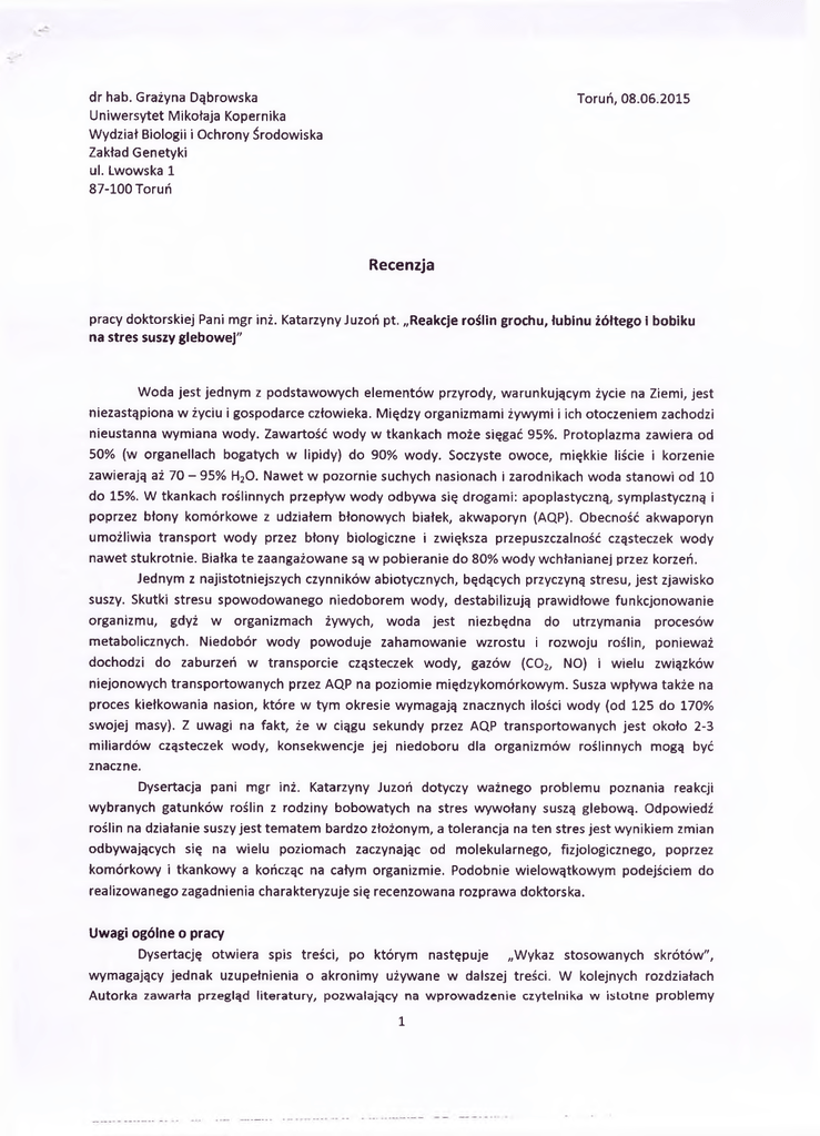 dr hab. Grażyna Dąbrowska Uniwersytet Mikołaja Kopernika Wydział Biologii i Ochrony Środowiska Zakład Genetyki ul. Lwowska 1 87-100 Toruń Toruń, 08.06.2015 Recenzja pracy doktorskiej Pani mgr inż. Katarzyny Juzoń pt. „Reakcje roślin grochu, łubinu żółtego i bobiku na stres suszy glebowej" Woda jest jednym z podstawowych elementów przyrody, warunkującym życie na Ziemi, jest niezastąpiona w życiu i gospodarce człowieka. Między organizmami żywymi i ich otoczeniem zachodzi nieustanna wymiana wody. Zawartość wody w tkankach może sięgać 95%. Protoplazma zawiera od 50% (w organellach bogatych w lipidy) do 90% wody. Soczyste owoce, miękkie liście i korzenie zawierają aż 70 - 95% H20. Nawet w pozornie suchych nasionach i zarodnikach woda stanowi od 10 do 15%. W tkankach roślinnych przepływ wody odbywa się drogami: apoplastyczną, symplastyczną i poprzez błony komórkowe z udziałem błonowych białek, akwaporyn (AQP). Obecność akwaporyn umożliwia transport wody przez błony biologiczne i zwiększa przepuszczalność cząsteczek wody nawet stukrotnie. Białka te zaangażowane są w pobieranie do 80% wody wchłanianej przez korzeń. Jednym z najistotniejszych czynników abiotycznych, będących przyczyną stresu, jest zjawisko suszy. Skutki stresu spowodowanego niedoborem wody, destabilizują prawidłowe funkcjonowanie organizmu, gdyż w organizmach żywych, woda jest niezbędna do utrzymania procesów metabolicznych. Niedobór wody powoduje zahamowanie wzrostu i rozwoju roślin, ponieważ dochodzi do zaburzeń w transporcie cząsteczek wody, gazów (C02, NO) i wielu związków niejonowych transportowanych przez AQP na poziomie międzykomórkowym. Susza wpływa także na proces kiełkowania nasion, które w tym okresie wymagają znacznych ilości wody (od 125 do 170% swojej masy). Z uwagi na fakt, że w ciągu sekundy przez AQP transportowanych jest około 2-3 miliardów cząsteczek wody, konsekwencje jej niedoboru dla organizmów roślinnych mogą być znaczne. Dysertacja pani mgr inż. Katarzyny Juzoń dotyczy ważnego problemu poznania reakcji wybranych gatunków roślin z rodziny bobowatych na stres wywołany suszą glebową. Odpowiedź roślin na działanie suszy jest tematem bardzo złożonym, a tolerancja na ten stres jest wynikiem zmian odbywających się na wielu poziomach zaczynając od molekularnego, fizjologicznego, poprzez komórkowy i tkankowy a kończąc na całym organizmie. Podobnie wielowątkowym podejściem do realizowanego zagadnienia charakteryzuje się recenzowana rozprawa doktorska. Uwagi ogólne o pracy Dysertację otwiera spis treści, po którym następuje „Wykaz stosowanych skrótów", wymagający jednak uzupełnienia o akronimy używane w dalszej treści. W kolejnych rozdziałach Autorka zaw arła przegląd literatury, pozw alający na w prow adzenie czytelnika w istotne problem y 1 związane z przedmiotem pracy, następnie charakterystykę badanego materiału roślinnego, opis zastosowanych metod badawczych oraz wyniki badań i ich dyskusję, kończąc podsumowaniem i wnioskami oraz spisem cytowanej literatury. Na końcu pracy umieszczono streszczenia w języku polskim i angielskim. Wydaje się, że trafniej byłoby umieścić streszczenia na początku rozprawy, ponieważ pozwoliłoby to już na wstępie, czytelnikowi zorientować się o tym co w pracy jest najważniejsze. Recenzowana dysertacja została napisana bardzo starannie i poddana szczegółowej edycji, która była stosunkowo skomplikowana z uwagi na liczne tabele, ryciny i wykresy zawarte w rozprawie. Obejmuje ona 160 stron druku z czego tekst uzupełnia 47 tabel oraz 34 ryciny. W toku wywodu Autorka cytuje 250 pozycji literatury, z czego jedynie co piąta jest dostępna w języku polskim. Niestety Autorka nie ustrzegła się błędów w tytułach cytowanych czasopism czy też danych bibliograficznych (por. Hare P.D., Cress W.A., Van Staden J. 1998. Dissecting the roles of osmolyte accumulation during stress. Plant Celi Chaperones 4: 129-138, powinno być: Hare P.D., Cress W.A., Van Staden J. 1998. Dissecting the roles of osmolyte accumulation during stress. Plant, Celi and Environment 21: 535-553). Część wprowadzająca i wyniki badań Autorka w rozdziale zatytułowanym „Wstęp" dokonała na osiemnastu stronach przeglądu literatury, opisu roślinnego materiału wybranego do badań (trzech gatunków z rodziny bobowatych: grochu siewnego, łubinu żółtego i bobiku) z uwzględnieniem znaczenia gospodarczego tych roślin. Omówiła także zagadnienia stresu suszy glebowej i reakcji roślin na ten czynnik. Wartym podkreślenia jest fakt, że badania prowadzone przez Doktorantkę wiążą się ściśle z ważną kwestią, odnowy produkcji roślin bobowatych w Polsce. Rośliny należące do tej rodziny pełnią w środowisku rolę fitosanitarna i fitomelioracyjną. Ich pozytywne oddziaływanie na środowisko, dzięki zdolności do wiązania azotu atmosferycznego, jest dobrze poznane, odbywa się z udziałem bakterii, organizmów prokariotycznych (a nie organizmów eukariotycznych, jak to napisała Autorka - wydaje mi się że jest to po prostu pomyłka edytorska). Badania zespołu kierowanego przez prof. Janusza Prusińskiego pokazały, że poprzez wprowadzenie do płodozmianu roślin bobowatych możliwe jest znaczne ograniczenie stosowania nawozów sztucznych. Zagadnienie interakcji pomiędzy roślinami a mikroorganizmami ma znaczenie z punktu widzenia rolnictwa zwłaszcza ekologicznego. Rodzina Fabaceae należy do roślin wrażliwych na zmienne warunki środowiskowe (temperatura, opady) i obecność patogenów. Największe zapotrzebowanie na wodę przypada na okres od momentu tworzenia pąków, poprzez proces kwitnienia aż do wykształcenia strąków dlatego też susza może istotnie ograniczać plonowanie. W reakcji roślin na powyższe warunki znaczącą rolę odgrywają mikroorganizmy glebowe. Czy znane są Autorce przykłady badań dotyczących znaczenia mik