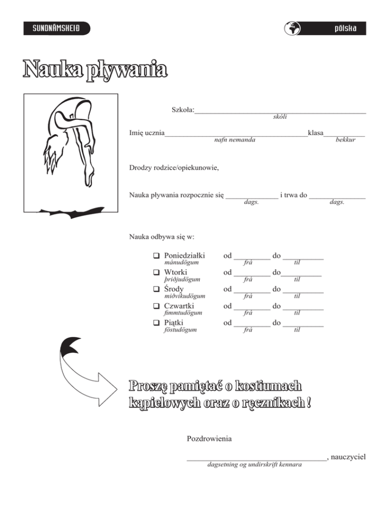 SUNDNÁMSKEIÐ pólska Nauka pływania Szkoła:__________________________________________ skóli Imię ucznia______________________________________klasa___________ nafn nemanda bekkur Drodzy rodzice/opiekunowie, Nauka pływania rozpocznie się ______________ i trwa do _______________ dags. dags. Nauka odbywa się w: q Poniedziałki od _________ do __________ q Wtorki od _________ do__________ q Środy od _________ do __________ q Czwartki od _________ do __________ q Piątki od _________ do __________ mánudögum þriðjudögum miðvikudögum fimmtudögum föstudögum frá frá frá frá frá til til til til til Proszę pamiętać o kostiumach kąpielowych oraz o ręcznikach ! Pozdrowienia ___________________________________, nauczyciel dagsetning og undirskrift kennara