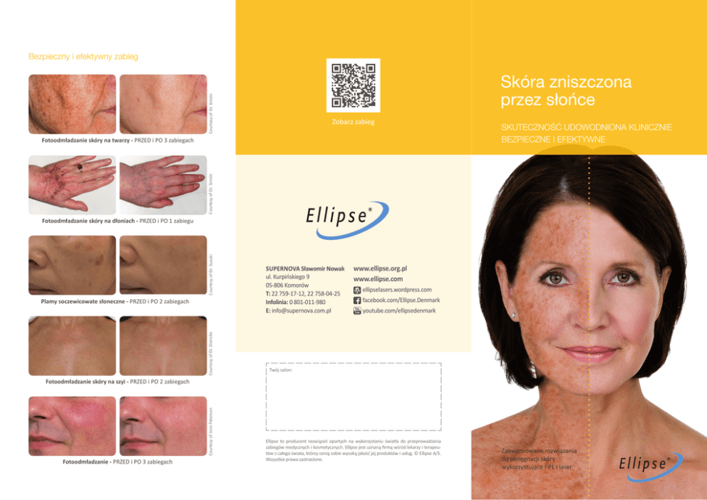 Bezpieczny i efektywny zabieg Courtesy of Dr. Simón Skóra zniszczona przez słońce Zobacz zabieg Courtesy of Dr. Simón Fotoodmładzanie skóry na twarzy - PRZED i PO 3 zabiegach SKUTECZNOŚĆ UDOWODNIONA KLINICZNIE BEZPIECZNE I EFEKTYWNE Courtesy of Dr. Suzuki Fotoodmładzanie skóry na dłoniach - PRZED i PO 1 zabiegu Courtesy of Dr. Dierickx Plamy soczewicowate słoneczne - PRZED i PO 2 zabiegach SUPERNOVA Sławomir Nowak ul. Kurpińskiego 9 05-806 Komorów T: 22 759-17-12, 22 758-04-25 Infolinia: 0 801-011-980 E: [email protected] www.ellipse.org.pl www.ellipse.com ellipselasers.wordpress.com facebook.com/Ellipse.Denmark youtube.com/ellipsedenmark Twój salon: Courtesy of Jens Petersen Fotoodmładzanie skóry na szyi - PRZED i PO 2 zabiegach Fotoodmładzanie - PRZED i PO 3 zabiegach Ellipse to producent rozwiązań opartych na wykorzystaniu światła do przeprowadzania zabiegów medycznych i kosmetycznych. Ellipse jest uznaną firmą wśród lekarzy i terapeutów z całego świata, którzy cenią sobie wysoką jakość jej produktów i usług. © Ellipse A/S. Wszystkie prawa zastrzeżone. Zaawansowane rozwiązania do pielęgnacji skóry wykorzystujące I2PL i laser Większość ludzi pragnie zachować młody i zdrowy wygląd skóry na lata Nie jest to proste, ponieważ nasza skóra starzeje się pod wpływem promieni słonecznych i zmniejszonej produkcji kolagenu. Zabiegi na skórze zniszczonej przez słońce opracowane przez Ellipse (odmładzanie skóry lub fotoodmładzanie) pomagają w zachowaniu młodszego i świeższego wyglądu na dłużej. Jak działa zabieg Ellipse? Zabiegi na skórze zniszczonej przez słońce sprawiają, że skóra staje się bardziej gładka, wszelkie plamy starcze zostają usunięte, a nierówna pigmentacja i rozlane rumienie zlikwidowane. Struktura skóra ulega poprawie, a wiele kobiet twierdzi, że nakładanie makijażu jest dużo łatwiejsze po zabiegu. Zabiegi na twarzy są najbardziej popularne, ale istnieje możliwość poddawania zabiegom wszystkich obszarów ciała. W tym celu krótkie i bezpieczne impulsy światła (technologia I2PL opracowana przez Ellipse, często określana mianem lasera) są kierowane w stronę powierzchni skóry. System filtruje światło, aby zapewnić, że wykorzystywane długości fal są absorbowane przez hemoglobinę w naczyniach krwionośnych oraz przez melaninę w plamach starczych. Podczas poddawania zabiegowi komórek zawierających duże ilości melaniny lub hemoglobiny, docelowe naczynie ulega podgrzaniu i zniszczeniu w czasie zaledwie kilku tysięcznych sekundy. Czy mogę poddać się temu zabiegowi? Zabiegi są bardzo skuteczne u pacjentów z jasną karnacją i bez opalenizny w trakcie przeprowadzania zabiegu. Jeśli skóra jest mniej opalona, kontrast pomiędzy plamami starczymi, naczyniami krwionośnymi a kolorem pozostałej powierzchni skóry jest większy, co z kolei ułatwia przeprowadzanie zabiegu. Niemniej specjaliści Ellipse opracowali fabryczne ustawienia dla różnych typów skóry, które pozwalają na wykorzystanie odpowiedniej ilości energii dla konkretnej karnacji. Jak długo trwa zabieg Ellipse? Pełen zabieg na twarzy zajmuje mniej niż 20 minut. Poprawę zazwyczaj widać już po pierwszym zabiegu, jednak do osiągnięcia pełnego efektu zaleca się przeprowadzenie trzech sesji zabiegowych. Czy zabieg jest bolesny? Żadne środki znieczulające nie są wymagane, a większość pacjentów opisuje zabieg jako praktycznie bezbolesny, przypominający pstryknięcie z „gumki-recepturki”, po którym występują odczucia podobne do delikatnego ciepła po dniu spędzonym na plaży. Czy konieczne są specjalne środki ostrożności przed i po zabiegu? Światło wykorzystywane podczas zabiegu jest w pełni bezpieczne. Niemniej należy unikać opalania się (na słońcu, w solarium lub stosowania środków samoopalających) przed oraz po okresie zabiegowym. W przeciwnym razie opalona skóra absorbuje więcej światła, a to z kolei sprawia, że zabieg jest mniej skuteczny i bardziej bolesny. Ogólnie żadna specjalna pielęgnacja nie jest konieczna po zabiegu, jednak osoby z wrażliwą skórę mogą stosować na twarzy zimny kompres natychmiast po zabiegu lub korzystać ze specjalnej maści przepisanej przez lekarza. Po zabiegu nie powinno się wystawiać skóry na oddziaływanie promieni słonecznych przez 30 dni, nawet jeśli nie ma żadnych objawów zapalenia na obszarze poddawanym zabiegowi. Korzystaj z ochrony przeciwsłonecznej (co najmniej SPF 30), jeśli unikanie słońca nie jest możliwe. Czego mogę się spodziewać? Przez kilka dni po zabiegu skóra może sprawiać wrażenie lekko „przybrudzonej”. Jednak po tym czasie skóra będzie wyraźniej gładsza i świeższa w wyglądzie. Aby zachować młodzieńczy wygląd, zaleca się przeprowadzanie 1–2 zabiegów podtrzymujących w ciągu roku. Czy zabiegi Ellipse są naprawdę bezpieczne i skuteczne? Badania kliniczne dokumentujące bezpieczeństwo i skuteczność sprzętu Ellipse zostały przeprowadzone przez czołowych lekarzy przed wprowadzeniem produktu na rynek, a wyniki tych badań opublikowano w szanowanych dziennikach medycznych. Zachęcamy do zapoznania się z tymi artykułami, które można znaleźć na stronie internetowej Ellipse – www.ellipse.com.