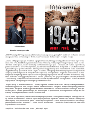 Adriana Siess Kronika końca i początku „1945 Wojna i pokój” to poruszające historie interesującego czasu „pomiędzy”, możliwość podążania tropami szarego człowieka zawieszonego w dwóch rzeczywistościach - końca wojny i początku pokoju. Autorka oddaje głos żyjącym świadkom tego przeistoczenia, którzy pozwalają odbiorcom wcielić się w everymana roku 1945. Pooddychać gruzem zrujnowanej Warszawy, rozkręcać pierwszy powojenny biznes na wrocławskim szaber-placu, kluczyć pomiędzy resztkami minionego życia i z mniejszą lub większą wytrwałością próbować zbudować nowe. Obiektywizmu, autentyczności i siły historiom dodaje fakt, że Grzebałkowska nie ograniczyła się do opowieści Polaków. Z równą starannością portretuje życie przesiedlanych rodzin niemieckich czy przybliża losy żydowskich sierot. Książka to kronika pełna perypetii ludzi zaplątanych w trudny moment dziejowy, kiedy na zgliszczach dawnych wartości powstają nowe potrzeby i pragnienia. Nie skupia się na militarnym czy martyrologicznym aspekcie czasów wojny a jej obyczajowym obliczu. Starannie dokumentuje fakty, które skutecznie uciekają podręcznikom do historii - przeprawę 500 tysięcy ludzi przez zamarznięty na kość Zalew Wiślany, storpedowanie statku Wilhelm Gustloff czy okrucieństwa dokonywane na Niemcach (wtedy zapisywanych z małej litery) w obozie pracy w Łambinowicach. „Wojna i pokój” to studium samotności. Co robią zagubieni, cudem ocaleni ludzie, wracając w ruinę rodzinnych stron? Szukają bliskich. Piszą kredą na domach, że właśnie tam się zatrzymali. Rozpaczliwie próbują odnaleźć swoje dzieci. Płacą tym, którzy są gotowi zaoferować im informację o ostatnich chwilach krewnego. Albo publicznie proszą o zwrot uprowadzonego psa, bo to jedyne, co pozostało im po okropieństwach wojny. Bo nikt w nową, niejasną rzeczywistość nie chce wchodzić sam. Mocną stroną reportażu są także maleńkie historyjki poutykane w „dział ogłoszeń drobnych” opatrujących każdy rozdział. Grzebałkowska odwołała się do tradycji polskiego reportażu, umieszczając w książce autentyczne skany z prasy dystrybuowanej w epoce. Drobne wycinki prasowe czasem wywoływały uśmiech, reklamując przedwojenne cukierki, a czasem - „Oddam dziecko w dobre ręce...” - niosły ból. Kontrastowe jak samo życie w powojennej rzeczywistości. Magdalena Grzebałkowska 1945. Wojna i pokój wyd. Agora