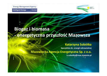 Biogaz i biomasa - energetyczna przyszłość Mazowsza Katarzyna Sobótka Specjalista ds. energii odnawialnej Mazowiecka Agencja Energetyczna Sp. z o.o. [email protected] Biomasa • Stałe i ciekłe substancje pochodzenia roślinnego i zwierzęcego , pochodzące z produktów, odpadów i pozostałości produkcji rolnej oraz leśnej i przemysłu przetwarzającego ich produkty. Możliwości wykorzystania biomasy • W procesach bezpośredniego spalania np. drewno czy słoma. • Przetworzone na paliwa ciekłe np. estry oleju rzepakowego, alkohol. • Przetworzone na paliwo gazowe np. biogaz rolniczy, biogaz z oczyszczalni ścieków, gaz wysypiskowy. Zasoby biomasy stałej • • • • • Biomasa z lasów Biomasa z sadów Drewno odpadowe z dróg Słoma Rośliny energetyczne Słoma i biomasa drzewna • Wykorzystanie biomasy drzewnej dla kotłów indywidualnych lub mniejszych instalacji (dotyczy to zwłaszcza biomasy odpadowej, np. z sadów). • Wytwarzanie znacznej ilość słomy, jednakże jest ona w większości zużywana w rolnictwie. • W przyszłości biomasa będzie miała największy udział wśród paliw odnawialnych (systemy grzewcze, małe instalacje domowe). 5 Biopaliwa • Mazowsze posiada znaczny potencjał produkcji bioetanolu (jeden z wiodących regionów w Polsce). • Możliwości uprawy rzepaku do produkcji biodiesla ograniczają się do północno-zachodniej części województwa. • Dalszy rozwój zależny będzie od cen rynkowych i konkurencji pomiędzy różnymi typami produktów rolniczych (żywność, biopaliwa stałe, biopaliwa ciekłe). • Można się spodziewać utworzenie regionalnych systemów dystrybucji biopaliw dla transportu 6 publicznego. Biogaz • Biogaz - to mieszanina gazowa powstająca w procesie fermentacji beztlenowej, składająca się głównie z metanu (50-75%) i dwutlenku węgla (25-45%), a także śladowych ilości innych gazów w postaci siarkowodoru, azotu, tlenu i wodoru. Biomasa Masa pofermentacyjna 7 Substraty Rolnicze - odchody zwierząt, - odpady z hodowli roślin, - odpady ogrodnicze i ścinki traw, - Odpady organiczne z obiektów komunalnych i gospodarstw domowych, - uprawy energetyczne. Przemysłowe odpady z przemysłu: - spożywczego, - mleczarskiego, - cukrowniczego, - mięsnego, - …. - Osady ściekowe - Składowiska odpadów 8 Biogaz rolniczy • Mazowsze posiada jeden z najwyższych potencjałów biogazu rolniczego w Polsce ze względu na rolnictwo. • Ten potencjał nie jest obecnie wykorzystywany (podobnie zresztą jak na całym obszarze Polski). Oczekuje się znacznego wzrostu jego wkładu w przyszły bilans energii pierwotnej (ciepło, energia elektryczna i paliwo). • Głównymi barierami rozwojowymi mogą okazać się: problemy z możliwościami przyłączenia na obszarach wiejskich (zły stan techniczny sieci), zagospodarowanie pofermentu oraz uwarunkowania ekonomiczne. • Należy poprzeć rozwój biogazowni na obszarach wiejskich, tworzenie grup producenckich w celu zwiększenia mocy instalacji, i możliwości 9 użytkowania biogazu do celów transportowych. Biogaz wysypiskowy • Około 75 składowisk odpadów komunalnych • Ze względu na brak uszczelnień możliwe do pozyskania zasoby to 30-45% całkowitego potencjału biogazu. • Wykorzystanie: produkcja ciepła i energii elektrycznej w kogeneracji. Biogaz z osadów ściekowych • Ponad 500 oczyszczalni ścieków • Najbardziej efektywne przy oczyszczalniach biologicznych • Uzasadnione dla oczyszczalni ścieków: 8-10 tyś m3/dobę • Większość energii wykorzystywana na potrzeby własne ze względu na duże zapotrzebowanie energetyczne oczyszczalni ścieków. Dobre przykłady • • • • • • • Elektrociepłownia na biomasę w Płońsku Zrębki drzewne 25 tys. ton biomasy – 800 ha areału 10.2 MW 2.1 MWel Unikniona emisja CO2: 35 000 Mg/r Modernizacja sieci ciepłowniczej Dobre przykłady • • • • Kotłownia zrębkowa w Łącku Odpady drzewne: biomasa z dróg 1.2 MW Ogrzewanie budynków gminnych Dobre przykłady • Przydomowe kotły na pellet, • Koszt około 7000 zł • Dla domku o powierzchni 230 m2, Kocioł o mocy 25 kW zużywa średnio 3-5 ton paliwa • Koszt pelletu: 600 – 800 zł/tona Dobre przykłady • • • • Biogaz z oczyszczalni ścieków Lokalizacja: Siedlce Moc: 0,4 MW Produkcja: – Energia elektryczna: 1,15 GWh/rok – Energia cieplna: 3 GWh/rok – Ilość wyprodukowanego biogazu: 676 m3/rok • Cel: ogrzewanie, energia elektryczna • Poradnik: Biogaz rolniczy – produkcja i wykorzystanie • Kalkulator biogazowy narzędzie do szacowania produkcji biogazu i ekonomiki projektu biogazowego • www.mae.mazovia.pl 16 Kalkulator biogazowy Kalkulator biogazowy narzędzie do szacowania produkcji biogazu i ekonomiki projektu biogazowego www.mae.mazovia.pl Dziękuję za uwagę Mazowiecka Agencja Energetyczna Sp. z o.o. www.mae.mazovia.pl ul. Świętokrzyska 36 lok. 40 00-116 WARSZAWA 19