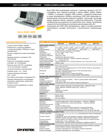 OSCYLOSKOPY CYFROWE 100MHz/60MHz/40MHz/25MHz Seria GDS-1000 oscyloskopów cyfrowych z kolorowym ekranem LCD TFT o przekątnej 14cm obejmuje przyrządy o paśmie 25MHz, 40MHz, 60MHz i 100MHz. Z pamięcią o długości 4000 punktów i częstością próbkowania w czasie ekwiwalentnym 25GSa/s oscyloskopy GDS-1000 zapewniają doskonałą jakość odwzorowania badanych sygnałów, zachowując równowagę między długością rekordu rejestracji i szybkością próbkowania. Przyrządy charakteryzują się przyjaznym dla użytkownika menu obsługi, kompaktową i ergonomiczną konstrukcją oraz pamięcią wykorzystującą karty SD. Oscyloskopy serii GDS-1000 zaprojektowano, mając na uwadze spełnienie najostrzejszych wymagań technicznych i ekonomicznych współczesnego rynku. Seria GDS-1000 CHARAKTERYSTYKA * 2 kanały, pasmo 25MHz~100MHz * Próbkowanie z częstością 250MSa/s w czasie rzeczywistym i 25GSa/s w czasie ekwiwalentnym * Pamięć o długości 4k punktów dla każdego kanału * Detekcja impulsów o szerokości 10ns (Peak Detect) * Pamięć do 15 kompletów ustawień przyrządu i do 15 przebiegów * Kolorowy ekran LCD TFT o przekątnej 14 cm we wszystkich modelach DANE TECHNICZNE GDS-1022 GDS-1042 GDS-1062 GDS-1102 ODCHYLANIE PIONOWE 2 2 2 2 Ilość kanałów DC~25MHz (-3dB) DC~40MHz (-3dB) DC~60MHz (-3dB) DC~100MHz (-3dB) Pasmo około <14ns około <8,75ns około <5,8ns około <3,5ns Czas narastania Czułość 2mV/dz~5V/dz (w sekwencji 1-2-5 wartości) Dokładność ± (3% x odczyt + 0,1dz + 1mV) Sprzężenie wejścia AC, DC, GND Impedancja wejściowa 1MΩ ±2% // 16pF Polaryzacja normalna lub odwrócona (invert) Napięcie wejściowe maksymalnie 300V (DC + ACpeak), kategoria instalacyjna II Przetwarzanie sygnałów +, −, transformata FFT Zakres składowej stałej 2mV/dz~50mV/dz: ±0,4V; 10mV/dz~500mV/dz: ±4V; 1V/dz~5V/dz: ±40V Ogranicznik pasma 20MHz (-3dB) UKŁAD WYZWALANIA Źródło wyzwalania Tryby wyzwalania * 19 różnych pomiarów automatycznych * Podstawa czasu: 1ns ~ 10s/dz Sprzężenie * Czułość odchylania pionowego: 2mV ~ 5V/dz Czułość * Port USB do komunikacji z komputerem PC * Operacje matematyczne na przebiegach: sumowanie, odejmowanie, szybka transformata Fouriera * 6-cyfrowy licznik częstotliwości w czasie rzeczywistym CH1, CH2, Line, EXT Auto–Level (auto z regulacją poziomu), AUTO, Normal, Single (w. jednorazowe), TV, Edge (w. zboczem) AC, DC, LF (filtr górnoprzepustowy), HF (filtr dolnoprzepustowy), Noise Rej. (redukcja szumu) około 0,5 działki lub 5mV w paśmie DC~25MHz około 1,5 działki lub 15mV w paśmie 25MHz~40/60/100MHz WYZWALANIE ZEWNĘTRZNE (EXT) Poziom sygnału ±15V Czułość ~50mV w paśmie DC~25MHz; ~100mV w paśmie 25MHz~40/60/100MHz Impedancja wejściowa 1MΩ ±2% // 16pF Napięcie wejściowe maksymalnie 300V (DC+ACpeak), kategoria instalacyjna II ODCHYLANIE POZIOME Podstawa czasu Tryby pracy Dokładność Przedwyzwalanie Powyzwalanie 1ns/dz~10s/dz (w sekwencji 1-2-5 wartości); ROLL: 250ms/dz~10s/dz MAIN, WINDOW, WINDOW ZOOM, ROLL, SCAN. X-Y ±0,01% maksimum 10 działek 1000 działek TRYB X-Y Sygnał osi X Sygnał osi Y Przesunięcie fazy kanał 1 (CH1) kanał 2 (CH2) ±3° przy 100kHz UKŁAD AKWIZYCJI Real-time częstość próbkowania w czasie rzeczywistym: maksimum 250MSa/s Equivalent częstość próbkowania w czasie ekwiwalentnym: maksimum 25GSa/s Rozdzielczość pionowa 8 bitów Rekord rejestracji maksimum 4000 punktów Tryby akwizycji Normal, Peak Detect (detekcja szczytowa), Average (uśrednianie) Detekcja szczytowa wykrywanie impulsów o czasie trwania min. 10ns (500ns/dz~10s/dz) Uśrednianie (average) Ilość okresów wykorzystywanych do uśredniania: 2, 4, 8, 16, 32, 64, 128, 256 KURSORY I POMIARY AUTOMATYCZNE Pomiary napięciowe Vpp, Vamp, Vavg, Vrms, Vhi, Vlo, Vmax, Vmin, przedrost/przerost zbocza narastającego i opadającego Pomiary czasowe częstotliwość, okres, czas narastania i opadania, długość dodatniego odcinka przebiegu, długość ujemnego odcinka przebiegu, współczynnik wypełnienia różnica napięcia (∆V) między kursorami, różnica czasu (∆T) między kursorami Pomiary kursorowe rozdzielczość: 6 cyfr; dokładność: ±2%; Automatyczny źródło sygnału: wszystkie sygnały wyzwalające z wyjątkiem sygnału TV częstościomierz FUNKCJE DODATKOWE Samonastawność (Autoset) Pamięć ustawień Pamięć przebiegów automatyczne ustawienie czułości odchylania pionowego (Volts/Div), podstawy czasu (Time/Div) i poziomu wyzwalania (Level) możliwość zapamiętania do 15 kompletów ustawień oscyloskopu możliwość zapamiętania do 15 przebiegów Ścianka tylna Seria GDS-1000 DANE TECHNICZNE GDS-1022 EKRAN Matryca LCD TFT Rozdzielczość Siatka współrzędnych Jaskrawość ekranu INTERFEJSY Złącze USB (slave) GDS-1042 GDS-1062 GDS-1102 Moduł szkoleniowy GDB-02 do nauki obsługi i testów oscyloskopów Dla oscyloskopów serii: GDS-2000/1000/800 przekątna 14cm 234 (pionowo) x 320 (poziomo) punktów 8x10 działek regulowana Czytnik kart SD kompatybilność ze standardem USB1.1 i 2.0 (nie obsługuje drukarki i pamięci typu flash disk) przechowywanie plików obrazowych (BMP) lub danych przebiegu (CSV) ZASILANIE Zakres napięcia sieci 100V~240V, 48Hz~63Hz, ustawienie automatyczne FUNKCJE INTERFEJSU UŻYTKOWNIKA Menu wielojęzyczne dostępne Pomoc ekranowa dostępna WYMIARY i WAGA 310(Sz.) x 142(Wys.) x 140(Gł.)mm, około 2,5kg INFORMACJE DLA ZAMAWIAJĄCYCH GDS-1022 – oscyloskop cyfrowy 25MHz, 2 kanały, kolorowy ekran LCD GDS-1042 – oscyloskop cyfrowy 40MHz, 2 kanały, kolorowy ekran LCD GDS-1062 – oscyloskop cyfrowy 60MHz, 2 kanały, kolorowy ekran LCD GDS-1102 – oscyloskop cyfrowy 100MHz, 2 kanały, kolorowy ekran LCD WYPOSAŻENIE STANDARDOWE: Instrukcja obsługi, kabel zasilający GTP-060A-2 : pasywna sonda pomiarowa 60MHz z przełączanym tłumieniem (10:1/1:1) dla modeli GDS-1022/1042/1062 (jedna na każdy kanał) GTP-100A : pasywna sonda pomiarowa 100MHz z przełączanym tłumieniem