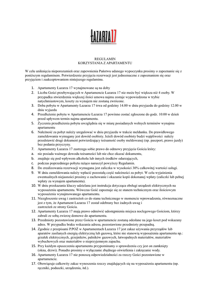 REGULAMIN KORZYSTANIA Z APARTAMENTU W celu uniknięcia nieporozumień oraz zapewnienia Państwu udanego wypoczynku prosimy o zapoznanie się z poniższym regulaminem. Potwierdzenie przyjęcia rezerwacji jest jednoznaczne z zapoznaniem się oraz przyjęciem i zaakceptowaniem niniejszego regulaminu. 1. Apartamenty Łazarza 17 wynajmowane są na doby 2. Liczba Gości przebywających w Apartamencie Łazarza 17 nie może być większa niż 4 osoby. W 3. 4. 5. 6. 7. a. b. c. 8. 9. 10. 11. 12. 13. 14. 15. 16. 17. przypadku stwierdzenia większej ilości umowa najmu zostaje wypowiedzona w trybie natychmiastowym, koszty za wynajem nie zostaną zwrócone. Doba pobytu w Apartamenty Łazarza 17 trwa od godziny 14.00 w dniu przyjazdu do godziny 12.00 w dniu wyjazdu Przedłużenie pobytu w Apartamencie Łazarza 17 powinno zostać zgłoszone do godz. 10:00 w dzień przed upływem termin najmu apartamentu. Życzenia przedłużenia pobytu uwzględnia się w miarę posiadanych wolnych terminów wynajmu apartamentu Należność za pobyt należy uregulować w dniu przyjazdu w trakcie meldunku. Do prawidłowego zameldowania wymagany jest dowód osobisty. Jeżeli dowód osobisty budzi wątpliwości należy przedstawić drugi dokument potwierdzający tożsamość osoby meldowanej (np. paszport, prawo jazdy) bez podania przyczyny. Apartamenty Łazarza 17 zastrzega sobie prawo do odmowy przyjęcia Gościa który: nie posiada ważnego dowodu tożsamości lub nie chce okazać dokumentu, znajduje się pod wpływem alkoholu lub innych środków odurzających, podczas poprzedniego pobytu rażąco naruszył powyższy Regulamin. Do zrealizowania rezerwacji wymagana jest zaliczka w wysokości 30% całkowitej wartości usługi. W dniu zameldowania należy wpłacić pozostałą część należności za pobyt. W celu wyjaśnienia ewentualnych niejasności prosimy o zachowanie i okazanie kopii dokonanej wpłaty (zaliczki lub pełnej wpłaty za wynajem apartamentu). W dniu przekazania kluczy udzielana jest instrukcja dotycząca obsługi urządzeń elektrycznych na wyposażeniu apartamentu. Wówczas Gość zapoznaje się ze stanem technicznym oraz ilościowym wyposażenia wynajmowanego apartamentu. Niezgłoszenie uwag i zastrzeżeń co do stanu technicznego w momencie wprowadzenia, równoznaczne jest z tym, że Apartament Łazarza 17 został odebrany bez żadnych uwag i zastrzeżeń ze strony Gościa. Apartamenty Łazarza 17 mają prawo odmówić udostępnienia miejsca noclegowego Gościom, którzy zabrali ze sobą zwierzę domowe do apartamentu. Przedmioty pozostawione przez Gościa w apartamencie zostaną odesłane na jego koszt pod wskazany adres. W przypadku braku wskazania adresu, pozostawione przedmioty przepadną. Zgodnie z przepisami P.POŻ w Apartamentach Łazarza 17 jest zakaz używania przyrządów lub aparatów zasilanych energią elektryczną lub gazową, które nie stanowią wyposażenia apartamentu np.: grzałek elektrycznych, grzejników, palników gazowych, łatwopalnych materiałów, materiałów wybuchowych oraz materiałów o nieprzyjemnym zapachu. Przy każdym opuszczeniu apartamentu przypominamy o sprawdzeniu czy jest on zamknięty (okna, drzwi). Ponadto prosimy o wyłączanie zbędnego oświetlenia i zakręcanie wody. Apartamenty Łazarza 17 nie ponoszą odpowiedzialności za rzeczy Gości pozostawione w apartamencie. Obowiązuje całkowity zakaz wynoszenia rzeczy znajdujących się na wyposażeniu apartamentu (np. ręczniki, poduszki, urządzenia, itd.). 18. W Apartamencie obowiązuje całkowity zakaz palenia tytoniu i zapalania świeczek. 19. Cisza nocna obowiązuje od godz. 22:00 do 6:00 Gość nie przestrzegający tej zasady może zostać poproszony o opuszczenie apartamentu. 20. W przypadku interwencji Policji bądź Straży Miejskiej Apartamenty Łazarza 17 nałożą karę w wysokości 500,00 zł. 21. Gość który umyślnie lub przez przypadek zniszczy przedmiot znajdujący się na wyposażeniu 22. 23. 24. 25. 26. 27. 28. apartamentu zostanie obciążony kosztami naprawy lub będzie zobowiązany pokryć w całości zaistniałe koszty. Gość odpowiada również za wszystkie zniszczenia wynikłe z zachowania osób trzecich przebywających w apartamencie oraz jego Gości. W dniu wyjazdu wraz ze zdaniem kluczy nastąpi przekazanie stanu technicznego oraz ilościowego wyposażenia wynajmowanego apartamentu. Dopiero wówczas Gość ma prawo opuścić apartament. Wszelkie roszczenia w sprawie ewentualnych zniszczeń zweryfikowanych przy odbiorze apartamentu przez Gościa , będą dochodzone na drodze sądowej. W przypadku rażącego złamania zasad niniejszego regulamin u usługa wynajmu apartamentu może być wypowiedziana w trybie natychmiastowym, czego skutkiem będzie konieczność opuszczenia przez Gościa wynajmowanego apartamentu. Wcześniejszy wyjazd Gościa , z przyczyn niezależnych, nie uprawnia go do zwrotu opłaty za niewykorzystany pobyt. W przypadku zagubienia kluczy do apartamentu Gość zostanie obciążony kosztami w wysokości 490,00 zł. Dane osobowe będą przetwarzane przez Apartamenty Łazarza 17 wyłącznie w celu realizacji rezerwacji, ułatwienia dokonywania kolejnych rezerwacji oraz celach marketingowych (np. przesyłanie informacyjnego newslettera pocztą elektroniczną) zgodnie z przepisami ustawy z dnia 29.08.2007 r. o ochronie danych osobowych. Rezerwującemu przysługuje prawo wglądu do swoich danych osobowych i ich aktualizacji. Prosimy o natychmiastowe poinformowanie nas jeśli dojdzie do jakiegoś nieporozumienia bądź nie będą Państwo zadowoleni z naszych usług. Dołożymy wszelkich starań aby dokładnie zbadać problem i rozwiązać go. Prosimy o stosowanie się regulaminu i życzymy miłego pobytu. Oświadczam, że zapoznałem/łam się z powyższym regulaminem korzystania z Apartamentów Łazarza 17. Data: ………………………………………. Podpis: ……………………………………………………