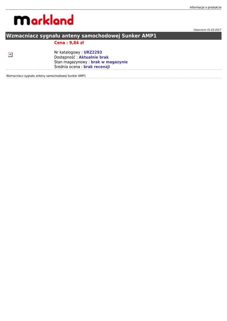 Informacje o produkcie Utworzono 01-03-2017 Wzmacniacz sygnału anteny samochodowej Sunker AMP1 Cena : 9,84 zł Nr katalogowy : URZ2293 Dostępność : Aktualnie brak Stan magazynowy : brak w magazynie Średnia ocena : brak recenzji Wzmacniacz sygnału anteny samochodowej Sunker AMP1