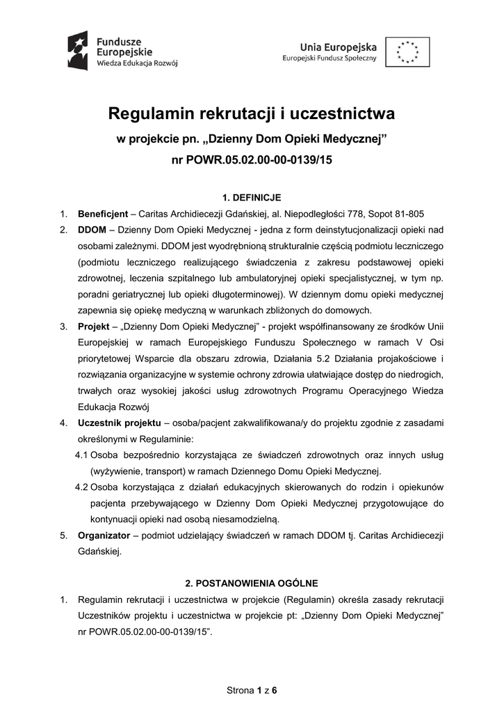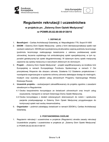 Regulamin rekrutacji i uczestnictwa w projekcie pn. „Dzienny Dom Opieki Medycznej” nr POWR.05.02.00-00-0139/15 1. DEFINICJE 1. Beneficjent – Caritas Archidiecezji Gdańskiej, al. Niepodległości 778, Sopot 81-805 2. DDOM – Dzienny Dom Opieki Medycznej - jedna z form deinstytucjonalizacji opieki nad osobami zależnymi. DDOM jest wyodrębnioną strukturalnie częścią podmiotu leczniczego (podmiotu leczniczego realizującego świadczenia z zakresu podstawowej opieki zdrowotnej, leczenia szpitalnego lub ambulatoryjnej opieki specjalistycznej, w tym np. poradni geriatrycznej lub opieki długoterminowej). W dziennym domu opieki medycznej zapewnia się opiekę medyczną w warunkach zbliżonych do domowych. 3. Projekt – „Dzienny Dom Opieki Medycznej” - projekt współfinansowany ze środków Unii Europejskiej w ramach Europejskiego Funduszu Społecznego w ramach V Osi priorytetowej Wsparcie dla obszaru zdrowia, Działania 5.2 Działania projakościowe i rozwiązania organizacyjne w systemie ochrony zdrowia ułatwiające dostęp do niedrogich, trwałych oraz wysokiej jakości usług zdrowotnych Programu Operacyjnego Wiedza Edukacja Rozwój 4. Uczestnik projektu – osoba/pacjent zakwalifikowana/y do projektu zgodnie z zasadami określonymi w Regulaminie: 4.1 Osoba bezpośrednio korzystająca ze świadczeń zdrowotnych oraz innych usług (wyżywienie, transport) w ramach Dziennego Domu Opieki Medycznej. 4.2 Osoba korzystająca z działań edukacyjnych skierowanych do rodzin i opiekunów pacjenta przebywającego w Dzienny Dom Opieki Medycznej przygotowujące do kontynuacji opieki nad osobą niesamodzielną. 5. Organizator – podmiot udzielający świadczeń w ramach DDOM tj. Caritas Archidiecezji Gdańskiej. 2. POSTANOWIENIA OGÓLNE 1. Regulamin rekrutacji i uczestnictwa w projekcie (Regulamin) określa zasady rekrutacji Uczestników projektu i uczestnictwa w projekcie pt: „Dzienny Dom Opieki Medycznej” nr POWR.05.02.00-00-0139/15”. Strona 1 z 6 2. Szczegółowe zasady organizacji i funkcjonowania Dziennego Domu Opieki Medycznej wyodrębnionego strukturalnie, będącego częścią podmiotu leczniczego Centrum Pomocowego im. św. Jana Pawła II w Gdańsku powołanym przez Caritas Archidiecezji Gdańskiej, a także zasady i warunki korzystania z DDOM określa Regulamin Organizacyjny Dziennego Domu Opieki Medycznej Caritas Archidiecezji Gdańskiej. 3. WARUNKI UCZESTNICTWA W PROJEKCIE 1. Projekt w zakresie bezpośredniego korzystania ze świadczeń zdrowotnych oraz innych usług (wyżywienie, transport) w ramach Dziennego Domu Opieki Medycznej skierowany jest do osób spełniających łącznie następujące warunki: 1.1 są mieszkańcami województwa pomorskiego, w szczególności w wieku pow. 65 roku życia (weryfikacja na podstawie dowodu tożsamości oraz formularza zgłoszeniowego), 1.2 zamierzają skorzystać ze świadczeń DDOM bezpośrednio po przebytej hospitalizacji lub w okresie ostatnich 12 miesięcy korzystali z świadczeń zdrowotnych z zakresu leczenia szpitalnego (weryfikacja na podstawie wypisu ze szpitala), 1.3 ich stan zdrowia wskazuje na niesamodzielność (weryfikacja na podstawie oceny dokonanej przez lekarza kierującego wg skali Barthel: 40-65 punktów), 1.4 nie są wyłączeni z możliwości z otrzymania wsparcia w DDOM (wyłączenie: osoby korzystające ze świadczeń w ramach opieki długoterminowej, paliatywnej i hospicyjnej oraz rehabilitacji leczniczej -oddział dzienny lub stacjonarny; gdy wskazaniem jest zaawansowana choroba psychiczna lub uzależnienie) (weryfikacja na podstawie składanego w deklaracji oświadczenia), 1.5 wymagają wzmożonej opieki pielęgniarskiej, nadzoru nad terapią farmakologiczną kompleksowych działań usprawniających i przeciwdziałających postępującej niesamodzielności oraz wsparcia i edukacji zdrowotnej, a także doradztwa w zakresie organizacji opieki i leczenia osoby niesamodzielnej (weryfikacja na podstawie skierowania do DDOM wydanego przez lekarza POZ lub lekarza ubezpieczenia zdrowotnego udzielającego świadczeń w szpitalu) 1.6 mają prawo do świadczeń opieki zdrowotnej finansowanych ze środków publicznych (Dz. U. z 2008 r. Nr 164, poz. 1027, z późn. zm.) (weryfikacja na podstawie składanego w deklaracji w systemie EWUŚ). Strona 2 z 6 oświadczenia i/lub weryfikacja 2. Projekt w zakresie działań edukacyjnych (5 spotkań 5-godz, łącznie 25 h x 4 edycje) skierowanych do rodzin i opiekunów pacjenta przebywającego w Dzienny Dom Opieki Medyczne przygotowujące do kontynuacji opieki nad osobą niesamodzielną, skierowany jest do osób będących członkiem rodziny pacjenta przebywającego w Dzienny Dom Opieki Medycznej i/lub pełniących rolę faktycznego opiekuna pacjenta przebywającego w Dzienny Dom Opieki Medycznej. 3. Uczestnikiem projektu w zakresie wskazanym w pkt 3 ppkt.1 może być osoba (kobieta, mężczyzna), która spełnia kryteria, o których mowa pkt. 3 ppkt. 1 ustęp 1-1.6 oraz przedłoży wymagane dokumenty określone pkt. 3 ppkt. 6 ustęp 6.1-6.7, na podstawie których zostanie zakwalifikowana do udziału w Projekcie. 4. Uczestnikiem projektu w zakresie wskazanym w pkt 3 ppkt.2 może być osoba (kobieta, mężczyzna), która spełnia kryteria, o których mowa pkt. 3 ppkt. 2 oraz przedłoży wymagane dokumenty określone pkt. 3 ppkt. 7 ustęp 7.1-7.3, na podstawie których zostanie zakwalifikowana do udziału w Projekcie. 5. Wzory wymaganych dokumentów są dostępne na stronie internetowej Beneficjenta oraz w placówce Beneficjenta tj. Centrum Pomocowym Caritas im. Jana Pawła II ul. Fromborska 24 w Gdańsku. 6. W zakresie wskazanym w pkt 3 ppkt.1 wymagane dokumenty rekrutacyjne obejmują: 6.1 Oświadczenie uczestnika projektu (załącznik nr 1); 6.2 Formularz zgłoszeniowy (załącznik nr 2); 6.3 Deklarację uczestnictwa w projekcie (załącznik nr 3); 6.4 Kopię dokumentu tożsamości potwierdzającą miejsce zamieszkania; 6.5 Kopię karty informacyjnej/wypisu ze szpitala nie s