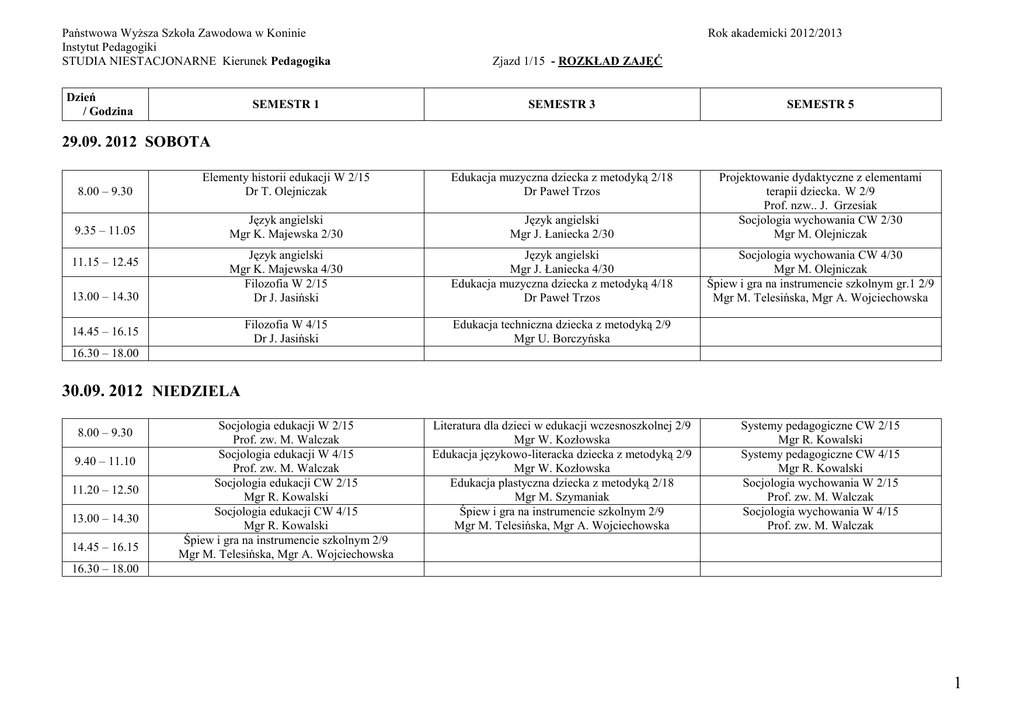 Państwowa Wyższa Szkoła Zawodowa w Koninie Instytut Pedagogiki STUDIA NIESTACJONARNE Kierunek Pedagogika Dzień / Godzina Rok akademicki 2012/2013 Zjazd 1/15 - ROZKŁAD ZAJĘĆ SEMESTR 1 SEMESTR 3 SEMESTR 5 8.00 – 9.30 Elementy historii edukacji W 2/15 Dr T. Olejniczak Edukacja muzyczna dziecka z metodyką 2/18 Dr Paweł Trzos 9.35 – 11.05 Język angielski Mgr K. Majewska 2/30 Język angielski Mgr J. Łaniecka 2/30 Projektowanie dydaktyczne z elementami terapii dziecka. W 2/9 Prof. nzw.. J. Grzesiak Socjologia wychowania CW 2/30 Mgr M. Olejniczak Język angielski Mgr K. Majewska 4/30 Filozofia W 2/15 Dr J. Jasiński Język angielski Mgr J. Łaniecka 4/30 Edukacja muzyczna dziecka z metodyką 4/18 Dr Paweł Trzos Socjologia wychowania CW 4/30 Mgr M. Olejniczak Śpiew i gra na instrumencie szkolnym gr.1 2/9 Mgr M. Telesińska, Mgr A. Wojciechowska Filozofia W 4/15 Dr J. Jasiński Edukacja techniczna dziecka z metodyką 2/9 Mgr U. Borczyńska Socjologia edukacji W 2/15 Prof. zw. M. Walczak Socjologia edukacji W 4/15 Prof. zw. M. Walczak Socjologia edukacji CW 2/15 Mgr R. Kowalski Socjologia edukacji CW 4/15 Mgr R. Kowalski Śpiew i gra na instrumencie szkolnym 2/9 Mgr M. Telesińska, Mgr A. Wojciechowska Literatura dla dzieci w edukacji wczesnoszkolnej 2/9 Mgr W. Kozłowska Edukacja językowo-literacka dziecka z metodyką 2/9 Mgr W. Kozłowska Edukacja plastyczna dziecka z metodyką 2/18 Mgr M. Szymaniak Śpiew i gra na instrumencie szkolnym 2/9 Mgr M. Telesińska, Mgr A. Wojciechowska 29.09. 2012 SOBOTA 11.15 – 12.45 13.00 – 14.30 14.45 – 16.15 16.30 – 18.00 30.09. 2012 NIEDZIELA 8.00 – 9.30 9.40 – 11.10 11.20 – 12.50 13.00 – 14.30 14.45 – 16.15 Systemy pedagogiczne CW 2/15 Mgr R. Kowalski Systemy pedagogiczne CW 4/15 Mgr R. Kowalski Socjologia wychowania W 2/15 Prof. zw. M. Walczak Socjologia wychowania W 4/15 Prof. zw. M. Walczak 16.30 – 18.00 1 Państwowa Wyższa Szkoła Zawodowa w Koninie Instytut Pedagogiki STUDIA NIESTACJONARNE Kierunek Pedagogika Dzień / Godzina Rok akademicki 2012/2013 Zjazd 2/15 - ROZKŁAD ZAJĘĆ SEMESTR 1 SEMESTR 3 SEMESTR 5 Pedagogika W 2/15 Dr P. Trzos Pedagogika W 4/15 Dr P. Trzos Śpiew i gra na instrumencie szkolnym 4/9 Mgr M. Telesińska, Mgr A. Wojciechowska Psychologia ogólna W 2/15 Dr J. Nawrocki Psychologia ogólna W 4/15 Dr J. Nawrocki Edukacja muzyczna dziecka z metodyką 6/18 Dr Paweł Trzos Edukacja muzyczna dziecka z metodyką 8/18 Dr Paweł Trzos Śpiew i gra na instrumencie szkolnym gr.2 2/9 Mgr M. Telesińska, Mgr A. Wojciechowska Socjologia wychowania CW 6/30 Mgr M. Olejniczak Psychologia ogólna CW 2/30 Dr J. Nawrocki Język angielski Mgr J. Łaniecka 6/30 Język angielski Mgr J. Łaniecka 8/30 Socjologia wychowania CW 8/30 Mgr M. Olejniczak Seminarium dyplomowe 2/30 JN Edukacja plastyczna dziecka z metodyką 4/18 Mgr M. Szymaniak Edukacja plastyczna dziecka z metodyką 6/18 Mgr M. Szymaniak Diagnostyka psychopedagog. W 2/15 Prof. nzw. J. Grzesiak Teoria i metodyka edukacji wczesnoszkolnej W 2/9 Prof. nzw. J. Grzesiak Edukacja techniczna dziecka z metodyką 4/9 Mgr U. Borczyńska Seminarium dyplomowe 2/30 TO Systemy pedagogiczne W 2/15 Dr E. Czaja Przedmiot do wyboru W 2/30 Dr E. Czaja Przedmiot do wyboru W 4/30 Dr E. Czaja Projektowanie dydaktyczne … W 4/9 Prof. ndzw. dr hab. J. Grzesiak Seminarium dyplomowe 2/30 JG 06.10. 2012 SOBOTA 8.00 – 9.30 9.40 – 11.10 11.15 – 12.45 13.00 – 14.30 14.45 – 16.15 16.30 – 18.00 07.10. 2012 NIEDZIELA 8.00 – 9.30 9.40 – 11.10 11.20 – 12.50 13.00 – 14.30 14.45 – 16.15 16.30 – 18.00 Psychologia ogólna W 6/15 Dr J. Nawrocki Psychologia ogólna W 8/15 Dr J. Nawrocki Psychologia ogólna CW 4/30 Dr J. Nawrocki Biomedyczne podstawy rozwoju W 2/15 Dr J. Knotowicz Zabawy i gry w rozwoju dzieci CW 2/9 Dr J. Knotowicz 2 Państwowa Wyższa Szkoła Zawodowa w Koninie Instytut Pedagogiki STUDIA NIESTACJONARNE Kierunek Pedagogika Dzień / Godzina Rok akademicki 2012/2013 Zjazd 3/15 - ROZKŁAD ZAJĘĆ SEMESTR 1 SEMESTR 3 SEMESTR 5 Biomedyczne podstawy rozwoju CW 2/30 Mgr E. Łechtańska Biomedyczne podstawy rozwoju CW 4/30 Mgr E. Łechtańska Diagnostyka psychopedagogiczna CW 2/30 Mgr M. Chybicka Diagnostyka psychopedagogiczna CW 4/30 Mgr M. Chybicka Systemy pedagogiczne W 4/15 Dr E. Czaja Przedmiot do wyboru W 6/30 Dr E. Czaja Język angielski Mgr K. Majewska 6/30 Język angielski Mgr K. Majewska 8/30 Edukacja środowiskowa dziecka z metodyką 2/9 Mgr E. Łechtańska Literatura dla dzieci w edukacji wczesnoszkolnej 4/9 Mgr W. Kozłowska Przedmiot do wyboru W 8/30 Dr E. Czaja Podstawy prawne pracy nauczyciela W 2/15 Dr T. Olejniczak Emisja głosu i komunikowanie się 2/30 Mgr E. Soja Metodyka nauki czytania i mówienia 2/18 Mgr W. Kozłowska Podstawy prawne pracy nauczyciela W 4/15 Dr T. Olejniczak Edukacja językowo-literacka dziecka z metodyką 4/9 Mgr W. Kozłowska Edukacja matematyczna dziecka z metodyką 2/9 Mgr M. Chybicka Edukacja motoryczno-zdrowotna dziecka z … 2/9 Mgr E. Łechtańska Język angielski Mgr J. Łaniecka 10/30 Język angielski Mgr J. Łaniecka 12/30 Podstawy prawne pracy nauczyciela W 6/15 Dr T. Olejniczak Podstawy prawne pracy nauczyciela W 8/15 Dr T. Olejniczak Śpiew i gra na instrumencie szkolnym gr.1 4/9 Mgr M. Telesińska, Mgr A. Wojciechowska Seminarium dyplomowe 4/30 TO 13.10. 2012 SOBOTA 8.00 – 9.30 9.40 – 11.10 11.15 – 12.45 13.00 – 14.30 14.45 – 16.15 16.30 – 18.00 14.10. 2012 NIEDZIELA 8.00 – 9.30 9.40 – 11.10 11.20 – 12.50 13.00 – 14.30 14.45 – 16.15 Filozofia CW 2/30 Dr J. Jasiński Filozofia CW 4/30 Dr J. Jasiński Filozofia W 6/15 Dr J. Jasiński Elementy historii edukacji CW 2/15 Dr T. Olejniczak Śpiew i gra na instrumencie szkolnym 4/9 Mgr M. Telesińska, Mgr A. Wojciechowska 3