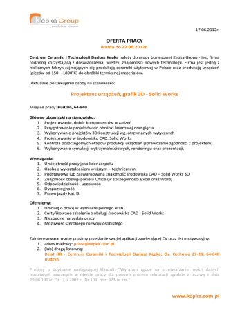 17.06.2012r. OFERTA PRACY ważna do 22.06.2012r. Centrum Ceramiki i Technologii Dariusz Kępka należy do grupy biznesowej Kepka Group - jest firmą rodzinną korzystającą z doświadczenia, wiedzy, znajomości nowych technologii. Firma jest jedną z nielicznych fabryk zajmujących się produkcją ceramiki użytkowej w Polsce oraz produkcją urządzeń (pieców od 150 – 1800oC) do obróbki termicznej materiałów. Aktualnie poszukujemy osoby na stanowisko: Projektant urządzeń, grafik 3D - Solid Works Miejsce pracy: Budzyń, 64-840 Główne obowiązki na stanowisku: 1. Projektowanie, dobór komponentów urządzeń 2. Przygotowanie projektów do obróbki laserowej oraz gięcia 3. Wykonywanie projektów 3D konstrukcji wg. otrzymanych wytycznych 4. Projektowanie w środowisku CAD: Solid Works 5. Kontrola poszczególnych etapów produkcji urządzeń (sprawdzanie zgodności z projektem). 6. Wykonywanie symulacji wytrzymałościowych, renderingu oraz prezentacji. Wymagania: 1. Umiejętność pracy jako lider zespołu 2. Osoba z wykształceniem wyższym – technicznym. 3. Podstawowa lub zaawansowana znajomość środowiska CAD – Solid Works 3D 4. Znajomość obsługi pakietu Office (w szczególności Excel oraz Word) 5. Odpowiedzialność i uczciwość 6. Dyspozycyjność 7. Prawo jazdy kat. B. Oferujemy: 1. Umowę o pracę w wymiarze pełnego etatu 2. Certyfikowane szkolenie z obsługi środowiska CAD - Solid Works 3. Niezbędne narzędzia pracy 4. Możliwość szerokiego rozwoju osobistego Zainteresowane osoby prosimy przesłanie swojej aplikacji zawierającej CV oraz list motywacyjny: 1. adres mailowy: [email protected] 2. (lub) drogą listowną: Dział HR - Centrum Ceramiki i Technologii Dariusz Kępka; Os. Cechowe 27-28; 64-840 Budzyń Prosimy o dopisanie następującej klauzuli: "Wyrażam zgodę na przetwarzanie moich danych osobowych zawartych w ofercie pracy dla potrzeb procesu rekrutacji zgodnie z ustawą z dnia 29.08.1997r. Dz. U. z 2002 r., Nr 101, poz. 923 ze zm." www.kepka.com.pl