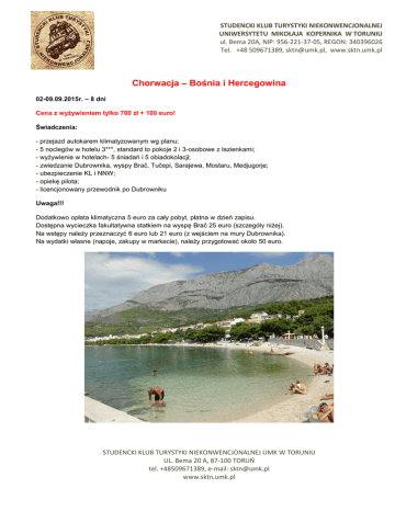 STUDENCKI KLUB TURYSTYKI NIEKONWENCJONALNEJ UNIWERSYTETU MIKOŁAJA KOPERNIKA W TORUNIU ul. Bema 20A, NIP: 956-221-37-05, REGON: 340396026 Tel. +48 509671389, [email protected], www.sktn.umk.pl Chorwacja – Bośnia i Hercegowina 02-09.09.2015r. – 8 dni Cena z wyżywieniem tylko 700 zł + 100 euro! Świadczenia: - przejazd autokarem klimatyzowanym wg planu; - 5 noclegów w hotelu 3***, standard to pokoje 2 i 3-osobowe z łazienkami; - wyżywienie w hotelach- 5 śniadań i 5 obiadokolacji; - zwiedzanie Dubrownika, wyspy Brač, Tučepi, Sarajewa, Mostaru, Medjugorje; - ubezpieczenie KL i NNW; - opiekę pilota; - licencjonowany przewodnik po Dubrowniku Uwaga!!! Dodatkowo opłata klimatyczna 5 euro za cały pobyt, płatna w dzień zapisu. Dostępna wycieczka fakultatywna statkiem na wyspę Brač 25 euro (szczegóły niżej). Na wstępy należy przeznaczyć 6 euro lub 21 euro (z wejściem na mury Dubrownika). Na wydatki własne (napoje, zakupy w markecie), należy przygotować około 50 euro. STUDENCKI KLUB TURYSTYKI NIEKONWENCJONALNEJ UMK W TORUNIU UL. Bema 20 A, 87-100 TORUŃ tel. +48509671389, e-mail: [email protected] www.sktn.umk.pl STUDENCKI KLUB TURYSTYKI NIEKONWENCJONALNEJ UNIWERSYTETU MIKOŁAJA KOPERNIKA W TORUNIU ul. Bema 20A, NIP: 956-221-37-05, REGON: 340396026 Tel. +48 509671389, [email protected], www.sktn.umk.pl Plan wycieczki: 02.09. – środa - wyjazd z Torunia godz. 20.00, parking przy kinie Cinema City. Po drodze postój w okolicach Katowic na kolację (we własnym zakresie). Przejazd nocny Słowację. 03.09. – czwartek - dalsza trasa przez Węgry i Chorwację do Medjugorje. Zakwaterowanie i obiadokolacja, nocleg w zaprzyjaźnionym hotelu. To miejsce będzie naszą bazą. 04.09. – piątek - Dzień rekreacyjny. Po śniadaniu całodzienny wyjazd na plażę do Tučepi. To miejscowość turystyczna w Środkowej Dalmacji, która słynie z najdłuższej plaży na Makarskiej Riwierze ciągnącej się około 3 km, wzdłuż której znajduje się przepiękna promenada w alei sosen. Powrót do Medjugorie na obiadokolację, nocleg. 05.09. – sobota - śniadanie wejście na Górę Križevac - wzgórze wznoszące się ponad Medjugorie (520 m), na którym 15 marca 1934 roku parafianie wznieśli krzyż ze zbrojonego betonu o wysokości 8,56 m. Od początku objawień Matki Bożej na Križevacu zaczęto odmawiać Drogę Krzyżową. Na początku stacje oznaczone były drewnianymi krzyżami, a w 1988 roku umieszczono tam płaskorzeźby wykonane z brązu (dzieło prof. Carmela Puzzola).Trasa dość trudna, konieczne buty z twardą podeszwą. Tego samego dnia wyjazd do Dubrownika. Miasto otoczone murami obronnymi, zabytek wpisany na listę dziedzictwa kulturowego UNESCO. UWAGA: ponieważ wjazd na teren miasta jest ograniczony, parking kosztuje 50 euro za godzinę (!) cała grupa musi być dosłownie co do minuty na miejscu zbiórki. Autokar może się zatrzymać na 5 minut, powyżej tego czasu naliczane są drakońskie kary (10 euro za każdą minutę). Spóźnialscy, przez których autokar odjedzie choćby z minimalnym opóźnieniem będą musieli zapłacić z własnych funduszy karę naliczoną przez strażników miejskich. Powrót na obiadokolację i nocleg. STUDENCKI KLUB TURYSTYKI NIEKONWENCJONALNEJ UMK W TORUNIU UL. Bema 20 A, 87-100 TORUŃ tel. +48509671389, e-mail: [email protected] www.sktn.umk.pl STUDENCKI KLUB TURYSTYKI NIEKONWENCJONALNEJ UNIWERSYTETU MIKOŁAJA KOPERNIKA W TORUNIU ul. Bema 20A, NIP: 956-221-37-05, REGON: 340396026 Tel. +48 509671389, [email protected], www.sktn.umk.pl 06.09. – niedziela - drugi dzień typowo rekreacyjny nad Morzem Adriatyckim. Po śniadaniu ponowny wyjazd na plażę do Tučepi. Dla chętnych możliwość podróży statkiem na plażę na wyspie Brač (w turystycznej miejscowości Bol). Na statku grill, potańcówka etc. Powrót wieczorem do Tučepi. UWAGA: Podróż statkiem jest fakultatywna (dodatkowy koszt 25 euro, w zgłoszeniu należy wyraźnie zaznaczyć chęć udziału w tej wyprawie, gdyż miejsce na statku trzeba wcześniej zarezerwować). Po powrocie do hotelu obiadokolacja i nocleg. 07.09. – poniedziałek - śniadanie, następnie wejście na Górę Objawień (trasa łatwa, dostępna dla wszystkich). To miejsce pierwszych objawień Matki Bożej, kilkaset metrów ponad wioską Podbrdo. Na drodze do miejsca objawień ustawiono wielki drewniany krzyż, który oznacza miejsce, gdzie Matka Boża trzeciego dnia objawień poprzez Mariję Pavlović po raz pierwszy wezwała ludzkość do życia w pokoju. W miejscu objawień, w dwudziestą rocznicę objawień postawiono figurę Królowej Pokoju wykonaną zgodnie ze wzorcem, który znajduje się przed kościołem parafialnym (dzieło Dino Felicio). Przejazd nad wodospady Kravica, tam kilkugodzinny odpoczynek. Powrót do Medjugorje na obiadokolację i nocleg. 08.09. – wtorek - śniadanie, wykwaterowanie i wyjazd do Mostaru godz. 10.00. Zwiedzanie miasta do 12.00. Biały kamienny most nad szmaragdową Neretwą, kolorowe tureckie domy z charakterystycznymi pięterkami haremów. W Mostarze widać ślady tureckiej przeszłości Bałkanów. Największą świątynią w mieście jest Meczet Karadjoz-Bega z 1557 r., łatwo go wypatrzeć z daleka – ma bardzo wysoki minaret, z którego rozciąga się widok na dużą część miasta. W drewnianych podcieniach meczetu można w ciszy odpocząć po wspinaczce na minaret. Po drugiej stronie Neretwy jest kolejny stary meczet - Nesut-agi Vucjakovicia, zbudowany w 1564 r. W pobliżu tego meczetu w czasie wojny przebiegała linia frontu, co widać do dzisiaj. Symbolem Miasta jest Stary Most, który spinał brzegi Neretwy przez ponad 400 lat. Jedna strona tradycyjnie uchodziła za „turecką”, druga za „chorwacką”. STUDENCKI KLUB TURYSTYKI NIEKONWENCJONALNEJ UMK W TORUNIU UL. Bema 20 A, 87-100 TORUŃ tel. +48509671389, e-mail: [email protected] www.sktn.umk.pl STUDENCKI KLUB TURYSTYKI NIEKONWENCJONALNEJ UNIWERSYTETU MIKOŁAJA KOPERNIKA W TORUNIU ul. Be