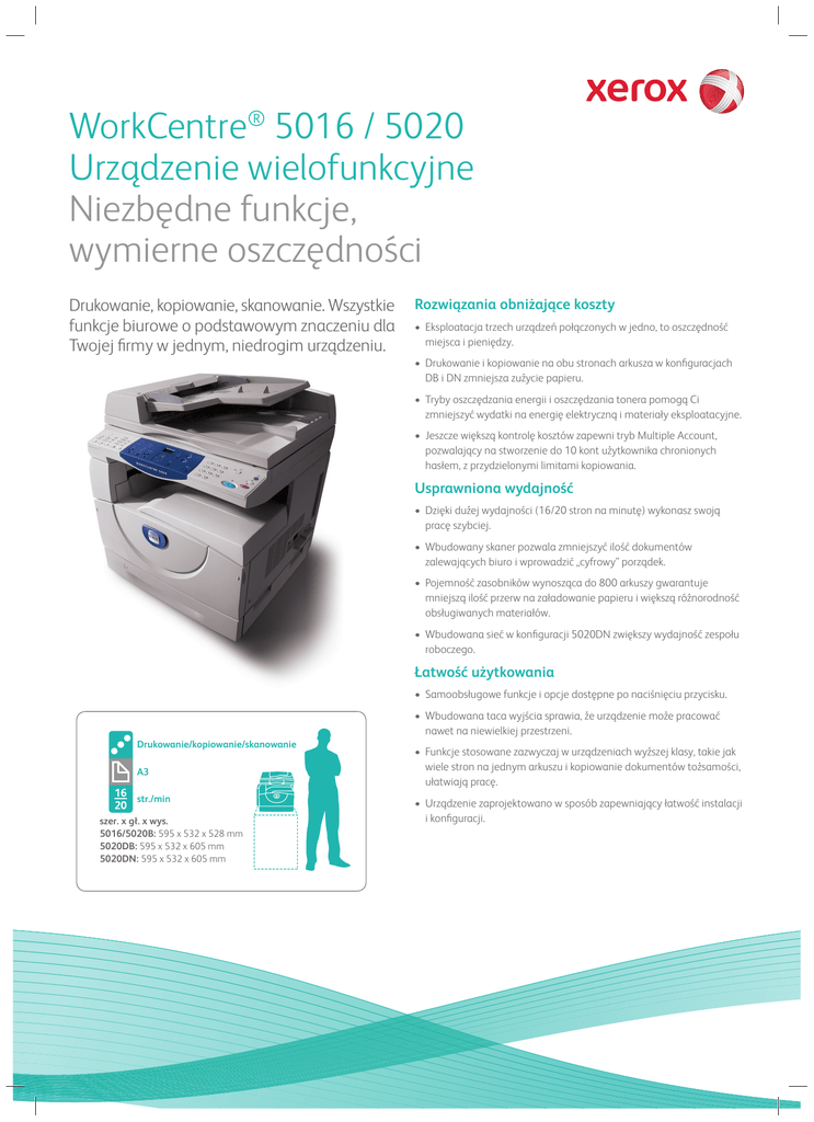 WorkCentre® 5016 / 5020 Urządzenie wielofunkcyjne Niezbędne funkcje, wymierne oszczędności Drukowanie, kopiowanie, skanowanie. Wszystkie funkcje biurowe o podstawowym znaczeniu dla Twojej firmy w jednym, niedrogim urządzeniu. Rozwiązania obniżające koszty • Eksploatacja trzech urządzeń połączonych w jedno, to oszczędność miejsca i pieniędzy. • Drukowanie i kopiowanie na obu stronach arkusza w konfiguracjach DB i DN zmniejsza zużycie papieru. • Tryby oszczędzania energii i oszczędzania tonera pomogą Ci zmniejszyć wydatki na energię elektryczną i materiały eksploatacyjne. • Jeszcze większą kontrolę kosztów zapewni tryb Multiple Account, pozwalający na stworzenie do 10 kont użytkownika chronionych hasłem, z przydzielonymi limitami kopiowania. Usprawniona wydajność • Dzięki dużej wydajności (16/20 stron na minutę) wykonasz swoją pracę szybciej. • Wbudowany skaner pozwala zmniejszyć ilość dokumentów zalewających biuro i wprowadzić „cyfrowy” porządek. • Pojemność zasobników wynosząca do 800 arkuszy gwarantuje mniejszą ilość przerw na załadowanie papieru i większą różnorodność obsługiwanych materiałów. • Wbudowana sieć w konfiguracji 5020DN zwiększy wydajność zespołu roboczego. Łatwość użytkowania • Samoobsługowe funkcje i opcje dostępne po naciśnięciu przycisku. • Wbudowana taca wyjścia sprawia, że urządzenie może pracować nawet na niewielkiej przestrzeni. Drukowanie/kopiowanie/skanowanie A3 str./min szer. x gł. x wys. 5016/5020B: 595 x 532 x 528 mm 5020DB: 595 x 532 x 605 mm 5020DN: 595 x 532 x 605 mm • Funkcje stosowane zazwyczaj w urządzeniach wyższej klasy, takie jak wiele stron na jednym arkuszu i kopiowanie dokumentów tożsamości, ułatwiają pracę. • Urządzenie zaprojektowano w sposób zapewniający łatwość instalacji i konfiguracji. WorkCentre® 5016 / 5020 Czarno-białe urządzenie wielofunkcyjne WorkCentre 5016 Szybkość WorkCentre 5020B WorkCentre 5020DB Do 16 stron na minutę (Letter/A4) Cykl roboczy WorkCentre 5020DN Do 20 stron na minutę (Letter/A4) Do 15 000 stron/miesiąc Do 20 000 stron/miesiąc Do 25 000 stron/miesiąc Obsługa papieru Pojemność wejściowa W standardzie Opcjonalnie Wyjście Podajnik boczny: 50 arkuszy; rozmiary niestandardowe: 5,5 x 8,5 cala do 11 x 17 cali/140 x 216 mm do 297 x 432 mm Zasobnik 1: 250 arkuszy; rozmiary: Letter, Legal, Folio, Tabloid, A3, A4, B4, B5 Zasobnik 2: 500 arkuszy; rozmiary: Letter, Legal, Folio, Tabloid, A3, A4, B4, B5 Taca wyjścia: 250 arkuszy Drukowanie dwustronne Ręczne Podajnik oryginałów Automatyczne Automatyczny podajnik dokumentów na 50 arkuszy Pokrywa oryginałów Dwustronny automatyczny podajnik dokumentów na 50 arkuszy Kopiowanie Czas drukowania pierwszej strony Do 7,5 sekundy Rozdzielczość (maksymalna) 600 x 600 dpi Pomniejszanie/powiększanie, wiele stron na jednym arkuszu, kopiowanie dokumentów tożsamości, rozjaśnianie/przyciemnianie, automatyczne dopasowanie Funkcje kopiowania Drukowanie Czas drukowania pierwszej strony Do 12 sekund Rozdzielczość (maksymalna) 600 x 600 dpi Pamięć 64 MB 128 MB Możliwość podłączenia USB 2.0 USB 2.0, 10/100 BaseT Ethernet GDI PCL Obsługiwane języki: Funkcje drukowania Strony niestandardowe, znaki wodne, drukowanie plakatów, wiele stron na jednym arkuszu, tryb oszczędzania tonera Skanowanie Miejsca docelowe skanowania Skanowanie do komputera, skanowanie do aplikacji TWAIN Funkcje skanowania Oprogramowanie Xerox® Scan to PC Desktop® SE Personal Edition (1 stanowisko), TIFF, PDF, BMP; oprogramowanie OCR – ABBYY FineReader™, obsługa Linux Scan (po wprowadzeniu na rynek) Rozdzielczość skanowania Zarządzanie Inne opcje Zarządzanie urządzeniem (tylko w konfiguracji 5020DN) CentreWare® IS, CetreWare Web Sterowniki druku Sterowniki druku Windows® 2000/XP/2003 Server, Vista, Linux® Obsługa materiałów Podajnik boczny: papier 60 do 110 g/m2 Zasobnik 1 i 2: papier 60 do 90 g/m2 Rodzaje materiałów: papier zwykły, papier z recyclingu, etykiety,przezrocza Środowisko pracy Temperatura: Magazynowanie: 4° do 122°F/-5° do 65°C Podczas pracy: 50° do 90°F/10° do 32°C Wilgotność względna: 15 – 85% Poziom mocy akustycznej: w stanie gotowości: 4,2 B; podczas pracy: 6,7 B Poziom hałasu: w stanie gotowości: 28 dB(A), podczas pracy: 58 dB(A) 1 2 Skanowanie do skrzynki 600 x 600 dpi Rozliczanie kopiowania – kontrola dostępu i wykorzystania urządzenia Drugi zasobnik, podstawa, możliwość zewnętrznego serwera druku Drugi zasobnik, podstawa Dane elektryczne Zasilanie: 110-127 V, 50/60 Hz i 220-240 V, 50/60 Hz Zużycie energii: podczas pracy (średnio): 525 W, w trybie oszczędzania energii: 20 W; zgodność z Energy Star® Wymiary (szerokość x głębokość x wysokość) 5016/5020B: 595 x 532 x 528 mm; Waga: 33 kg 5020DB: 595 x 532 x 605 mm; Waga: 38 kg 5020DN: 595 x 532 x 605 mm; Waga:39 kg Certyfikaty Zgodność z normą UL 60950 -1/CSA - 60950-1-03, znak CE zgodny z dyrektywami 2006/95/WE, 2004/108/WE, 1999/5/WE Urządzenie WorkCenre 5020DN z dupleksowym automatycznym podajnikiem dokumentów, opcjonalnym drugim zasobnikiem oraz podstawą Materiały eksploatacyjne Zbiornik z tonerem o standardowej wydajności średnio 6 300 standardowych stron1 sprzedawany ze zbiornikiem o wydajności 2 000 stron Kaseta bębna: 22 000 stron2 Przeciętne standardowe strony. Wydajność deklarowana zgodna z ISO/IEC 19752. Wydajność zmienia się zależnie od obrazu, powierzchni i trybu wydruku. Strony w przybliżeniu. Deklarowana wydajność przy drukowaniu stron formatu A4. Wydajność różni się w zależności od wymiarów i orientacji materiału. Copyright © 2008 XEROX CORPORATION. Wszelkie prawa zastrzeżone. Zawartość niniejszej publikacji nie może być powielana w żadnej formie bez zgody XEROX CORPORATION. XEROX®, CentreWare®, Scan to PC Desktop®, WorkCentre® i symbol Sphere of Connectivity są znakami towarowymi XEROX CORPORAT