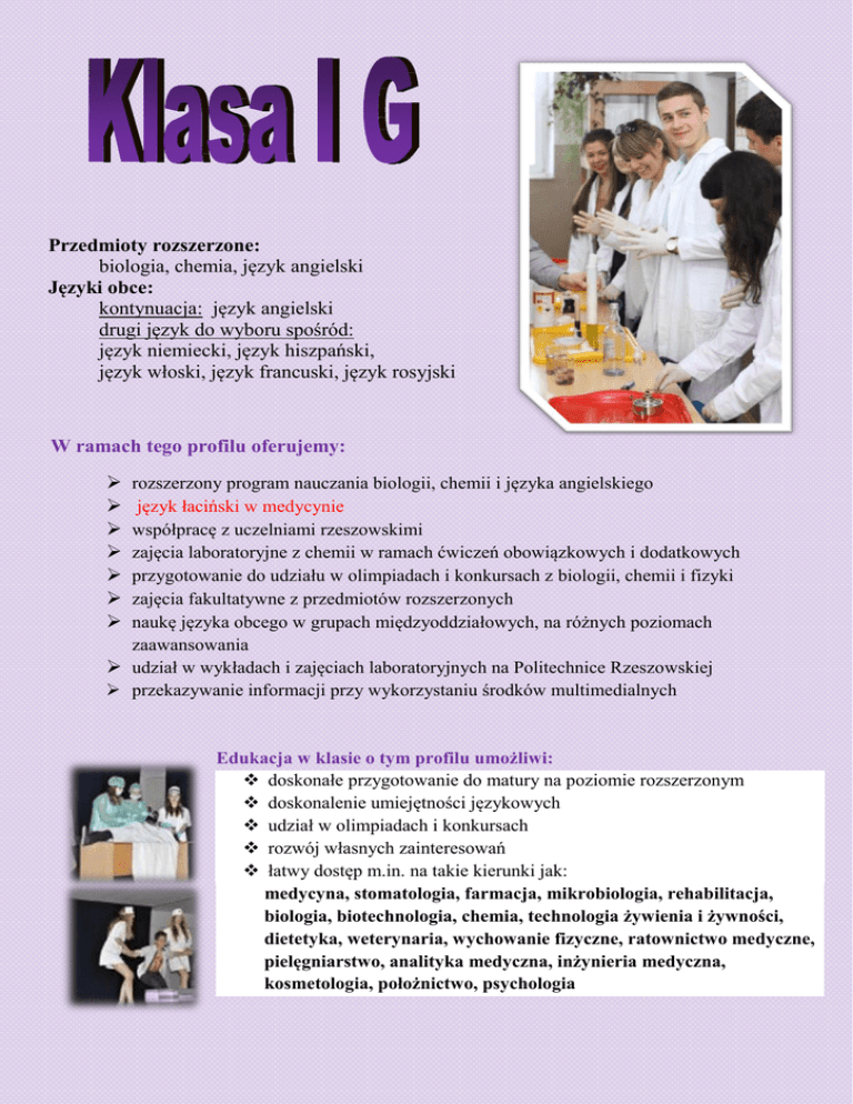 Przedmioty rozszerzone: biologia, chemia, język angielski Języki