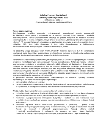 Lokalny Program Rewitalizacji Dąbrowy Górniczej do roku 2020 (aktualizacja - 2013 r.) - fragmenty dot. obszaru objętego projektem Tereny poprzemysłowe Dotychczasowy przebieg procesów restrukturyzacji gospodarczej miasta doprowadził do likwidacji miejsc pracy i pojawienia się w mieście znacznej liczby terenów i obiektów poprzemysłowych. Tereny poprzemysłowe znajdują się przede wszystkim na obszarze dzielnicy śródmiejskiej. Są to tereny po kopalni „Paryż” oraz w części Hucie „Bankowej” oraz przedsiębiorstwie „Defum”. W centrach lokalnych zdegradowane działalnością przemysłu są przede wszystkim tereny zakładów: ERG, Huty Szkła Okiennego i Huty Szkła Gospodarczego w Ząbkowicach, a w Strzemieszycach teren po byłych Zakładach Chemicznych „Strem”. Na oddzielną uwagę zasługuje teren PPUH „Dolomit” Kopalnia Ząbkowice S.A. Po zakończeniu eksploatacji złoża dolomitów, uwzględniając przekształcenia związane z działalnością wydobywczą, zaistnieje konieczność wprowadzenia nowych funkcji dla tego terenu. Na terenach i w obiektach poprzemysłowych znajdujących się w Śródmieściu pożądana jest realizacja projektów rewitalizacyjnych wzmacniających funkcje centrotwórcze. Natomiast tereny i obiekty poprzemysłowe położone w ośrodkach lokalnych, takich głównie jak Ząbkowice i Strzemieszyce zasługują na aktywizację gospodarczą. Jest to zarazem aktywizacja skutkująca odrodzeniem się lokalnych centrów dzielnicowych. Podczas prac nad programem zwracano uwagę na konieczność rekultywacji wysypiska odpadów komunalnych przy ul. Niemcewicza. Natomiast w zakresie odpadów poprzemysłowych, rekultywacji wymagają składowiska odpadów pogórniczych i pokutniczych, m.in. tereny po byłej kopalni piasku tzw. „Wypaleniska”. W przypadku terenów poprzemysłowych zlokalizowanych na obszarze Dąbrowy Górniczej najistotniejsze problemy rewitalizacyjne związane są z: • koniecznością rekultywacji terenów, • ograniczeniem ryzyka negatywnych skutków środowiskowych na tereny i obiekty zlokalizowane w sąsiedztwie, w szczególności obszary mieszkaniowe oraz tereny cenne przyrodniczo. Wśród atutów dąbrowskich terenów poprzemysłowych należy wymienić: • dobrą lokalizację na obszarze dzielnicy śródmiejskiej, co przejawia się w dobrym skomunikowaniu z pozostałymi dzielnicami miasta jak również pozostałymi miastami aglomeracji i regionu, • możliwość zagospodarowania istniejących budynków i budowli na cele biznesowe bądź w niektórych przypadkach, ze względu na walory architektoniczne i historyczne realizacja funkcji kulturalnych. • możliwość łączenia działań rewitalizacji gospodarczej i społecznej, z jednej strony z działaniami wspierającymi rozwój małej przedsiębiorczości, a z drugiej z rozwijaniem nowych funkcji na terenach i obiektach poprzemysłowych. Rozwój sektora małych i średnich przedsiębiorstw i zachęcanie do napływu na teren miasta kapitałów i inwestorów zewnętrznych sprzęga restrukturyzację gospodarki miasta z jego rewitalizacją. OBSZARY REWITALIZACJI Obszar VIII: Śródmiejskie Tereny Przemysłowe Granica obszaru przebiega wzdłuż zachodniej granicy miasta (ul. Siemońska), ul. Jana III Sobieskiego, po granicy terenów przemysłowych Huty Bankowej i dalej wzdłuż linii kolejowej PKP do granicy Dąbrowy Górniczej z Będzinem (ul. Siemońska). Mapa nr 9. Obszar VIII: Śródmiejskie tereny przemysłowe W granicach obszaru znajdują się ulice: Perla, Moniuszki, Filtrowa, Siemońska, Jana III Sobieskiego (zabudowa usytuowana po stronie północnej). W zachodniej części Śródmieścia, przy granicy z Będzinem, wyróżniono odrębny obszar rewitalizacji. Obszar VIII zdominowany jest przez tereny poprzemysłowe (tereny i obiekty po kopalni „Paryż”, zwałowisko „Jadwiga”, tereny po Hucie „Bankowa” wymagające rewitalizacji gospodarczej. Przemysłowe budynki i budowle Huty Bankowa oraz kopalni Paryż to budynki o interesującej architekturze. Zły stan techniczny, konieczność znalezienia nowych funkcji (kop. Paryż) oraz przystosowanie do nowych zadań i przeznaczenia winno uwzględniać ich historyczne formy i kompozycje urbanistyczne. Na terenie dawnej kop. Paryż pozostają zachowane obiekty z XIX/XX wieku i z lat międzywojennych XX wieku. Zabudowania przy ul. Perlej, niewątpliwie o walorach kulturowych, wymagają nadania nowej trwałej funkcji oraz rewitalizacji w kierunku gospodarczym. Priorytety i cele strategiczne rewitalizacji obszaru VIII OBSZAR VIII: ŚRÓDMIEJSKIE TERENY POPRZEMYSŁOWE Priorytet 6 Wprowadzenie nowych funkcji biznesowych, kulturalnych i rozrywkowych na śródmiejskie tereny poprzemysłowe z zachowaniem dziedzictwa poprzemysłowego Cel strategiczny 8 Przyciągnięcie na śródmiejskie tereny poprzemysłowe inwestorów zewnętrznych kreujących nowe funkcje w oparciu o korzystne warunki rozwojowe Cele operacyjne rewitalizacji obszaru VIII 1. Zagospodarowanie śródmiejskich terenów i obiektów poprzemysłowych po Kopalni Paryż i Hucie Bankowej z zachowaniem ich wartości historycznych. 2. Nowe atrakcyjne miejsca pracy na śródmiejskich terenach poprzemysłowych. Typy projektów obszaru VIII 1. Projekty rozwijające nowe funkcje na śródmiejskich terenach poprzemysłowych z uwzględnieniem ich bezpośredniego otoczenia. 2. Projekty podnoszące poziom bezpieczeństwa publicznego oraz poprawiające estetykę przestrzeni publicznych. Wykaz zgłoszonych projektów rewitalizacyjnych Obszar VIII: Śródmiejskie tereny poprzemysłowe Aktywizacja ekonomiczna obszarów poprzemysłowych - Hałda Jadwiga w Dąbrowie Górniczej (Etap I) Gmina Dąbrowa Górnicza – Wydział Inwestycji Miejskich, Biuro Rozwoju Miasta i Obsługi Inwestorów 2012-2013 289.050,00 Rewitalizacja obiektów poprzemysłowych dawnej kopalni Paryż celem nadania im nowych, trwałych funkcji gospodarczych, społecznych i kulturalnych oraz kreowaniu bezpie