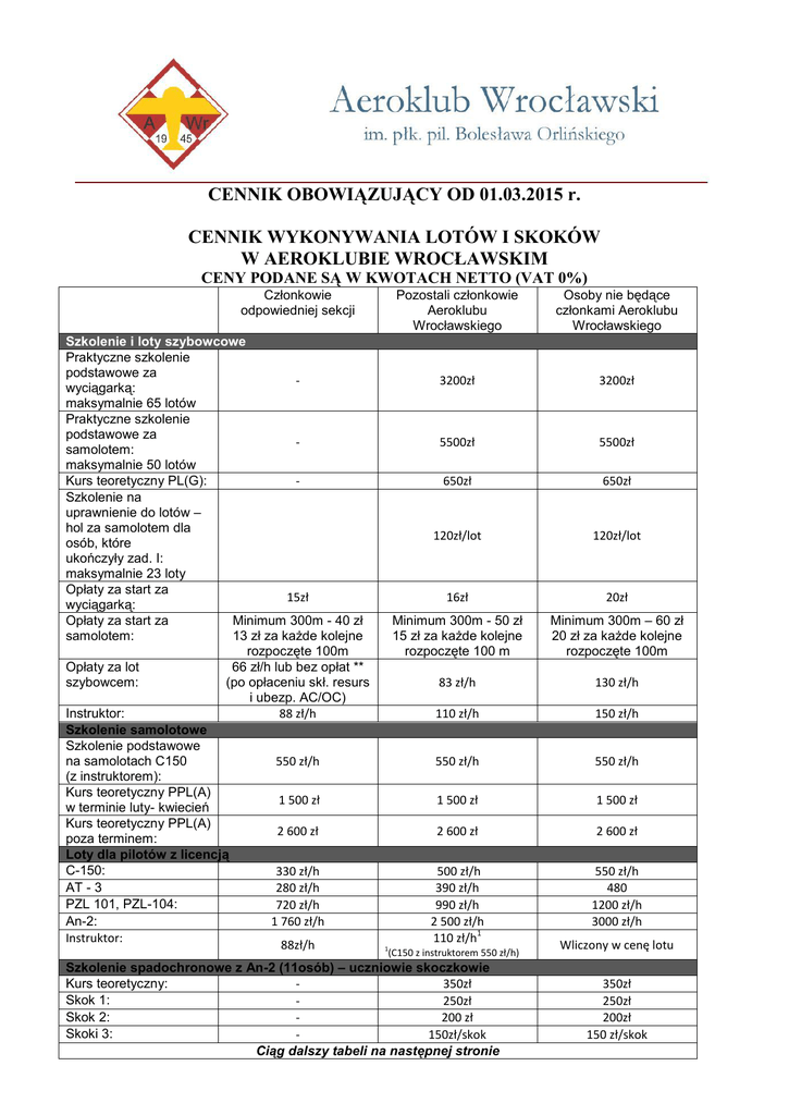 Cennik - Aeroklub Wrocławski