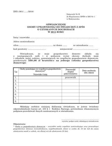 ZSI1:361/……/2016 Załącznik Nr B do Regulaminu ZFŚS w ZSI Nr 1 w Białymstoku OŚWIADCZENIE OSOBY UPRAWNIONEJ DO ŚWIADCZEŃ Z ZFŚS O UZYSKANYCH DOCHODACH W 2015 ROKU Imię i nazwisko ……………………………………………………………………………… Adres zamieszkania: ulica ……………………………………… nr domu …… kod pocztowy …………………… nr mieszkania …… miejscowość …………………………… Oświadczam, że moje gospodarstwo z następujących osób i w podanym wyżej i członków mojej rodziny, pozostających we wspólnym przekroczyły 3301,00 zł brutto/m-c na jednego domowego: Osoby pozostające we wspólnym gospodarstwie domowym* Lp. Nazwisko i imię 1. domowe składa się okresie dochody moje gospodarstwie domowym, członka gospodarstwa Pracownik/ stopień pokrewieństwa Data urodzenia (dot. dzieci) pracownik 2. 3. 4. 5. 6. 7. 8. Składając osobiście niniejszą deklarację oświadczam, że jestem świadomy odpowiedzialności karnej art. 233 § 1 Kodeksu Karnego, potwierdzam własnoręcznym podpisem prawdziwość danych zamieszczonych w oświadczeniu. .............................................………… czytelny podpis osoby składającej oświadczenie Objaśnienia: * Osoby w gospodarstwie domowym – wszystkie osoby wspólnie zamieszkujące oraz prowadzące gospodarstwo domowe (wnioskodawca, współmałżonek, dzieci w wieku do 18 lat lub do czasu ukończenia nauki w szkole, nie dłużej niż do ukończenia 25 lat). ZSI1:361/……/2016 Załącznik Nr A do Regulaminu ZFŚS w ZSI Nr 1 w Białymstoku OŚWIADCZENIE OSOBY UPRAWNIONEJ DO ŚWIADCZEŃ Z ZFŚS O UZYSKANYCH DOCHODACH W 2015 ROKU Imię i nazwisko ……………………………………………………………………………… Adres zamieszkania: ulica ……………………………………… nr domu …… kod pocztowy …………………… nr mieszkania …… miejscowość …………………………… Oświadczam, że moje gospodarstwo domowe składa się z następujących osób i w podanym wyżej okresie dochody moje i członków mojej rodziny, pozostających we wspólnym gospodarstwie domowym wynosiły: Lp. 1. Osoby pozostające we wspólnym gospodarstwie domowym* Nazwisko i imię Pracownik/Emeryt stopień pokrewieństwa Data urodzenia (dot. dzieci) Roczna wysokość dochodu brutto w zł. Pracownik/ emeryt 2. 3. 4. 5. 6. 7. 8. I. Łączny dochód brutto całego gospodarstwa domowego II. Łączny dochód miesięczny brutto całego gospodarstwa domowego (wzór wyliczenia: poz. I tabeli : 12 m-cy) III. Średni łączny dochód na jednego członka gospodarstwa domowego miesięcznie (poz. II tabeli : liczbę osób w rodzinie) Składając osobiście niniejszą deklarację oświadczam, że jestem świadomy odpowiedzialności karnej art. 233 § 1 Kodeksu Karnego, potwierdzam własnoręcznym podpisem prawdziwość danych zamieszczonych w oświadczeniu. .............................................………… czytelny podpis osoby składającej oświadczenie Objaśnienia: * Osoby w gospodarstwie domowym – wszystkie osoby wspólnie zamieszkujące oraz prowadzące gospodarstwo domowe (wnioskodawca, współmałżonek, dzieci w wieku do 18 lat lub do czasu ukończenia nauki w szkole, nie dłużej niż do ukończenia 25 lat). * WAŻNE! Należy podać wszystkie dochody (w tym: alimenty, dochody ze środków UE po odliczeniu kosztów uzyskania, inne dochody nieopodatkowane w Polsce, itp.) wszystkich członków rodziny: przy korzystaniu z formularzy PIT należy podać sumę rubryk, które należy aktualizować zgodnie ze zmianami wprowadzonymi w PIT 36, PIT 37, PIT 40, PIT 40a. ZSI1:361/……/2016 Załącznik Nr C do Regulaminu ZFŚS w ZSI Nr 1 w Białymstoku OŚWIADCZENIE OSOBY UPRAWNIONEJ DO ŚWIADCZEŃ Z ZFŚS O UZYSKANYCH DOCHODACH ZA OSTATNIE 3 MIESIĄCE Imię i nazwisko ……………………………………………………………………………… Adres zamieszkania: ulica ……………………………………… nr domu …… kod pocztowy …………………… nr mieszkania …… miejscowość …………………………… Oświadczam, że moje gospodarstwo domowe składa się z następujących osób i w podanym wyżej okresie dochody moje i członków mojej rodziny, pozostających we wspólnym gospodarstwie domowym wynosiły: Lp. 1. Osoby pozostające we wspólnym gospodarstwie domowym* Nazwisko i imię Pracownik/Emeryt stopień pokrewieństwa Data urodzenia (dot. dzieci) Łączna wysokość dochodu brutto w zł. za 3 m-ce Pracownik/ emeryt 2. 3. 4. 5. 6. 7. 8. I. Łączny dochód brutto całego gospodarstwa domowego II. Łączny dochód miesięczny brutto całego gospodarstwa domowego (wzór wyliczenia: poz. I tabeli : 12 m-cy) III. Średni łączny dochód na jednego członka gospodarstwa domowego miesięcznie (poz. II tabeli : liczbę osób w rodzinie) Składając osobiście niniejszą deklarację oświadczam, że jestem świadomy odpowiedzialności karnej art. 233 § 1 Kodeksu Karnego, potwierdzam własnoręcznym podpisem prawdziwość danych zamieszczonych w oświadczeniu. .............................................………… czytelny podpis osoby składającej oświadczenie Objaśnienia: * Osoby w gospodarstwie domowym – wszystkie osoby wspólnie zamieszkujące oraz prowadzące gospodarstwo domowe (wnioskodawca, współmałżonek, dzieci w wieku do 18 lat lub do czasu ukończenia nauki w szkole, nie dłużej niż do ukończenia 25 lat).