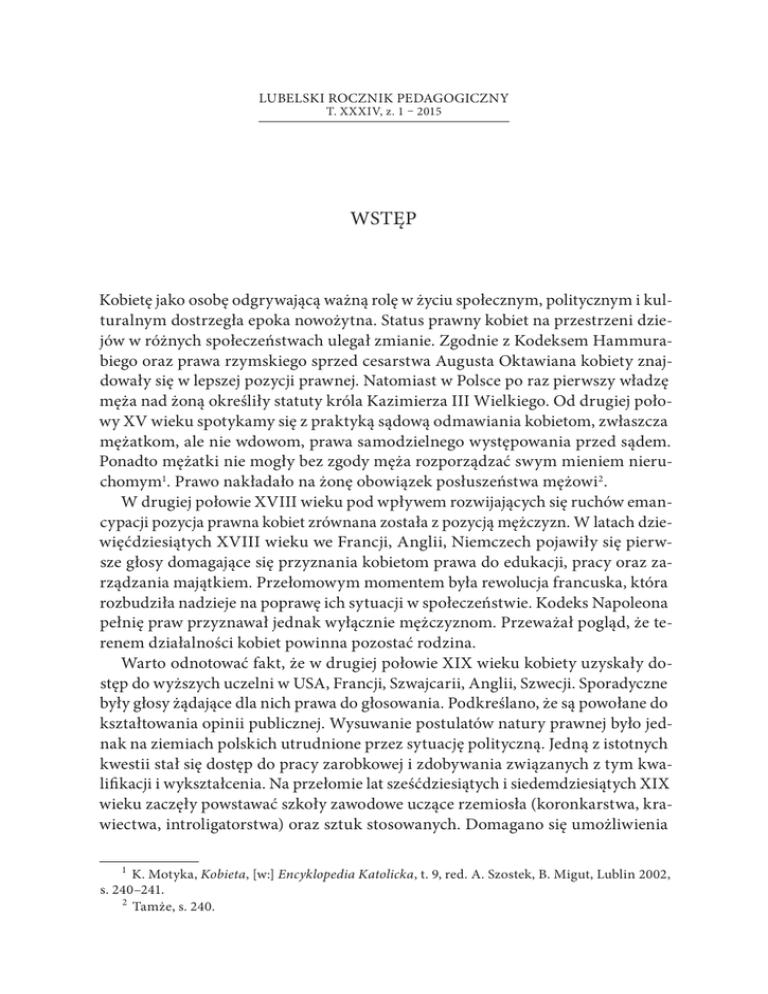 Lubelski rocznik pedagogiczny t. XXXIV, z. 1 – 2015 WSTĘP Kobietę jako osobę odgrywającą ważną rolę w życiu społecznym, politycznym i kulturalnym dostrzegła epoka nowożytna. Status prawny kobiet na przestrzeni dziejów w różnych społeczeństwach ulegał zmianie. Zgodnie z Kodeksem Hammurabiego oraz prawa rzymskiego sprzed cesarstwa Augusta Oktawiana kobiety znajdowały się w lepszej pozycji prawnej. Natomiast w Polsce po raz pierwszy władzę męża nad żoną określiły statuty króla Kazimierza III Wielkiego. Od drugiej połowy XV wieku spotykamy się z praktyką sądową odmawiania kobietom, zwłaszcza mężatkom, ale nie wdowom, prawa samodzielnego występowania przed sądem. Ponadto mężatki nie mogły bez zgody męża rozporządzać swym mieniem nieruchomym1. Prawo nakładało na żonę obowiązek posłuszeństwa mężowi2. W drugiej połowie XVIII wieku pod wpływem rozwijających się ruchów emancypacji pozycja prawna kobiet zrównana została z pozycją mężczyzn. W latach dziewięćdziesiątych XVIII wieku we Francji, Anglii, Niemczech pojawiły się pierwsze głosy domagające się przyznania kobietom prawa do edukacji, pracy oraz zarządzania majątkiem. Przełomowym momentem była rewolucja francuska, która rozbudziła nadzieje na poprawę ich sytuacji w społeczeństwie. Kodeks Napoleona pełnię praw przyznawał jednak wyłącznie mężczyznom. Przeważał pogląd, że terenem działalności kobiet powinna pozostać rodzina. Warto odnotować fakt, że w drugiej połowie XIX wieku kobiety uzyskały dostęp do wyższych uczelni w USA, Francji, Szwajcarii, Anglii, Szwecji. Sporadyczne były głosy żądające dla nich prawa do głosowania. Podkreślano, że są powołane do kształtowania opinii publicznej. Wysuwanie postulatów natury prawnej było jednak na ziemiach polskich utrudnione przez sytuację polityczną. Jedną z istotnych kwestii stał się dostęp do pracy zarobkowej i zdobywania związanych z tym kwalifikacji i wykształcenia. Na przełomie lat sześćdziesiątych i siedemdziesiątych XIX wieku zaczęły powstawać szkoły zawodowe uczące rzemiosła (koronkarstwa, krawiectwa, introligatorstwa) oraz sztuk stosowanych. Domagano się umożliwienia 1 K. Motyka, Kobieta, [w:] Encyklopedia Katolicka, t. 9, red. A. Szostek, B. Migut, Lublin 2002, s. 240–241. 2 Tamże, s. 240. 8 WSTĘP kobietom dostępu do edukacji w szkołach wyższych. Od pierwszej połowy XX wieku w większości krajów uzyskały one prawa wyborcze, a ich pozycja prawna od początku XX wieku była przedmiotem regulacji prawnomiędzynarodowych. Praca zawodowa kobiet, organizowane przez nie wystawy promujące własne dokonania, zakładanie towarzystw i stowarzyszeń, w których podejmowały aktywną działalność, upowszechniały naukę, wiedzę z dziedziny historii ojczystej oraz nowych odkryć i osiągnięć w dziedzinie medycyny, higieny, nauk ścisłych i technicznych – ukazywały dojrzewanie kobiet do podejmowania świadomych działań obywatelskich i społecznych. Niniejszy zbiór dziewięciu artykułów został uporządkowany pod względem chronologicznym. Większość szkiców powstała na podstawie badań dotyczących historii kobiet, prowadzonych przez poszczególnych autorów. Do ich przygotowania zaproszono badaczy z różnych ośrodków naukowych. W tomie reprezentowane są: UMCS Lublin, Biblioteka KUL, Katolicki Uniwersytet Lubelski Jana Pawła II, Biblioteka Uniwersytetu Przyrodniczego w Lublinie, SD w Rzeszowie i Instytut Studiów Politycznych PAN. Tytuł książki nawiązuje do słów Stefana Packa, polskiego felietonisty i autora aforyzmów3. Przedmiotem zainteresowania autorów artykułów zamieszczonych w publikacji są różne obszary kobiecej aktywności od starożytności po XXI wiek. Jednocześnie przedstawiają oni dotychczasowy stan badań. Artykuły Anny Zmorzanki, otwierające prezentowaną książkę, są pod wieloma względami nowatorskie. Autorka zamieszczonych tu tekstów Uczone kobiety w dobie przedchrześcijańskiej (poetki, filozofki, lekarki, alchemiczki) i Uczone kobiety starożytnego chrześcijaństwa podjęła próbę ukazania miejsca i roli kobiety w epoce starożytnej, prezentując sylwetki poetek, filozofek, przyrodniczek, pisarek chrześcijańskich oraz podróżniczek w omawianej epoce. Następny tekst Dwie księżne. Walka kobiet o władzę w Czechach na początku X wieku pióra Joanny Nastalskiej ukazuje wczesne dzieje Czechów. Autorka w zwięzły sposób przedstawiła walkę o władzę po śmierci Wratysława dwu księżnych Drahomiry i Ludmiły. Dobrze uchwyciła stosunki w Czechach w X wieku, wykorzystała dorobek historiografii czeskiej oraz rosyjskiej, kreśląc sytuację kobiety w społeczeństwie średniowiecznym. Według powszechnego przekonania w epoce średniowiecza kobiety miały niewielki udział w życiu politycznym. Ambitniejsze jednostki były w stanie zdobyć jednak wysoką pozycję w państwie i mieć znaczący wpływ na rządy. Ks. Grzegorz Wójcik w swoim artykule Kobiety w życiu króla Kazimierza Wielkiego w świetle „Annales seu cronicae incliti Regni Poloniae” Jana Długosza podjął próbę ilustracji stosunków na dworze Kazimierza Wielkiego, jego relacji 3 http:/biblioteka.kijowski.pl/pacek.stefan/myśli.pdf (dostęp: 17.02.2014). WSTĘP 9 z kobietami oraz ich oceny przez Jana Długosza. Tym samym ukazał miejsce kobiet w życiu króla Kazimierza III Wielkiego w oparciu o wielkie dzieło polskiej historiografii, jakim są annały Długosza, podjął próbę ukazania tego, co na temat kobiet napisał największy historyk polskiego średniowiecza w swoim dziele, ujmując omawiane zagadnienie szeroko, nie ograniczając się jedynie do żon i miłostek Kazimierza Wielkiego. Na uwagę zasługują teksty Mariana Butkiewicza (Barbara z Duninów Sanguszkowa jako mecenas w schyłkowej epoce polskiego baroku), Elżbiety Krzewskiej i Ryszarda Skrzyniarza (Tekla z Wodzickich Małachowska jako protektorka Towar