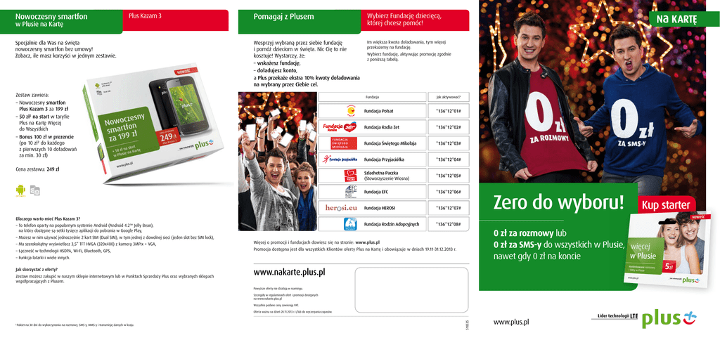 Nowoczesny smartfon w Plusie na Kartę Plus Kazam 3 Specjalnie dla Was na święta nowoczesny smartfon bez umowy! Zobacz, ile masz korzyści w jednym zestawie. Pomagaj z Plusem Wybierz Fundację dziecięcą, której chcesz pomóc! Wesprzyj wybraną przez siebie fundację i pomóż dzieciom w święta. Nic Cię to nie kosztuje! Wystarczy, że: – wskażesz fundację, – doładujesz konto, a Plus przekaże ekstra 10% kwoty doładowania na wybrany przez Ciebie cel. Im większa kwota doładowania, tym więcej przekażemy na fundację. Zestaw zawiera: Wybierz fundację, aktywując promocję zgodnie z poniższą tabelą. Fundacja F – Nowoczesny smartfon Plus Kazam 3 za 199 zł – 50 zł2 na start w taryfie Plus na Kartę Więcej do Wszystkich – Bonus 100 zł w prezencie (po 10 zł2 do każdego z pierwszych 10 doładowań za min. 30 zł) Cena zestawu: 249 zł UN DACJ Jak aktywować? A Fundacja Polsat *136*12*01# Fundacja Radia Zet *136*12*02# Fundacja Świętego Mikołaja *136*12*03# Fundacja Przyjaciółka *136*12*04# Szlachetna Paczka (Stowarzyszenie Wiosna) *136*12*05# Fundacja EFC *136*12*06# Fundacja HEROSI *136*12*07# Fundacja Rodzin Adopcyjnych *136*12*08# Zero do wyboru! Dlaczego warto mieć Plus Kazam 3? – To telefon oparty na popularnym systemie Android (Android 4.2™ Jelly Bean), na który dostępne są setki tysięcy aplikacji do pobrania w Google Play, – Możesz w nim używać jednocześnie 2 kart SIM (Dual SIM), w tym jednej z dowolnej sieci (jeden slot bez SIM lock), – Ma szerokokątny wyświetlacz 3,5” TFT HVGA (320x480) z kamerą 3MPix + VGA, – Łączność w technologii HSDPA, Wi-Fi, Bluetooth, GPS, 0 zł za rozmowy lub 0 zł za SMS-y do wszystkich w Plusie, nawet gdy 0 zł na koncie Więcej o promocji i fundacjach dowiesz się na stronie: www.plus.pl Promocja dostępna jest dla wszystkich Klientów oferty Plus na Kartę i obowiązuje w dniach 19.11-31.12.2013 r. – Funkcja latarki i wiele innych. Jak skorzystać z oferty? Zestaw możesz zakupić w naszym sklepie internetowym lub w Punktach Sprzedaży Plus oraz wybranych sklepach współpracujących z Plusem. www.nakarte.plus.pl Powyższe oferty nie działają w roamingu. Szczegóły w regulaminach ofert i promocji dostępnych na www.nakarte.plus.pl Wszystkie podane ceny zawierają VAT. 2 Pakiet na 30 dni do wykorzystania na rozmowy, SMS-y, MMS-y i transmisję danych w kraju. 510535 Oferta ważna na dzień 20.11.2013 r. i/lub do wyczerpania zapasów. www.plus.pl Kup starter Taryfy WIĘCEJ Szeroki wybór benefitów do doładowań WIĘCEJ usług Taryfy WIĘCEJ to 4 taryfy do wyboru w zależności od Twoich potrzeb. Sprawdź, która jest odpowiednia dla Ciebie. W każdej z taryf dostępna jest inna promocja dająca benefit po doładowaniu dopasowany do Twoich potrzeb. W każdej z taryf WIĘCEJ możesz dokupić dodatkowe usługi, które pozwolą obniżyć koszty połączeń i transmisji danych. w Plusie na Kartę Obniż koszty jeszcze bardziej w Plusie na Kartę Rozmowy z bliskimi Dzwoń lub pisz do wszystkich w Plusie za darmo! Aktywuj tę promocję, która bardziej Ci odpowiada. W każdej chwili możesz zmienić wybór. Możesz dzwonić lub pisać w ramach wybranej promocji, nawet jak masz 0 zł na koncie! Promocja Co masz dzięki temu? Jak włączyć? Ile to kosztuje? Rozmowy za 0 zł w Plusie 0 zł/min do wszystkich w Plusie *136*11*31# 3 zł SMS-y za 0 zł w Plusie 0 zł/SMS do wszystkich w Plusie *136*11*30# Ważne informacje: (jednorazowa opłata za włączenie) Stawki podstawowe Więcej do Wszystkich Więcej przez Rok Więcej w Plusie Więcej Internetu i SMS-ów Połączenia do wszystkich sieci 29 gr/min 29 gr/min 29 gr/min 29 gr/min SMS-y do wszystkich sieci 19 gr/SMS 19 gr/SMS 19 gr/SMS 9 gr/SMS MMS-y do wszystkich sieci 29 gr/MMS 29 gr/MMS 29 gr/MMS 29 gr/MMS Transfer danych 29 gr/100 kB 29 gr/100 kB 29 gr/100 kB 5 gr/100 kB Jeśli masz inną taryfę, zmień ją Krótkim Kodem1 (jednorazowy koszt 3 zł) Więcej do Wszystkich *147*16# *147*18# - W jednym czasie na koncie może być aktywna jedna z promocji. Aby ją zmienić, należy wcześniej wyłączyć obecną. Więcej na www.plus.pl Jak skorzystać z oferty? *147*17# *147*15# Benefit po doładowaniu Promocyjne stawki do wszystkich sieci na 30 dni Kwota doładowania 9 gr/min i 1 gr/SMS 100 zł i więcej 19 gr/min i 6 gr/SMS 50 – 99 zł 25 gr/min i 9 gr/SMS 30 – 49 zł Więcej przez Rok Roczna ważność konta na usługi wychodzące Więcej w Plusie Nielimitowane rozmowy i SMS-y w Plusie na 30 dni 5 zł i więcej 50 zł i więcej Jak aktywować? *136*11*10# 1 Zmiana taryfy powoduje utratę warunków promocyjnych wynikających z poprzedniej taryfy i dezaktywację promocji, które nie są dostępne w wybranej taryfie. Szczegółowe informacje o warunkach w regulaminach promocji na www.plus.pl Więcej Internetu i SMS-ów Ile to kosztuje? Wybrane numery w Plusie Darmowe rozmowy z bliskimi osobami w Plusie *104*11*48nr_tel# 10 zł/30 dni do 5 numerów Wybrany numer z dowolnej sieci Rozmawiasz za 10 gr/min z bliską osobą z dowolnej sieci komórkowej *106*11*48nr_tel# 3 zł/30 dni Usługa Co masz dzięki temu? Jak włączyć? Ile to kosztuje? Pakiet Internetowy 300 MB 300 MB na 30 dni *121*11*01# 7 zł/30 dni Pakiet Internetowy 1 GB 1 GB na 30 dni *121*11*02# 13 zł/30 dni Internet Ważne informacje: – Rozwiązania można łączyć. Pakiet 1000 SMS-ów do wszystkich sieci Pakiet Internetowy 200 MB za 1 zł Darmowe LTE *136*11*08# Internet w najszybszej technologii w sieci o zasięgu LTE i HSPA+ w Plusie na Kartę LTE to technologia pozwalająca na transmisję danych w telefonie z prędkością do 100 Mb/s. Rodzaj usługi Co masz dzięki temu? Jak aktywować? LTE w Plusie na Kartę Darmowy dostęp do technologii LTE *101*11*24# *136*11*04# Co jest jeszcze potrzebne, aby korzystać z Usługi LTE w Plusie na Kartę? 1. Zasięg LTE. –K up specjalnie oznaczony starter Plus na Kartę Więcej w Plusie. – Jeśli masz już inną ofertę na kartę w Plusi