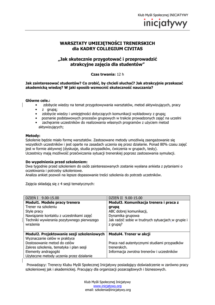 Klub Myśli Społecznej INICJATYWY WARSZTATY UMIEJĘTNOŚCI TRENERSKICH dla KADRY COLLEGIUM CIVITAS „Jak skutecznie przygotować i przeprowadzić atrakcyjne zajęcia dla studentów” Czas trwania: 12 h Jak zainteresować studentów? Co zrobić, by chcieli słuchać? Jak atrakcyjnie przekazać akademicką wiedzę? W jaki sposób wzmocnić skuteczność nauczania? Główne cele.: • zdobycie wiedzy na temat przygotowywania warsztatów, metod aktywizujących, pracy • z grupą; • zdobycie wiedzy i umiejętności dotyczących komunikacji wykładowcy z grupą; • poznanie podstawowych procesów grupowych w trakcie prowadzonych zajęć na uczelni • zachęcenie uczestników do realizowania własnych programów z użyciem metod aktywizujących; Metody: Szkolenie będzie miało formę warsztatów. Zastosowane metody umożliwią zaangażowanie się wszystkich uczestników i jest oparte na zasadach uczenia się przez działanie. Ponad 80% czasu zajęć jest w formie aktywnej (dyskusje, studia przypadków, ćwiczenia w grupach, testy). Uczestnicy mają możliwość przećwiczenia sytuacji trenerskiej poprzez zastosowania symulacji. Do wypełnienia przed szkoleniem: Dwa tygodnie przed szkoleniem do osób zainteresowanych zostanie wysłana ankieta z pytaniami o oczekiwania i potrzeby szkoleniowe. Analiza ankiet pozwoli na lepsze dopasowanie treści szkolenia do potrzeb uczetników. Zajęcia składają się z 4 sesji tematycznych: DZIEŃ I 9.00-15.00 Moduł1. Modele pracy trenera Trener na szkoleniu Style pracy Nawiązanie kontaktu z uczestnikami zajęć Techniki wywierania pozytywnego pierwszego wrażenia DZIEŃ II 9.00-15.00 Moduł3. Komunikacja trenera i praca z grupą ABC dobrej komunikacji, Dynamika grupowa Jak radzić sobie w trudnych sytuacjach w grupie i z grupą? Moduł2. Projektowanie sesji szkoleniowych Wyznaczanie celów w praktyce Dostosowanie metod do celów Zakres szkolenia, tematyka i plan sesji Elementy andragogiki Użyteczne metody uczenia przez działanie Moduł4. Trener w akcji Praca nad autentycznymi studiami przypadków trenerskich. Informacja zwrotna trenerów i uczestników Prowadzący: Trenerzy Klubu Myśli Społecznej Inicjatywy posiadający doświadczenie w zarówno pracy szkoleniowej jak i akademickiej. Pracujący dla organizacji pozarządowych i biznesowych. Klub Myśli Społecznej Inicjatywy www.inicjatywy.org email: [email protected]