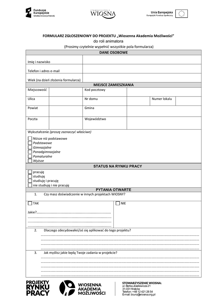 FORMULARZ ZGŁOSZENIOWY DO PROJEKTU „Wiosenna Akademia Możliwości” do roli animatora (Prosimy czytelnie wypełnić wszystkie pola formularza) DANE OSOBOWE Imię i nazwisko Telefon i adres e-mail Wiek (na dzień złożenia formularza) MIEJSCE ZAMIESZKANIA Miejscowość Kod pocztowy Ulica Nr domu Powiat Gmina Poczta Województwo Numer lokalu Wykształcenie (proszę zaznaczyć właściwe) Niższe niż podstawowe Podstawowe Gimnazjalne Ponadgimnazjalne Pomaturalne Wyższe STATUS NA RYNKU PRACY pracuję studiuję studiuję i pracuję nie studiuję i nie pracuję 1. TAK PYTANIA OTWARTE Czy masz doświadczenie w innych projektach WIOSNY? NIE Jakie?................................................................................. ........................................................................................... ........................................................................................... ........................................................................................... 2. Dlaczego zdecydowałeś/aś się aplikować do tego projektu? ……………………………………………………………………………………………………………………………………………………………………… ……………………………………………………………………………………………………………………………………………………………………… ……………………………………………………………………………………………………………………………………………………………………… ……………………………………………………………………………………………………………………………………………………………………… 3. Jak myślisz jakie będą Twoje zadania w projekcie? ……………………………………………………………………………………………………………………………………………………………………… ……………………………………………………………………………………………………………………………………………………………………… ……………………………………………………………………………………………………………………………………………………………………… ……………………………………………………………………………………………………………………………………………………………………… ……………………………………………………………………………………………………………………………………………………………………… STOWARZYSZENIE WIOSNA: ul. Berka Joselewicza 21 31-031 Kraków Telefon: +48 12 421 28 54 E-mail: [email protected] 1. 2. 3. 4. 5. 4. Jakie masz doświadczenie w pracy z osobami niepełnosprawnymi/ bezrobotnymi/biernymi zawodowo? ……………………………………………………………………………………………………………………………………………………………………… ……………………………………………………………………………………………………………………………………………………………………… ……………………………………………………………………………………………………………………………………………………………………… ……………………………………………………………………………………………………………………………………………………………………… 5. Jak myślisz co jest ważne w pracy z osobami wskazanymi w pytaniu powyżej? (wymień 3 rzeczy i uzasadnij) ……………………………………………………………………………………………………………………………………………………………………… ……………………………………………………………………………………………………………………………………………………………………… ……………………………………………………………………………………………………………………………………………………………………… ……………………………………………………………………………………………………………………………………………………………………… ……………………………………………………………………………………………………………………………………………………………………… ……………………………………………………………………………………………………………………………………………………………………… ……………………………………………………………………………………………………………………………………………………………………… OŚWIADCZENIA Wyrażam zgodę na przetwarzanie moich danych osobowych, dla potrzeb niezbędnych do realizacji projektu pn. „Wiosenna Akademia Możliwości” realizowanego w ramach Programu Operacyjnego Wiedza Edukacja Rozwój na lata 2014 – 2020 (POWR) (zgodnie z Ustawą z dnia 29.08.1997 roku o Ochronie Danych Osobowych; tekst jednolity: Dz. U. z 2002r. Nr 101, poz. 926 ze zm.). Administratorem moich danych osobowych jest Minister Rozwoju pełniący funkcję Instytucji Zarządzającej dla Programu Operacyjnego Wiedza Edukacja Rozwój 2014-2020, mający siedzibę przy ul. Wspólnej 2/4, 00-926 Warszawa Mam prawo dostępu do treści swoich danych i ich poprawiania. Zostałem/am poinformowany/a, że projekt jest w