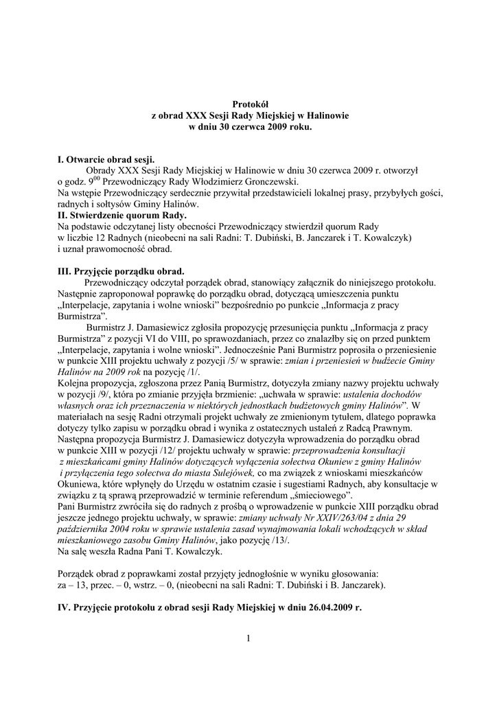 Protokół z obrad XXX Sesji Rady Miejskiej w Halinowie w dniu 30 czerwca 2009 roku. I. Otwarcie obrad sesji. Obrady XXX Sesji Rady Miejskiej w Halinowie w dniu 30 czerwca 2009 r. otworzył o godz. 900 Przewodniczący Rady Włodzimierz Gronczewski. Na wstępie Przewodniczący serdecznie przywitał przedstawicieli lokalnej prasy, przybyłych gości, radnych i sołtysów Gminy Halinów. II. Stwierdzenie quorum Rady. Na podstawie odczytanej listy obecności Przewodniczący stwierdził quorum Rady w liczbie 12 Radnych (nieobecni na sali Radni: T. Dubiński, B. Janczarek i T. Kowalczyk) i uznał prawomocność obrad. III. Przyjęcie porządku obrad. Przewodniczący odczytał porządek obrad, stanowiący załącznik do niniejszego protokołu. Następnie zaproponował poprawkę do porządku obrad, dotyczącą umieszczenia punktu „Interpelacje, zapytania i wolne wnioski” bezpośrednio po punkcie „Informacja z pracy Burmistrza”. Burmistrz J. Damasiewicz zgłosiła propozycję przesunięcia punktu „Informacja z pracy Burmistrza” z pozycji VI do VIII, po sprawozdaniach, przez co znalazłby się on przed punktem „Interpelacje, zapytania i wolne wnioski”. Jednocześnie Pani Burmistrz poprosiła o przeniesienie w punkcie XIII projektu uchwały z pozycji /5/ w sprawie: zmian i przeniesień w budżecie Gminy Halinów na 2009 rok na pozycję /1/. Kolejna propozycja, zgłoszona przez Panią Burmistrz, dotyczyła zmiany nazwy projektu uchwały w pozycji /9/, która po zmianie przyjęła brzmienie: „uchwała w sprawie: ustalenia dochodów własnych oraz ich przeznaczenia w niektórych jednostkach budżetowych gminy Halinów”. W materiałach na sesję Radni otrzymali projekt uchwały ze zmienionym tytułem, dlatego poprawka dotyczy tylko zapisu w porządku obrad i wynika z ostatecznych ustaleń z Radcą Prawnym. Następna propozycja Burmistrz J. Damasiewicz dotyczyła wprowadzenia do porządku obrad w punkcie XIII w pozycji /12/ projektu uchwały w sprawie: przeprowadzenia konsultacji z mieszkańcami gminy Halinów dotyczących wyłączenia sołectwa Okuniew z gminy Halinów i przyłączenia tego sołectwa do miasta Sulejówek, co ma związek z wnioskami mieszkańców Okuniewa, które wpłynęły do Urzędu w ostatnim czasie i sugestiami Radnych, aby konsultacje w związku z tą sprawą przeprowadzić w terminie referendum „śmieciowego”. Pani Burmistrz zwróciła się do radnych z prośbą o wprowadzenie w punkcie XIII porządku obrad jeszcze jednego projektu uchwały, w sprawie: zmiany uchwały Nr XXIV/263/04 z dnia 29 października 2004 roku w sprawie ustalenia zasad wynajmowania lokali wchodzących w skład mieszkaniowego zasobu Gminy Halinów, jako pozycję /13/. Na salę weszła Radna Pani T. Kowalczyk. Porządek obrad z poprawkami został przyjęty jednogłośnie w wyniku głosowania: za – 13, przec. – 0, wstrz. – 0, (nieobecni na sali Radni: T. Dubiński i B. Janczarek). IV. Przyjęcie protokołu z obrad sesji Rady Miejskiej w dniu 26.04.2009 r. 1 Protokół przyjęto bez uwag w wyniku głosowania: za – 12, przec. – 0, wstrz. – 1, (nieobecni na sali Radni: T. Dubiński i B. Janczarek). V. Przyjęcie protokołu z obrad sesji Rady Miejskiej w dniu 29.05.2009 r. Protokół został przyjęty bez uwag jednogłośnie: za – 13, przec. – 0, wstrz. – 0, (nieobecni na sali Radni: T. Dubiński i B. Janczarek). VI. Sprawozdanie z realizacji zadań w zakresie polityki społecznej w 2008 roku. Podinsp. ds. polityki społecznej Pan D. Stec przedstawił zebranym sprawozdanie, w którym omówił zakres oraz szczegółowe działania podejmowane w związku z realizacją zadań polityki społecznej w Gminie Halinów w minionym roku. Sprawozdanie to stanowi załącznik do niniejszego protokołu. Radny Pan J. Stankiewicz odniósł się do wymienionego w sprawozdaniu programu "Uczeń na wsi - pomoc w zdobyciu wykształcenia przez osoby niepełnosprawne zamieszkujące gminy wiejskie i gminy wiejsko - miejskie" i zapytał, na czym ta pomoc polega w praktyce oraz czy są w gminie osoby, które taką pomoc uzyskały. Pan D. Stec wyjaśnił, że pomoc dotyczy finansowania np. zakupu książek, zajęć poprawiających sprawność psychiczną i fizyczną, dodatkowej pomocy pedagogicznej. W programie uczestniczy 17 dzieci z terenu gminy. Na pytanie Radnej Pani G. Matuszewska o formę, w jakiej rozliczają się rodzice, Pan D. Stec odpowiedział, że mogą to być faktury Vat lub rachunki. Rodzice najpierw otrzymują pieniądze, a następnie są zobowiązani rozliczyć się z nich w terminie do 30.06. b.r. Na salę wszedł Radny B. Janczarek. Kierownik MOPS Pani K. Chróścicka przedstawiła "Sprawozdanie z działalności Miejskiego Ośrodka Pomocy Społecznej w Halinowie w 2008 roku". Omówiła w nim zadania realizowane przez Ośrodek, a wynikające z ustaw oraz inne działania mające na celu wsparcie zarówno finansowe, rzeczowe jak i merytoryczne osób uprawnionych do korzystania z pomocy społecznej. Sprawozdanie to stanowi załącznik do niniejszego protokołu. Pani K. Chróścicka zwróciła uwagę na istotną rolę świadczeń w formie pracy socjalnej, które nie są tak wymierne jak pomoc finansowa, ale znacznie trudniejsze i wymagające dużego zaangażowania ze strony pracowników socjalnych, tym bardziej, że brak jest ze strony państwa systemowych działań w kierunku rozwiązywania i niwelowania problemów społecznych. Pani Kierownik z satysfakcją wskazała również na nowy instrument do pracy, jaki Ośrodek otrzymał w ubiegłym roku, a mianowicie projekt systemowy w ramach Priorytetu VII Programu Operacyjnego Kapitał Ludzki Działanie 7.1 Podziałanie 7.1.1 „Rozwój i upowszechnienie aktywnej integracji przez ośrodki pomocy społecznej”, skierowany do osób bezrobotnych, długotrwale korzystających z pomocy społecznej. W czasie jego realizacji podjęto szereg działań, mających na celu aktywizację zawodową tych osób. W ramach programu zawarto 13 kontraktów 