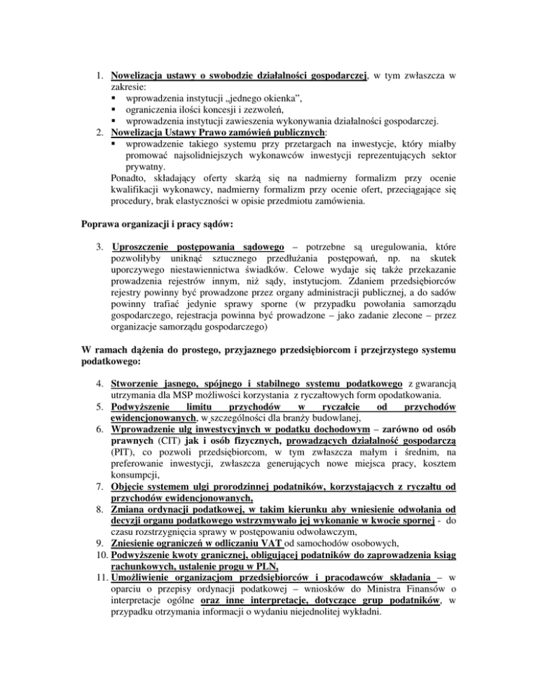 1. Nowelizacja ustawy o swobodzie działalności gospodarczej, w tym zwłaszcza w zakresie: wprowadzenia instytucji „jednego okienka”, ograniczenia ilości koncesji i zezwoleń, wprowadzenia instytucji zawieszenia wykonywania działalności gospodarczej. 2. Nowelizacja Ustawy Prawo zamówień publicznych: wprowadzenie takiego systemu przy przetargach na inwestycje, który miałby promować najsolidniejszych wykonawców inwestycji reprezentujących sektor prywatny. Ponadto, składający oferty skarżą się na nadmierny formalizm przy ocenie kwalifikacji wykonawcy, nadmierny formalizm przy ocenie ofert, przeciągające się procedury, brak elastyczności w opisie przedmiotu zamówienia. Poprawa organizacji i pracy sądów: 3. Uproszczenie postępowania sądowego – potrzebne są uregulowania, które pozwoliłyby uniknąć sztucznego przedłużania postępowań, np. na skutek uporczywego niestawiennictwa świadków. Celowe wydaje się także przekazanie prowadzenia rejestrów innym, niż sądy, instytucjom. Zdaniem przedsiębiorców rejestry powinny być prowadzone przez organy administracji publicznej, a do sadów powinny trafiać jedynie sprawy sporne (w przypadku powołania samorządu gospodarczego, rejestracja powinna być prowadzone – jako zadanie zlecone – przez organizacje samorządu gospodarczego) W ramach dążenia do prostego, przyjaznego przedsiębiorcom i przejrzystego systemu podatkowego: 4. Stworzenie jasnego, spójnego i stabilnego systemu podatkowego z gwarancją utrzymania dla MSP możliwości korzystania z ryczałtowych form opodatkowania. 5. Podwyższenie limitu przychodów w ryczałcie od przychodów ewidencjonowanych, w szczególności dla branży budowlanej, 6. Wprowadzenie ulg inwestycyjnych w podatku dochodowym – zarówno od osób prawnych (CIT) jak i osób fizycznych, prowadzących działalność gospodarczą (PIT), co pozwoli przedsiębiorcom, w tym zwłaszcza małym i średnim, na preferowanie inwestycji, zwłaszcza generujących nowe miejsca pracy, kosztem konsumpcji, 7. Objęcie systemem ulgi prorodzinnej podatników, korzystających z ryczałtu od przychodów ewidencjonowanych, 8. Zmiana ordynacji podatkowej, w takim kierunku aby wniesienie odwołania od decyzji organu podatkowego wstrzymywało jej wykonanie w kwocie spornej - do czasu rozstrzygnięcia sprawy w postępowaniu odwoławczym, 9. Zniesienie ograniczeń w odliczaniu VAT od samochodów osobowych, 10. Podwyższenie kwoty granicznej, obligującej podatników do zaprowadzenia ksiąg rachunkowych, ustalenie progu w PLN, 11. Umożliwienie organizacjom przedsiębiorców i pracodawców składania – w oparciu o przepisy ordynacji podatkowej – wniosków do Ministra Finansów o interpretacje ogólne oraz inne interpretacje, dotyczące grup podatników, w przypadku otrzymania informacji o wydaniu niejednolitej wykładni. 12. Pilne uregulowanie kwestii usług on-line dla przedsiębiorców – poprzez wdrożenie rozwiązań, umożliwiających przekazywanie, przechowywanie i przetwarzanie m.in. deklaracji podatkowych on-line (z zachowaniem możliwości przekazu „tradycyjnego” dla firm mikro). W ramach reorientacji polityki społecznej na aktywizację zawodową wszystkich grup społecznych: 13. Ograniczenie możliwości przechodzenia na wcześniejsze emerytury oraz uregulowanie zasad przyznawania emerytur pomostowych. Działaniu temu musi towarzyszyć promocja utrzymywania w zatrudnieniu osób starszych. Dostosowanie do nowego systemu emerytalnego zasad ustalania rent z tytułu niezdolności do pracy (zmiana formuły rentowej). 14. Reforma systemu rehabilitacji zawodowej i społecznej oraz zatrudniania osób niepełnosprawnych. Istotną barierą ograniczającą zatrudnianie osób niepełnosprawnych są niestabilne przepisy regulujące zasady dofinansowania zatrudniania tej grupy osób. Zmiany wymaga też system przyznawania i wypłaty rent socjalnych, który w swoim obecnym kształcie hamuje aktywność zawodową, szczególnie wśród młodzieży niepełnosprawnej. 15. Likwidacja świadczeń przedemerytalnych. 16. Zmiana systemu przyznawania zasiłków dla bezrobotnych i świadczeń z ubezpieczenia zdrowotnego, co pozwoli wyeliminować potencjalne ryzyko ich demotywującego oddziaływania na osoby bezrobotne. 17. Ukierunkowanie polityki rynku pracy na osoby znajdujące się w szczególnej sytuacji, w tym na osoby starsze, kobiety, niepełnosprawnych oraz osoby o najniższych kwalifikacjach. 18. Zwiększanie efektywności i jakości usług zatrudnieniowych, świadczonych i dostarczanych bezrobotnym oraz zwiększanie otwartości instytucji publicznych na zewnętrzne kontraktowanie tych usług. 19. Uzależnienie uzyskiwania świadczeń z pomocy społecznej przez osoby zdolne do pracy od aktywności w poszukiwaniu zatrudnienia i podnoszeniu kwalifikacji. Pomoc w powrocie na rynek pracy powinna być celem, zaś metody jej realizacji warunkiem pomocy. Konieczne jest właściwe adresowanie świadczeń i usług po to, by trafiała ona do osób najbardziej potrzebujących. W ramach tworzenia warunków dla nowoczesnego rynku pracy z wykształconymi i mobilnymi pracownikami dzięki dostosowaniu modelu edukacji do zmieniających się potrzeb rynku pracy 20. Powiązanie programów edukacji zawodowej z metodami i warunkami pracy w przedsiębiorstwie, co pozwoli na uzyskanie doświadczenia zawodowego już na etapie nauki. 21. Rewizja programów nauczania w zawodowych szkołach ponadgimnazjalnych idąca w kierunku zwiększenia ilości godzin przeznaczonych na naukę praktyczną zawodu i to zarówno w systemie szkół zawodowych, jak i w procesie przygotowania zawodowego młodocianych pracowników u przedsiębiorcy. 22. Przywrócenie rangi szkolnictwa zawodowego przygotowującego do podjęcia pracy także w formie samozatrudnienie oraz w małym i średnim biznesie. 23. Stworzenie powszechnego modelu edukacji ustawicznej oraz wypracowanie systemu finansowania zakładowego procesu podnoszenia kompetencji i kwalifik
