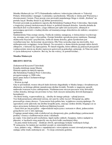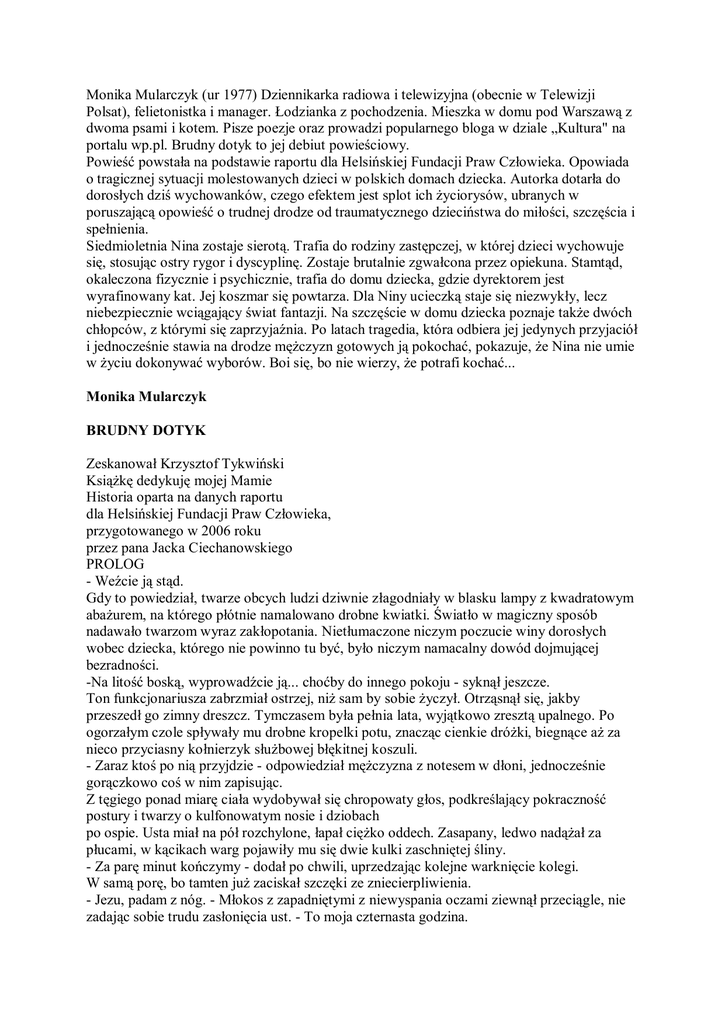 Monika Mularczyk (ur 1977) Dziennikarka radiowa i telewizyjna (obecnie w Telewizji Polsat), felietonistka i manager. Łodzianka z pochodzenia. Mieszka w domu pod Warszawą z dwoma psami i kotem. Pisze poezje oraz prowadzi popularnego bloga w dziale „Kultura" na portalu wp.pl. Brudny dotyk to jej debiut powieściowy. Powieść powstała na podstawie raportu dla Helsińskiej Fundacji Praw Człowieka. Opowiada o tragicznej sytuacji molestowanych dzieci w polskich domach dziecka. Autorka dotarła do dorosłych dziś wychowanków, czego efektem jest splot ich życiorysów, ubranych w poruszającą opowieść o trudnej drodze od traumatycznego dzieciństwa do miłości, szczęścia i spełnienia. Siedmioletnia Nina zostaje sierotą. Trafia do rodziny zastępczej, w której dzieci wychowuje się, stosując ostry rygor i dyscyplinę. Zostaje brutalnie zgwałcona przez opiekuna. Stamtąd, okaleczona fizycznie i psychicznie, trafia do domu dziecka, gdzie dyrektorem jest wyrafinowany kat. Jej koszmar się powtarza. Dla Niny ucieczką staje się niezwykły, lecz niebezpiecznie wciągający świat fantazji. Na szczęście w domu dziecka poznaje także dwóch chłopców, z którymi się zaprzyjaźnia. Po latach tragedia, która odbiera jej jedynych przyjaciół i jednocześnie stawia na drodze mężczyzn gotowych ją pokochać, pokazuje, że Nina nie umie w życiu dokonywać wyborów. Boi się, bo nie wierzy, że potrafi kochać... Monika Mularczyk BRUDNY DOTYK Zeskanował Krzysztof Tykwiński Książkę dedykuję mojej Mamie Historia oparta na danych raportu dla Helsińskiej Fundacji Praw Człowieka, przygotowanego w 2006 roku przez pana Jacka Ciechanowskiego PROLOG - Weźcie ją stąd. Gdy to powiedział, twarze obcych ludzi dziwnie złagodniały w blasku lampy z kwadratowym abażurem, na którego płótnie namalowano drobne kwiatki. Światło w magiczny sposób nadawało twarzom wyraz zakłopotania. Nietłumaczone niczym poczucie winy dorosłych wobec dziecka, którego nie powinno tu być, było niczym namacalny dowód dojmującej bezradności. -Na litość boską, wyprowadźcie ją... choćby do innego pokoju - syknął jeszcze. Ton funkcjonariusza zabrzmiał ostrzej, niż sam by sobie życzył. Otrząsnął się, jakby przeszedł go zimny dreszcz. Tymczasem była pełnia lata, wyjątkowo zresztą upalnego. Po ogorzałym czole spływały mu drobne kropelki potu, znacząc cienkie dróżki, biegnące aż za nieco przyciasny kołnierzyk służbowej błękitnej koszuli. - Zaraz ktoś po nią przyjdzie - odpowiedział mężczyzna z notesem w dłoni, jednocześnie gorączkowo coś w nim zapisując. Z tęgiego ponad miarę ciała wydobywał się chropowaty głos, podkreślający pokraczność postury i twarzy o kulfonowatym nosie i dziobach po ospie. Usta miał na pół rozchylone, łapał ciężko oddech. Zasapany, ledwo nadążał za płucami, w kącikach warg pojawiły mu się dwie kulki zaschniętej śliny. - Za parę minut kończymy - dodał po chwili, uprzedzając kolejne warknięcie kolegi. W samą porę, bo tamten już zaciskał szczęki ze zniecierpliwienia. - Jezu, padam z nóg. - Młokos z zapadniętymi z niewyspania oczami ziewnął przeciągle, nie zadając sobie trudu zasłonięcia ust. - To moja czternasta godzina. Zdenerwowany funkcjonariusz zaklął pod nosem. Energicznym krokiem podszedł do dziewczynki, ale ona tylko przecząco pokręciła głową. Jej przytomne, aż nadto dorosłe spojrzenie przyprawiło go o dreszcz. Ten ruch, tak nieznaczny, a zarazem pełen zdecydowania, zadziwiająco dojrzały w obliczu okoliczności, nagle go onieśmielił. Pokój wypełniła teraz niewygodna cisza, przerywana jedynie chrząknięciami i sapaniem policjantów, aż w końcu do mieszkania weszli lekarze w towarzystwie kobiety. Dziewczynka nadal siedziała na brzeżku taboretu. Jej nogi były zbyt krótkie, by sięgnąć ziemi. Na buzi wyraźnie lśniły ścieżki wytyczone przez łzy. Drobne rączki raz po raz zaciskały się w piąstki. Potargane włosy potęgowały widoczny na twarzy wyraz zagubienia. Była przerażona. Ledwo docierały do niej pytania nieumundurowanej policjantki, która wreszcie się pojawiła. Co z tego, że starała się mówić miękkim i spokojnym głosem? Jak do niej dotrzeć? Myśli w głowie Niny wirowały. Wziąć ją za rękę? Przecież to obca ręka, nie ta co powinna, nie z tą temperaturą skóry, z innym zabarwieniem, bez umalowanych paznokci o pięknym owalu przypominającym migdały. Niech odejdzie, zniknie, przepadnie! - Ze szkoły poszłaś prosto do domu? Przez chwilę mała milczała, wpatrując się w nieco zmęczoną, ale dość przyjazną, pospolitą twarz. Taką, jaką łatwo zapomnieć, jeśli nie ogląda się jej zbyt często. - Tak - szepnęła, choć chciała powiedzieć to głośno i dźwięcznie. Głos jednak rządził się własnymi prawami. - Mamusia bardzo się martwi, jeśli za długo mnie nie ma. - To po co ci klucze? - Zdziwiona kobieta wskazała nieduży ich pęk na kolorowej taśmie, wiszący u drobnej szyi. Dziewczynka spojrzała, zdziwiona niewiedzą funkcjonariuszki. - Jeśli mamusia śpi, trzeba cichutko wchodzić do domu. Mamusia często jest bardzo zmęczona. Przecież jest chora. A w myślach tłukło się jej natrętne „była, była, była" ... Zachłysnęła się w niekontrolowanym odruchu dziecięcego szlochu. Zadziwiająco szybko jednak odzyskała panowanie nad emocjami, biorąc głęboki oddech. -Ale dzisiaj w ogóle nie chciała się obudzić... Nawet zrobiłam jej herbaty... - Łzy popłynęły po jeszcze mokrych policzkach. - Potem zadzwoniłam po pogotowie, a teraz tylu tu ludzi... Czy oni mogą już sobie iść? - Spojrzała błagalnie i głupie łzy znowu przesłoniły jej widok. Głupia, głupia, głupia! Coś tańczyło jej w głowie, tupało i śpiewało w rytm dobrze znanej wyliczanki. Jakże śmieszna się czuła teraz! Co ona sobie w ogóle myśli? Głupia, głupia, głupia! Brzmiało to coraz natarczywiej i coraz