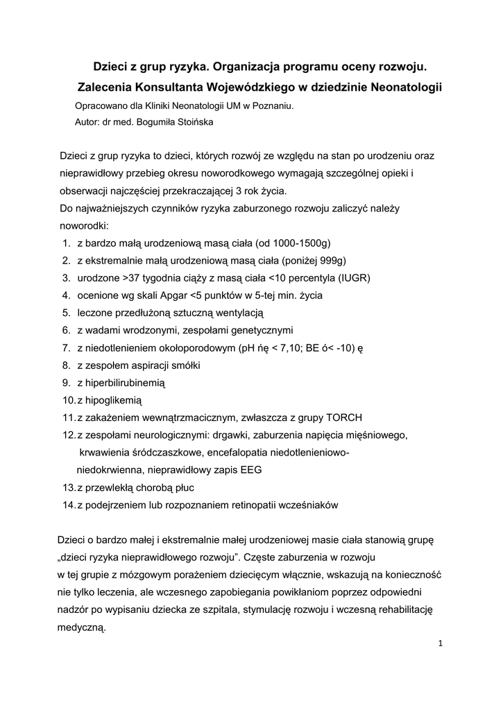 Dzieci z grup ryzyka. Organizacja programu oceny rozwoju. Zalecenia Konsultanta Wojewódzkiego w dziedzinie Neonatologii Opracowano dla Kliniki Neonatologii UM w Poznaniu. Autor: dr med. Bogumiła Stoińska Dzieci z grup ryzyka to dzieci, których rozwój ze względu na stan po urodzeniu oraz nieprawidłowy przebieg okresu noworodkowego wymagają szczególnej opieki i obserwacji najczęściej przekraczającej 3 rok życia. Do najważniejszych czynników ryzyka zaburzonego rozwoju zaliczyć należy noworodki: 1. z bardzo małą urodzeniową masą ciała (od 1000-1500g) 2. z ekstremalnie małą urodzeniową masą ciała (poniżej 999g) 3. urodzone >37 tygodnia ciąży z masą ciała <10 percentyla (IUGR) 4. ocenione wg skali Apgar <5 punktów w 5-tej min. życia 5. leczone przedłużoną sztuczną wentylacją 6. z wadami wrodzonymi, zespołami genetycznymi 7. z niedotlenieniem okołoporodowym (pH ńę < 7,10; BE ó< -10) ę 8. z zespołem aspiracji smółki 9. z hiperbilirubinemią 10. z hipoglikemią 11. z zakażeniem wewnątrzmacicznym, zwłaszcza z grupy TORCH 12. z zespołami neurologicznymi: drgawki, zaburzenia napięcia mięśniowego, krwawienia śródczaszkowe, encefalopatia niedotlenieniowoniedokrwienna, nieprawidłowy zapis EEG 13. z przewlekłą chorobą płuc 14. z podejrzeniem lub rozpoznaniem retinopatii wcześniaków Dzieci o bardzo małej i ekstremalnie małej urodzeniowej masie ciała stanowią grupę „dzieci ryzyka nieprawidłowego rozwoju”. Częste zaburzenia w rozwoju w tej grupie z mózgowym porażeniem dziecięcym włącznie, wskazują na konieczność nie tylko leczenia, ale wczesnego zapobiegania powikłaniom poprzez odpowiedni nadzór po wypisaniu dziecka ze szpitala, stymulację rozwoju i wczesną rehabilitację medyczną. 1 W poradni pracują lekarze specjaliści z zakresu neonatologii i pediatrii, neurolog dziecięcy. Psycholog dziecięcy z umiejętnością oceny rozwoju dzieci w wieku od 0-3 lat, logopeda oraz zespół fizjoterapeutów. Logopeda w poradni zajmuje się dziećmi z zaburzeniami i opóźnieniem w rozwoju mowy, wcześniej w oddziale prowadzi stymulację odruchu ssania głównie u wcześniaków oraz uczy mamy jak prawidłowo karmić dzieci mające problemy (obniżone napięcie mięśniowe, wady w obrębie jamy ustnej). Podobnie zespół fizjoterapeutów prowadzi w oddziale noworodków stymulację ruchową oraz wczesne usprawnianie u dzieci z zaburzeniami napięcia mięśniowego. Uczy mamy opieki nad wcześniakiem, odpowiedniej gimnastyki, masażu, układania dziecka tak aby bezpiecznie i odpowiednio stymulować jego rozwój ruchowy. Cel badań kontrolnych : - wczesna prognoza rozwojowa, kierowanie do dalszej diagnostyki oraz leczenia specjalistycznego, podjęcie wczesnego usprawniania u dzieci z zaburzeniami rozwojowymi - porady dla rodziców dzieci z nieprawidłowym rozwojem, pomoc lekarza, psychologa i terapeuty w rozwiązywaniu powstałych problemów Współpraca zespołu specjalistów neonatologów, pediatrów, chirurgów dziecięcych, neurologów, okulistów, audiologów, psychologa, logopedy, fizjoterapeutów jest podstawą funkcjonowania poradni, umożliwia rozwiązywanie wielu problemów zdrowotnych u dzieci ryzyka. Każdy noworodek kwalifikowany jest wg czynników ryzyka nieprawidłowego rozwoju oraz patologii okresu noworodkowego do programu wczesnego usprawniania. Ocena dzieci po wypisie ze szpitala obejmuje: 1) ocenę stanu ogólnego zdrowia dziecka, wzrastanie i jego trend wg siatek centylowych (długość, masa ciała, obwód głowy, klatki piersiowej). Uwaga: zjawisko „doganiania procesu wzrastania” do przeciętnej populacji rówieśników następuje u wcześniaków skrajnie niedojrzałych między 18. a 36. miesiącem życia, u części z nich w okresie znacznie późniejszym. Przebieg wzrastania zależy od pozycji centylowej dziecka przy urodzeniu i determinuje jego potencjał rozwojowy. 2) ocenę wzroku (badanie okulistyczne, w tym badanie dna oka zgodnie z zaleceniami okulisty) 2 3) ocenę słuchu (za pomocą słuchowych potencjałów wywołanych) 4) ocenę mowy i motoryki 5) ocenę rozwoju psychoruchowego na podstawie testu Brunet-Lezine lub Bayley Scale of Infant Development II (BSID II). 6) kompleksowe badanie po ukończeniu 2-giego miesiąca życia: morfologia z rozmazem, badanie ogólne moczu, usg przezciemiączkowe u dzieci z krwawieniem śródczaszkowym w okresie noworodkowym oraz usg stawów biodrowych. Osiągnięcia rozwojowe oceniamy wg podstawowych sfer rozwojowych: 1. lokomocji i kontroli postawy 2. koordynacji wzrokowo-ruchowej, 3. mowy, 4. kontaktów społecznych. (Tabele „kamienie milowe” rozwoju ruchowego kontaktów społecznych dziecka) Wybrane podstawowe „kamienie milowe” w rozwoju ruchowym dziecka: Sprawność (kamienie milowe) czas osiągnięcia umiejętności samodzielnie siedzi przez chwilę 4-8 mies. przewraca się z pleców na brzuch 5-10 mies. posadzony siedzi pewnie 5-9 mies. siada samodzielnie 6-11 mies. podciąga się do stania 6-12 mies. raczkowanie 9-12 mies. stoi samodzielnie 9-16 mies. wykonuje3 kroki samodzielnie 9-17 mies. średni czas 5,3 mies. 6,4 mies. 6,6 mies. 8,3 mies. 8,6 mies. 10,8 mies. 11,0 mies. 11,7 mies Podstawowe kamienie milowe w rozwoju mowy i kontaktów społecznych u dziecka: kolejne umiejętności (kamienie milowe) czas pojawienia się umiejętności odpowiada uśmiechem na uśmiech 2-3 śmieje się głośno i gaworzy (aa, guu, de) 4-5 gaworzy wymawiając sylaby np. „ma-ma” bez 7-8 zrozumienia wymawia 1-sze słowa dwusylabowe ze 9-11 zrozumieniem (np.: ma-ma; ba-ba) naśladuje czynności np.: „pa-pa”, „kosi-kosi” 9-10 wymawia 1-sze 2-3 słowa dwusylabowe 12-16 (mama, tata, baba) 3 Mówi około 8 słów; sygnalizuje potrzeby 18-24 fizjologiczne Ocenę rozwoju u wcześniaków prowadzi się według tzw. „wieku skorygowanego” do ukończenia przez dziecko 2 roku życia. Powyżej 2-3 roku życia dzieci urodzone przedwcześnie powinny osiągnąć rozwój po