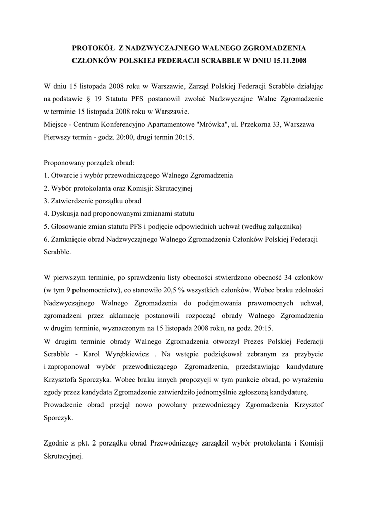 PROTOKÓŁ Z NADZWYCZAJNEGO WALNEGO ZGROMADZENIA CZŁONKÓW POLSKIEJ FEDERACJI SCRABBLE W DNIU 15.11.2008 W dniu 15 listopada 2008 roku w Warszawie, Zarząd Polskiej Federacji Scrabble działając na podstawie § 19 Statutu PFS postanowił zwołać Nadzwyczajne Walne Zgromadzenie w terminie 15 listopada 2008 roku w Warszawie. Miejsce - Centrum Konferencyjno Apartamentowe "Mrówka", ul. Przekorna 33, Warszawa Pierwszy termin - godz. 20:00, drugi termin 20:15. Proponowany porządek obrad: 1. Otwarcie i wybór przewodniczącego Walnego Zgromadzenia 2. Wybór protokolanta oraz Komisji: Skrutacyjnej 3. Zatwierdzenie porządku obrad 4. Dyskusja nad proponowanymi zmianami statutu 5. Głosowanie zmian statutu PFS i podjęcie odpowiednich uchwał (według załącznika) 6. Zamknięcie obrad Nadzwyczajnego Walnego Zgromadzenia Członków Polskiej Federacji Scrabble. W pierwszym terminie, po sprawdzeniu listy obecności stwierdzono obecność 34 członków (w tym 9 pełnomocnictw), co stanowiło 20,5 % wszystkich członków. Wobec braku zdolności Nadzwyczajnego Walnego Zgromadzenia do podejmowania prawomocnych uchwał, zgromadzeni przez aklamację postanowili rozpocząć obrady Walnego Zgromadzenia w drugim terminie, wyznaczonym na 15 listopada 2008 roku, na godz. 20:15. W drugim terminie obrady Walnego Zgromadzenia otworzył Prezes Polskiej Federacji Scrabble - Karol Wyrębkiewicz . Na wstępie podziękował zebranym za przybycie i zaproponował wybór przewodniczącego Zgromadzenia, przedstawiając kandydaturę Krzysztofa Sporczyka. Wobec braku innych propozycji w tym punkcie obrad, po wyraŜeniu zgody przez kandydata Zgromadzenie zatwierdziło jednomyślnie zgłoszoną kandydaturę. Prowadzenie obrad przejął nowo powołany przewodniczący Zgromadzenia Krzysztof Sporczyk. Zgodnie z pkt. 2 porządku obrad Przewodniczący zarządził wybór protokolanta i Komisji Skrutacyjnej. Zgłoszone kandydatury : Wojciech Sołdan – protokolant Tomasz Suchanek – Komisja Skrutacyjna Jakub Koisar – Komisja Skrutacyjna zgromadzeni zaakceptowali jednomyślnie. Następnie Przewodniczący poprosił Komisję Skrutacyjną o sprawdzenie ilości zebranych i potwierdzenie zdolności Zgromadzenia do podejmowania prawomocnych uchwał, co komisja potwierdziła. W tej sytuacji Przewodniczący Zgromadzenia poinformował zebranych, Ŝe zgodnie z §19 pkt. 1 Statutu Polskiej Federacji Scrabble Nadzwyczajne Walne Zgromadzenie obraduje nad sprawami, dla których zostało zwołane. Wobec powyŜszego zaprosił zebranych do dyskusji nad zmianami statutu. Na wstępie dyskusji przewodniczący omówił proponowane zmiany i uzasadnił konieczność ich wprowadzenia. Argumentował, Ŝe w ostatnich latach liczebność członków Stowarzyszenia oraz frekwencja na turniejach systematycznie maleją. Atrakcyjność organizowanych turniejów i proponowanych w nich nagród spowszedniały. Działając w obecnych warunkach statutowych Zarząd napotyka coraz silniejsze ograniczenia w pozyskiwaniu środków na cele statutowe. By przeciwdziałać tym niekorzystnym tendencjom PFS rozpoczęła w 2008 roku działania związane z realizacją programu „Scrabble w Szkole”. Do chwili obecnej w całej Polsce powstało 17 szkolnych kół scrabblowych, w części działających w oparciu o pozyskane na wniosek PFS-u środki finansowe z funduszy gminnych. W ramach programu zorganizowano w sierpniu 2008 roku, w Wiśle, pierwsze szkolenie nauczycieli w grze w scrabble. Nad programem „Scrabble w szkole” kilku posłów na Sejm RP objęło patronat honorowy. W ramach programu PFS prowadzi rozliczenie pozyskanych środków z gminami. W grudniu 2008 roku przewidziano pierwsze zawody międzyszkolne dla uczestników szkolnych kółek scrabblowych, podsumowujące pierwszy rok działania programu. Przewodniczący podkreślił, Ŝe te wszystkie działania były moŜliwe dzięki pracy i zaangaŜowaniu Anny Arany jako Koordynatora Programu. W tym celu Zarząd proponuje zmiany statutu umoŜliwiające ubieganie się o status organizacji poŜytku publicznego oraz rozpoczęcie działalności gospodarczej przez PFS. W toku dyskusji głos zabierali ; Mariola Osajda-Matczak – stwierdziła, Ŝe oczekiwałaby od Zarządu analizy kosztów zmian i prognozowanych zysków, najlepiej w postaci biznes-planu zamierzonych przedsięwzięć. Poddała w wątpliwość celowość starań o status organizacji poŜytku publicznego, twierdząc Ŝe nie przyniesie on spodziewanych efektów i powołując się na statystyki GUS-u w tym zakresie. Jarosław Sobczak – poprosił o sprecyzowanie kosztów zmian statutowych oraz stwierdził, iŜ przy podjęciu działalności gospodarczej warto skorzystać z doświadczeń organizacji pozarządowych zajmujących się doradztwem w tym zakresie, takimi jak Stowarzyszenie Klon-Jawor, WRZOS (Wspólnota Robocza Związków Organizacji Socjalnych), Grzegorz Koczkodon – poparł Jarosława Sobczaka i zaproponował, by zobligować Zarząd do podjęcia współpracy z organizacjami pozarządowymi, co Przewodniczący przyjął do akceptującej wiadomości, takŜe w imieniu Zarządu PFS. Przewodniczący Krzysztof Sporczyk poinformował zebranych o kosztach bezpośrednich związanych ze zgłoszeniem proponowanych zmian do Krajowego Rejestru Sądowego, stwierdzając, Ŝe koszt zgłoszenia działalności gospodarczej to 1.500,00 zł, a wystąpienie o nadanie statusu organizacji poŜytku publicznego to opłata w kwocie 250,00 zł. W odpowiedzi na pytanie Marioli Osajdy-Matczak skarbnik PFS – Rafał Wesołowski potwierdził posiadanie przez federację środków na te cele. Następnie odpowiadając na wątpliwości Marioli Osajdy-Matczak, Krzysztof Sporczyk powiedział, Ŝe w jego opinii jako członka Zarządu PFS, zadaniem Zarządu jako organu działającego całkowicie społecznie, jest przede wszystkim tworzenie warunków do realizacji inicjatyw członków federacji, takŜe poprzez zmiany statutowe – a nie przygotowanie gotowych rozwiązań biznesowych.