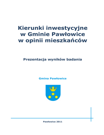 Kierunki inwestycyjne w Gminie Pawłowice w opinii mieszkańców Prezentacja wyników badania Gmina Pawłowice Pawłowice 2011 I. Wstęp Badanie dotyczące kierunków inwestycyjnych w Gminie Pawłowice zrealizowano w terminie od 19 września do 31 października 2011 roku. Celem zadowolenia badania z było poznanie dotychczas opinii mieszkańców realizowanych działań oraz dotyczących poznanie poziomu oczekiwań i potrzeb co do przyszłych działań inwestycyjnych. Dążono również do zbadania oczekiwań mieszkańców, co do inwestycji realizowanych zarówno na terenie całej gminy, jak i w poszczególnych sołectwach. Przedstawione opracowanie stanowi podsumowanie i zestawienie najważniejszych wyników uzyskanych w toku badania. Kwestionariusz ankiety został umieszczony w Internecie – na portalu badawczym E-badania.pl. Oprócz tego przygotowano ankiety w wersji papierowej, które były dostępne w budynkach Urzędu Gminy przy ul. Zjednoczenia 65 oraz 67. Część ankiet została również rozdysponowana za pośrednictwem sołtysów oraz przeprowadzona z uczniami z Zespołu Szkół Ogólnokształcących w Pawłowicach. W toku badania uzyskano 157 ankiet wypełnionych za pośrednictwem Internetu oraz 174 ankiety papierowe, co daje łącznie 331 wypełnionych ankiet. Przebadanie takiej liczby respondentów pozwala na oszacowanie błędu statystycznego na poziomie ok. 5%. Kwestionariusz ankiety zawierał 10 pytań dotyczących przedmiotu badania oraz 4 pytania metryczkowe, pozwalające na dokonanie opisu badanej próby pod względem płci, wieku, wykształcenia oraz miejsca zamieszkania. Spośród ogółu badanych 56,8% (188 osób) stanowiły kobiety, a 43,2% (143 osoby) mężczyźni (rys. 1). Rysunek 1. Płeć respondentów. 43,2% 56,8% Kobiety Mężczyźni 2 Wiek respondentów biorących udział w badaniu był zróżnicowany. Jedną trzecią ogółu stanowiły osoby pomiędzy 25 a 35 rokiem życia. Odsetek respondentów z pozostałych kategorii wiekowych rozkładał się proporcjonalnie i oscylował wokół 15-20% (tab. 1). Tabela 1. Wiek respondentów. Liczba osób 64 112 49 55 51 331 Wiek <25 25-35 36-45 46-55 >55 suma % 19,3% 33,9% 14,8% 16,6% 15,4% 100,0% Również wykształcenie osób biorących udział w ankiecie nie było jednolite. W badanej próbie przeważały osoby z wykształceniem średnim (133 osoby) i wyższym (122 osoby) (rys. 2). Rysunek 2. Wykształcenie respondentów. Wyższe 36,9% Średnie 40,2% 17,2% Zawodowe Podstawowe/ gimnazjalne 0,0% 5,7% 20,0% 40,0% 60,0% Dążąc do uzyskania jak najbardziej wiarygodnych wyników badania, starano się przeprowadzić ankiety z reprezentantami każdego z sołectw. Największy odsetek badanych stanowili mieszkańcy sołectwa Pawłowice. Wynik ten jest odzwierciedleniem stanu rzeczywistego, bowiem zgodnie z danymi demograficznymi1, ludność sołectwa Pawłowice (w tym osiedla) stanowi 54% mieszkańców całej gminy. 1 Dane z dnia 2 września 2011. Liczba mieszkańców Gminy Pawłowice zameldowanych na pobyt stały. 3 W badaniu reprezentanci Pawłowic oraz Pawłowic osiedla stanowili w sumie 47,7% próby badawczej (158 osób). Co dziesiąty badany to mieszkaniec Pielgrzymowic (34 osoby), podobny odsetek stanowili mieszkańcy Warszowic (39 osób) oraz Golasowic (31 osób). Reprezentanci Jarząbkowic stanowili 7,6% ogółu (25 osób), Pniówka 6,9% (23 osoby), a Krzyżowic 6,3% ogółu badanych (21 osób). Rozkład próby ze względu na miejsce zamieszkania przedstawiono graficznie poniżej: Rysunek 3. Miejsce zamieszkania. Warszowice 11,8% Golasowice 9,4% Jarząbkowice 7,6% Pniówek 6,9% Krzyżowice 6,3% Pielgrzymowice 10,3% Pawłowice 19,9% Pawłowiceosiedle 27,8% 4 II. Prezentacja wyników Na wstępie poproszono badanych o dokonanie oceny obecnej infrastruktury znajdującej się na terenie gminy. Wszyscy ankietowani musieli ocenić każdą ze wskazanych kategorii infrastruktury. Uzyskane wyniki prezentuje tabela nr 2. Tabela 2. Jak ocenia Pan/Pani infrastrukturę w gminie Pawłowice? Placówki oświatowe (szkoły i przedszkola) Obiekty użyteczności publicznej Budynki mieszkaniowe Obiekty kulturalne Drogi i chodniki Oświetlenie dróg i miejsc publicznych Parkingi Sieć wodnokanalizacyjna Baza turystyczna Ścieżki rowerowe Obiekty sportowe Place zabaw dla dzieci Tereny zielone, park Bardzo dobrze Dobrze Trudno powiedzieć Źle Bardzo źle suma 39,3% 48,3% 9,1% 2,7% 0,6% 100% 18,7% 7,9% 15,4% 12,1% 60,2% 43,5% 56,8% 48,9% 16,9% 39,0% 18,1% 16,9% 3,6% 8,2% 7,6% 17,3% 0,6% 1,5% 2,1% 4,8% 100% 100% 100% 100% 19,9% 13,3% 52,0% 47,2% 13,9% 21,1% 11,2% 16,6% 3,0% 1,8% 100% 100% 28,1% 5,1% 16,0% 39,0% 22,7% 26,9% 47,2% 23,9% 43,8% 41,7% 41,7% 43,2% 17,2% 48,4% 24,8% 13,0% 17,2% 17,8% 5,7% 18,7% 12,1% 6,0% 16,0% 11,2% 1,8% 3,9% 3,3% 0,3% 2,4% 0,9% 100% 100% 100% 100% 100% 100% Na uwagę zasługuje fakt, że w zasadzie wszystkie rodzaje infrastruktury zostały ocenione przez większość mieszkańców co najmniej dobrze. Na szczególnie wysoka ocenę, w oczach mieszkańców, zasługują placówki oświatowe oraz obiekty sportowe. W obu przypadkach ponad 80% badanych oceniło je dobrze lub bardzo dobrze, przy znaczącym udziale najwyższej możliwej odpowiedzi. Bardzo wysoką ocenę uzyskały również obiekty użyteczności publicznej oraz sieć wodno-kanalizacyjna. Znaczny odsetek bardzo dobrych odpowiedzi uzyskały place zabaw dla dzieci oraz tereny zielone wraz z parkiem. Warto jednak zwrócić uwagę, że przy znacznym odsetku pozytywnych odpowiedzi, 16% ankietowanych źle oceniło place zabaw na terenie gminy. Inaczej sytuacja wyglądała tylko w przypadku bazy turystycznej, gdzie prawie połowa ankietowanych nie potrafiła dokonać jednoznacznej oceny. Jednocześnie, prawie co piąty respondent ocenił jej poziom jako zły. Również w przypadku oceny dróg i chodników na terenie gminy, ponad 17% ankietowanych mieszkańców oceniło je źle przy równoczesnej dobrej i bardzo dobrej ocenie 60% badanych. Warto jednak zwrócić
