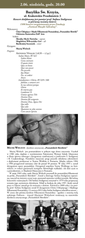 2.06. niedziela, godz. 20.00 Bazylika Św. Krzyża, ul. Krakowskie Przedmieście 3 Koncert dedykowany jest pamięci prof. Stefana Stuligrosza w pierwszą rocznicę śmierci. 1500 koncert zorganizowany przez Fundację „Festiwal Muzyki Sakralnej”. Wykonawcy: Chór Chłopięcy i Męski Filharmonii Poznańskiej „Poznańskie Słowiki” Orkiestra Kameralna Dell’ Arte Soliści: Monika Mych-Nowicka – sopran Magdalena Wilczyńska-Goś – alt Bartłomiej Szczeszek – tenor Dyrygent: Maciej Wieloch Program: Antonio Vivaldi (1678 – 1741) Stabat Mater, RV 621 Stabat Mater Cuius animam O quam tristis Quis est homo Quis non posset Pro peccatis Eja Mater Fac, ut ardeat Amen Introduzione e Gloria, RV 639 i 588 Jubilate, o amoeni cori In tua solemni pompa Gloria Et interra pax Laudamus Te Gratias agimus Tibi Domine Deus Domine fili unigenite Domine Deus, Agnus Dei Qui tollis Qui sedes Quaniam tu solus sanctus Cum sancto Spiritu Maciej Wieloch - dyrektor artystyczny „Poznańskich Słowików” Maciej Wieloch jest poznaniakiem w pełnym tego słowa znaczeniu. Uzyskał w 1980 roku dyplom z wyróżnieniem Państwowej Wyższej Szkoły Muzycznej w klasie śpiewu solowego i dyrygentury symfonicznej u profesorów S. Stuligrosza i R. Czajkowskiego. Prawdziwe muzyczne progi przyszło młodemu człowiekowi z dyplomami przekraczać w Teatrze Wielkim w Poznaniu. Między rokiem 1984 a 1996 przygotował tamtejszy chór do ponad 50 premier. W roku 1995 r. został dyrygentem opery poznańskiej. Dyrygował zespołem Teatru Wielkiego na festiwalach i w trakcie gościnnych występów. Równolegle wykładał, i do dziś czyni to z powodzeniem, w Akademii Muzycznej w Poznaniu. W maju 1965 roku, mały Maciej Wieloch przyszedł do poznańskiej filharmonii na próbę „Poznańskich Słowików”. Został u sławnego Stefana Stuligrosza sopranistą, nauczył się świetnie czytać nuty, poznawał tajemnice wielkiej muzyki. Był solistą koncertów oratoryjnych. Od Stefana Stuligrosza otrzymał w 1979 roku propozycję zostania jego asystentem chóralnym. Pełnił tę funkcję do roku 1997, kiedy nawał pracy w Operze zmusił go do rozstania z chórem. Powrócił w 2009 roku i na prośbę prof. Stefana Stuligrosza został II dyrygentem Chóru Chłopięcego i Męskiego Filharmonii Poznańskiej. 15 czerwca 2012 roku Stefan Stuligrosz odszedł na zawsze... W cztery dni później dyrektor Filharmonii Poznańskiej - zgodnie z ostatnią wolą sędziwego Profesora - wręczył Maciejowi Wielochowi nominację na stanowisko dyrektora artystycznego „Poznańskich Słowików”.