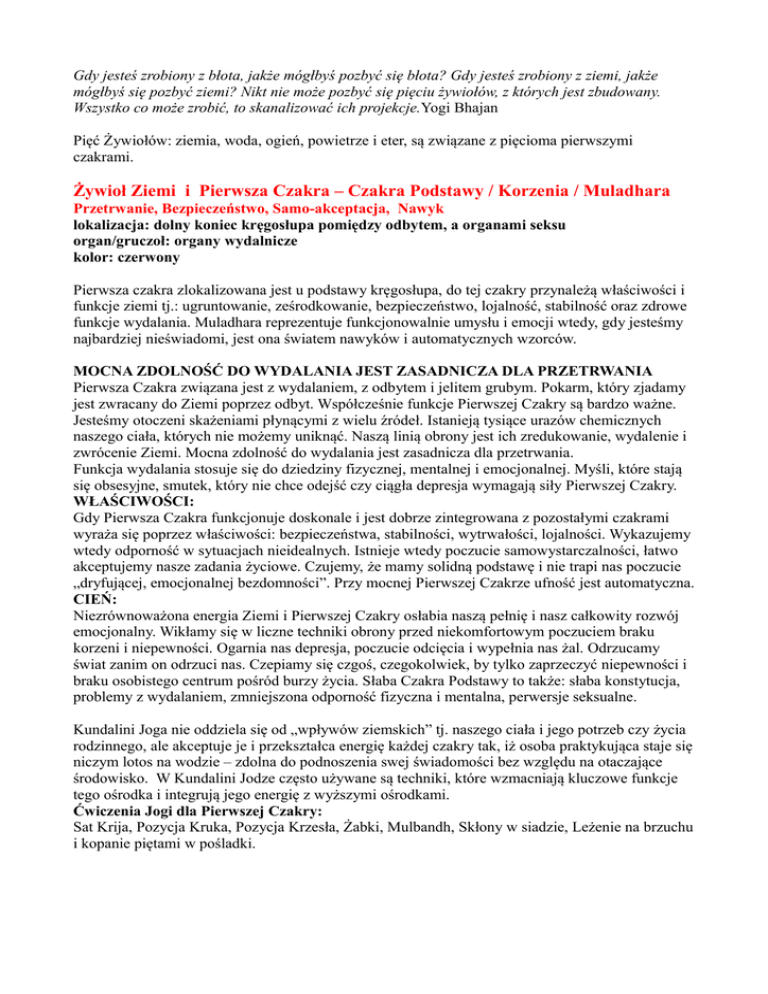 Gdy jesteś zrobiony z błota, jakże mógłbyś pozbyć się błota? Gdy jesteś zrobiony z ziemi, jakże mógłbyś się pozbyć ziemi? Nikt nie może pozbyć się pięciu żywiołów, z których jest zbudowany. Wszystko co może zrobić, to skanalizować ich projekcje.Yogi Bhajan Pięć Żywiołów: ziemia, woda, ogień, powietrze i eter, są związane z pięcioma pierwszymi czakrami. Żywioł Ziemi i Pierwsza Czakra – Czakra Podstawy / Korzenia / Muladhara Przetrwanie, Bezpieczeństwo, Samo-akceptacja, Nawyk lokalizacja: dolny koniec kręgosłupa pomiędzy odbytem, a organami seksu organ/gruczoł: organy wydalnicze kolor: czerwony Pierwsza czakra zlokalizowana jest u podstawy kręgosłupa, do tej czakry przynależą właściwości i funkcje ziemi tj.: ugruntowanie, ześrodkowanie, bezpieczeństwo, lojalność, stabilność oraz zdrowe funkcje wydalania. Muladhara reprezentuje funkcjonowalnie umysłu i emocji wtedy, gdy jesteśmy najbardziej nieświadomi, jest ona światem nawyków i automatycznych wzorców. MOCNA ZDOLNOŚĆ DO WYDALANIA JEST ZASADNICZA DLA PRZETRWANIA Pierwsza Czakra związana jest z wydalaniem, z odbytem i jelitem grubym. Pokarm, który zjadamy jest zwracany do Ziemi poprzez odbyt. Współcześnie funkcje Pierwszej Czakry są bardzo ważne. Jesteśmy otoczeni skażeniami płynącymi z wielu źródeł. Istanieją tysiące urazów chemicznych naszego ciała, których nie możemy uniknąć. Naszą linią obrony jest ich zredukowanie, wydalenie i zwrócenie Ziemi. Mocna zdolność do wydalania jest zasadnicza dla przetrwania. Funkcja wydalania stosuje się do dziedziny fizycznej, mentalnej i emocjonalnej. Myśli, które stają się obsesyjne, smutek, który nie chce odejść czy ciągła depresja wymagają siły Pierwszej Czakry. WŁAŚCIWOŚCI: Gdy Pierwsza Czakra funkcjonuje doskonale i jest dobrze zintegrowana z pozostałymi czakrami wyraża się poprzez właściwości: bezpieczeństwa, stabilności, wytrwałości, lojalności. Wykazujemy wtedy odporność w sytuacjach nieidealnych. Istnieje wtedy poczucie samowystarczalności, łatwo akceptujemy nasze zadania życiowe. Czujemy, że mamy solidną podstawę i nie trapi nas poczucie „dryfującej, emocjonalnej bezdomności”. Przy mocnej Pierwszej Czakrze ufność jest automatyczna. CIEŃ: Niezrównoważona energia Ziemi i Pierwszej Czakry osłabia naszą pełnię i nasz całkowity rozwój emocjonalny. Wikłamy się w liczne techniki obrony przed niekomfortowym poczuciem braku korzeni i niepewności. Ogarnia nas depresja, poczucie odcięcia i wypełnia nas żal. Odrzucamy świat zanim on odrzuci nas. Czepiamy się czgoś, czegokolwiek, by tylko zaprzeczyć niepewności i braku osobistego centrum pośród burzy życia. Słaba Czakra Podstawy to także: słaba konstytucja, problemy z wydalaniem, zmniejszona odporność fizyczna i mentalna, perwersje seksualne. Kundalini Joga nie oddziela się od „wpływów ziemskich” tj. naszego ciała i jego potrzeb czy życia rodzinnego, ale akceptuje je i przekształca energię każdej czakry tak, iż osoba praktykująca staje się niczym lotos na wodzie – zdolna do podnoszenia swej świadomości bez względu na otaczające środowisko. W Kundalini Jodze często używane są techniki, które wzmacniają kluczowe funkcje tego ośrodka i integrują jego energię z wyższymi ośrodkami. Ćwiczenia Jogi dla Pierwszej Czakry: Sat Krija, Pozycja Kruka, Pozycja Krzesła, Żabki, Mulbandh, Skłony w siadzie, Leżenie na brzuchu i kopanie piętami w pośladki.