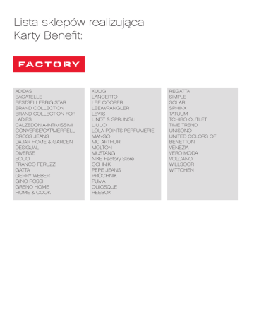 Lista sklepów realizująca Karty Benefit: ADIDAS BAGATELLE BESTSELLERBIG STAR BRAND COLLECTION BRAND COLLECTION FOR LADIES CALZEDONIA-INTIMISSIMI CONVERSE/CAT/MERRELL CROSS JEANS DAJAR HOME & GARDEN DESIGUAL DIVERSE ECCO FRANCO FERUZZI GATTA GERRY WEBER GINO ROSSI GRENO HOME HOME & COOK KULIG LANCERTO LEE COOPER LEE/WRANGLER LEVI’S LINDT & SPRUNGLI LIU.JO LOLA POINTS PERFUMERIE MANGO MC ARTHUR MOLTON MUSTANG NIKE Factory Store OCHNIK PEPE JEANS PRÓCHNIK PUMA QUIOSQUE REEBOK REGATTA SIMPLE SOLAR SPHINX TATUUM TCHIBO OUTLET TIME TREND UNISONO UNITED COLORS OF BENETTON VENEZIA VERO MODA VOLCANO WILLSOOR WITTCHEN