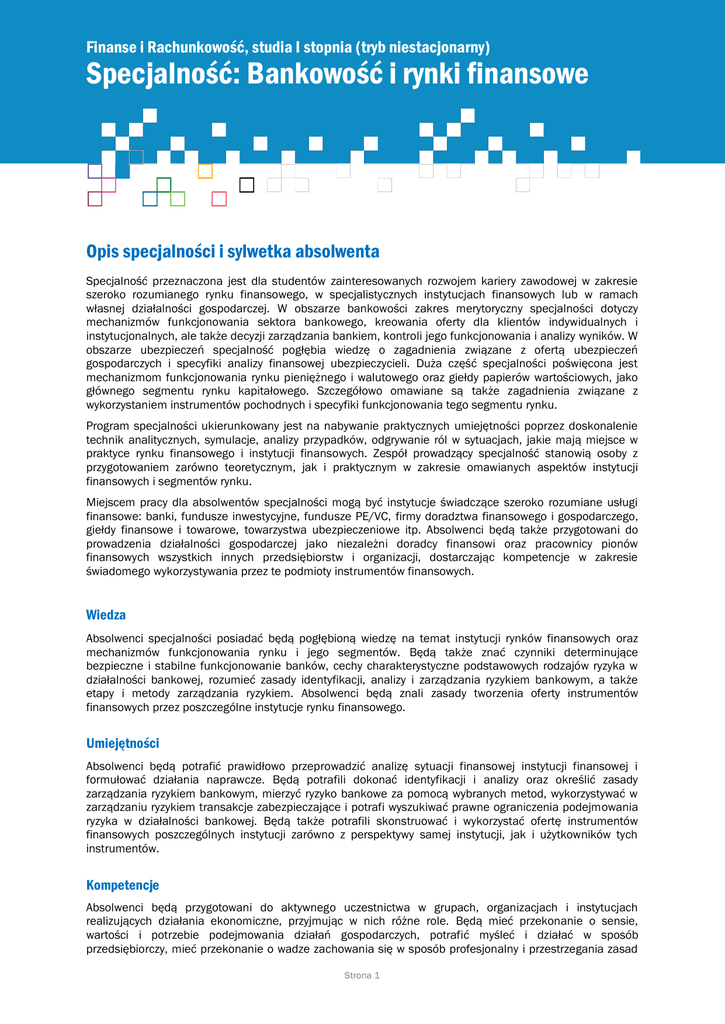Finanse i Rachunkowość, studia I stopnia (tryb niestacjonarny) Specjalność: Bankowość i rynki finansowe Opis specjalności i sylwetka absolwenta Specjalność przeznaczona jest dla studentów zainteresowanych rozwojem kariery zawodowej w zakresie szeroko rozumianego rynku finansowego, w specjalistycznych instytucjach finansowych lub w ramach własnej działalności gospodarczej. W obszarze bankowości zakres merytoryczny specjalności dotyczy mechanizmów funkcjonowania sektora bankowego, kreowania oferty dla klientów indywidualnych i instytucjonalnych, ale także decyzji zarządzania bankiem, kontroli jego funkcjonowania i analizy wyników. W obszarze ubezpieczeń specjalność pogłębia wiedzę o zagadnienia związane z ofertą ubezpieczeń gospodarczych i specyfiki analizy finansowej ubezpieczycieli. Duża część specjalności poświęcona jest mechanizmom funkcjonowania rynku pieniężnego i walutowego oraz giełdy papierów wartościowych, jako głównego segmentu rynku kapitałowego. Szczegółowo omawiane są także zagadnienia związane z wykorzystaniem instrumentów pochodnych i specyfiki funkcjonowania tego segmentu rynku. Program specjalności ukierunkowany jest na nabywanie praktycznych umiejętności poprzez doskonalenie technik analitycznych, symulacje, analizy przypadków, odgrywanie ról w sytuacjach, jakie mają miejsce w praktyce rynku finansowego i instytucji finansowych. Zespół prowadzący specjalność stanowią osoby z przygotowaniem zarówno teoretycznym, jak i praktycznym w zakresie omawianych aspektów instytucji finansowych i segmentów rynku. Miejscem pracy dla absolwentów specjalności mogą być instytucje świadczące szeroko rozumiane usługi finansowe: banki, fundusze inwestycyjne, fundusze PE/VC, firmy doradztwa finansowego i gospodarczego, giełdy finansowe i towarowe, towarzystwa ubezpieczeniowe itp. Absolwenci będą także przygotowani do prowadzenia działalności gospodarczej jako niezależni doradcy finansowi oraz pracownicy pionów finansowych wszystkich innych przedsiębiorstw i organizacji, dostarczając kompetencje w zakresie świadomego wykorzystywania przez te podmioty instrumentów finansowych. Wiedza Absolwenci specjalności posiadać będą pogłębioną wiedzę na temat instytucji rynków finansowych oraz mechanizmów funkcjonowania rynku i jego segmentów. Będą także znać czynniki determinujące bezpieczne i stabilne funkcjonowanie banków, cechy charakterystyczne podstawowych rodzajów ryzyka w działalności bankowej, rozumieć zasady identyfikacji, analizy i zarządzania ryzykiem bankowym, a także etapy i metody zarządzania ryzykiem. Absolwenci będą znali zasady tworzenia oferty instrumentów finansowych przez poszczególne instytucje rynku finansowego. Umiejętności Absolwenci będą potrafić prawidłowo przeprowadzić analizę sytuacji finansowej instytucji finansowej i formułować działania naprawcze. Będą potrafili dokonać identyfikacji i analizy oraz określić zasady zarządzania ryzykiem bankowym, mierzyć ryzyko bankowe za pomocą wybranych metod, wykorzystywać w zarządzaniu ryzykiem transakcje zabezpieczające i potrafi wyszukiwać prawne ograniczenia podejmowania ryzyka w działalności bankowej. Będą także potrafili skonstruować i wykorzystać ofertę instrumentów finansowych poszczególnych instytucji zarówno z perspektywy samej instytucji, jak i użytkowników tych instrumentów. Kompetencje Absolwenci będą przygotowani do aktywnego uczestnictwa w grupach, organizacjach i instytucjach realizujących działania ekonomiczne, przyjmując w nich różne role. Będą mieć przekonanie o sensie, wartości i potrzebie podejmowania działań gospodarczych, potrafić myśleć i działać w sposób przedsiębiorczy, mieć przekonanie o wadze zachowania się w sposób profesjonalny i przestrzegania zasad Strona 1 Finanse i Rachunkowość, studia I stopnia (tryb niestacjonarny) Specjalność: Bankowość i rynki finansowe etyki zawodowej. Absolwenci będą doceniać znaczenie nauk o finansach dla kształtowania relacji finansowych i procesu rozwoju gospodarczego, mieć świadomość poziomu swojej wiedzy i umiejętności, rozumieć potrzebę ciągłego dokształcania się zawodowego i rozwoju osobistego. Wykaz przedmiotów, godzin zajęć i osób prowadzących Przedmiot Bankowość detaliczna i pośrednictwo finansowe Finansowanie nieruchomości Giełda i obrót papierami wartościowymi Rynek pieniężny i walutowy Semestr Godzin Osoba prowadząca V 18E Dr A. Korzeniowska V 9Z Dr J. Świderska V 27E Dr R. Asyngier V 18Z Dr E. Widz Dr hab. T. Bednarczyk Ubezpieczenia w działalności gospodarczej Analiza finansowa banku i instytucji ubezpieczeniowej Bankowość korporacyjna V 18Z VI 18Z Dr W. Misterek VI 18E Dr J. Świderska Controlling bankowy VI 18Z Dr A. Korzeniowska Instrumenty pochodne VI 27E Dr hab. H. Mamcarz, prof. nadzw. Dr R. Asyngier Zarządzanie ryzykiem bankowym VI 9Z Dr T. Galbarczyk E – egzamin, Z - zaliczenie Treści programowe przedmiotów Bankowość detaliczna i pośrednictwo finansowe (9W - wykład, 9C - ćwiczenia) Kierunki rozwoju współczesnej bankowości detalicznej. Sektor bankowości detalicznej w Polsce (wielkość sektora, oddziaływanie na gospodarkę). Segmentacja klientów detalicznych (klient standardowy, HNWI, MŚP). Produkty oszczędnościowe i inwestycyjne skierowane do osób fizycznych i sektora MŚP. Lokowanie nadwyżek finansowych gospodarstw domowych substytucja produktów depozytowych (oferta standardowa i wealth management). Potrzeby finansowe sektora gospodarstw domowych. Metody oceny zdolności kredytowej osób fizycznych i MŚP. Kredyty konsumpcyjne i alternatywne produkty pozabankowe. Produkty rozliczeniowe dla segmentu detalicznego. Czynniki przewagi konkurencyjnej na rynku detalicznych produktów bankowych. Finansowanie nieruchomości (9W - wykład) Uwarunkowania rozwoju systemu finansowania nieruchomości w Polsce. Działania regulacyjne a system 
