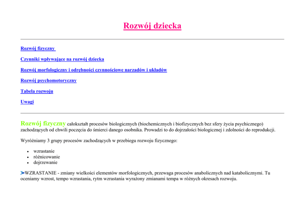 Rozwój dziecka Rozwój fizyczny Czynniki wpływające na rozwój dziecka Rozwój morfologiczny i odrębności czynnościowe narzadów i układów Rozwój psychomotoryczny Tabela rozwoju Uwagi Rozwój fizyczny całokształt procesów biologicznych (biochemicznych i biofizycznych bez sfery życia psychicznego) zachodzących od chwili poczęcia do śmierci danego osobnika. Prowadzi to do dojrzałości biologicznej i zdolności do reprodukcji. Wyróżniamy 3 grupy procesów zachodzących w przebiegu rozwoju fizycznego: • • • wzrastanie różnicowanie dojrzewanie WZRASTANIE - zmiany wielkości elementów morfologicznych, przewaga procesów anabolicznych nad katabolicznymi. Tu oceniamy wzrost, tempo wzrastania, rytm wzrastania wyrażony zmianami tempa w różnych okresach rozwoju. RÓŻNICOWANIE - proces jakościowy i składa się z przebudowy struktury komórek i tkanek (cytohistiogeneza), grupowanie się tkanek w określone organy (organogeneza), wzajemne formowanie kształtów, proporcji (typogeneza). DOJRZEWANIE - przebiega równolegle z dwoma poprzednimi i oznacza doskonalenie budowy i czynności oraz osiągnięcie max. sprawności. Rozwój nie przebiega w jednakowym tempie i rytmie, wykazując w kolejnych okresach życia przyspieszenie lub zwolnienie wzrastania i różne natężenie procesów dojrzewania. Również poszczególny narządy i tkanki rozwijają się z właściwym dla nich tempem i rytmem. Czynniki wpływające na rozwój dziecka: Endogenne i egzogenne Genetyczne (endogenne) - determinanty - zespół genów dziedzicznych po rodzicach. Genotyp - zespół informacji genetycznej zawartej w DNA w chromosomach. Kierują one procesami metabolicznymi, ich natężeniem, przebiegiem procesów różnicowania się dojrzewania tkanek i narządów. Konstytucja psychiczna a nawet skłonność do występowania chorób. Genetycznie silniejsze są dziewczynki bo mają XX. Paragenetyczne - środowisko matczyne, wewnątrzmaciczne. Środowiskowe - modyfikują one genetycznie zdeterminowany przebieg rozwoju. Zaliczamy tu : • • • • czynniki biogeograficzne (klimat, ukształtowanie terenu, zasoby mineralne i wodne, świat roślinny i zwierzęcy). W temperaturach umiarkowanych rozwój szybki, wahania szybkości wzrostu (na wiosnę szybciej), nabieranie masy ciała (największe w zimie) - najprawdopodobniej jest to mechanizm hormonalny. czynniki społeczno-ekonomiczne, kultura: czyli sytuacja rodzinna, zarobki, warunki mieszkaniowe, higieniczne, poziom wykształcenia, żywienie dziecka, aktywność ruchowa. czynniki psychiczne: zmiana środowiska dziecka, stresy (zaburzenia sekrecji hormonów). choroby przewlekłe Rozwój morfologiczny i odrębności czynnościowe narządów i układów. Proporcje ciała: określamy w 3 proporcjach wysokość głowy, długość tułowia i długość kończyn. U noworodka 1:2:1; u dorosłego 1:3:4. Kościec : u noworodka przeważa tkanka chrzęstna. Tworzenie się tkanki kostnej na podłożu chrząstki określa się nazwą punktu kostnienia. Punkty kostnienia pojawiają się w określonej kolejności i w określonym wieku, stąd też na ich podstawie określamy czy wiek kalendarzowy jest zgodny z tzw. wiekiem kostnym (na podstawie Rtg nadgarstka i nasad kości przedramienia) Układ mięśniowy: I etap do 3 r ż. opanowanie podstawowych umiejętności ruchowych - postawa pionowa (3 kroki milowe) chodzenie, bieganie, II etap od 4 r ż do okresu dojrzewania - zwiększenie koordynacji oraz dokładności ruchów, wyspecjalizowanie poszczególnych grup mięśniowych, III etap -dalsza koordynacja w pracach precyzyjnych. Uwaga: wady postawy (w 8-9 r ż.) Fizjologia w pierwszych latach życia lordoza lędźwiowa "Brzuch do przodu”, fizjologiczne płaskostopie. Skóra: cienka i delikatna - skłonność do uszkodzeń, większy stosunek powierzchni do masy ciała - skłonność do oziębienia lub przegrzania. Na podstawie pomiaru grubości tkanki podskórnej ocenia się stopień odżywienia dziecka. Układ oddechowy: Płuca niemowlęcia mało pojemne 50 ml, u dorosłego 400 ml. Duże zapotrzebowanie na tlen stąd przy tak małej pojemności częstsze są oddechy noworodek - 40-60/min., 3 - latek 30/min, u dorosłego - 16/min. Układ krążenia: serce stosunkowo duże ale mała pojemność stąd szybciej pracuje. Układ pokarmowy: U niemowląt jelita są dłuższe niż u dorosłego w stosunku do długości ciała, wolniejsza perystaltyka sprzyja dłuższemu przebywaniu pokarmów i lepszemu trawieniu. Błony śluzowe są delikatne i większe mają ukrwienie stąd łatwe procesy zapalne. Wątroba słabsza niedojrzałe mechanizmy enzymatyczne przy wysokim metabolizmie stąd powikłania zatruć większe. Układ moczowy: Mniejsze przesączanie kłębkowe i mniejszy przepływ przez nerki. Układ nerwowy: Dojrzewanie powoli, szybkie wyczerpywanie się i znużenie, chwiejność emocjonalna. Najszybciej tkanka nerwowa dojrzewa między 1 a 3 r ż., następnie w wieku dojrzewania. Rozwój psychomotoryczny dziecka Na rozwój psychiczny mają wpływ 1) wyposażenie biologiczne organizmu, 2) własna aktywność dziecka, 3) czynniki środowiskowe, 4) wychowanie. OKRES NIEMOWLĘCY ( do 1 r ż.) - posiada odruchy :ssania, połykania, szukania, chwytny, Moro. Odruchy te zależą od czynności ośrodków podkorowych stopniowo niektóre z nich zanikają (Moro). Rozwój przebiega wg prawa głowowo - ogonowego czyli : gałki oczne, głowa, szyja, ręce, tułów nogi, ze stopniową pionizacją postawy ciała. Zdolności motoryki małej czyli sięganie, chwytanie i manipulacja wg prawa proksymo - dystalnego: ruchy w stawach barkowych, stawy łokciowe, nadgarstkowe stawy śródpaliczkowe. Chwytanie łokciowo-dłoniowe (4-5 m ż.), chwytanie dłoniowe proste czyli zagarnianie (5-6), chwyt nożycowy, (7-8) chwyt pęsetkowy (9) Prawidłowy rozwój zależy od więzi emocjonalnej i stymulowania jego aktywności przez bodźce. Niemowlę ma wrodzone popędy, przede wszystkim ciekawość poznania