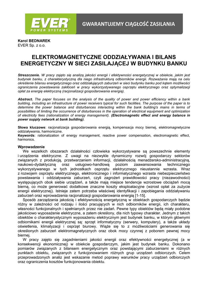 Karol BEDNAREK EVER Sp. z o.o. ELEKTROMAGNETYCZNE ODDZIAŁYWANIA I BILANS ENERGETYCZNY W SIECI ZASILAJĄCEJ W BUDYNKU BANKU Streszczenie. W pracy zajęto się analizą jakości energii i efektywności energetycznej w obiekcie, jakim jest budynek banku, z charakterystyczną dla niego infrastrukturą odbiorników energii. Rozważania mają na celu określenie bilansu energetycznego oraz oddziałujących zaburzeń w sieci budynku banku pod kątem możliwości ograniczenia powstawania zakłóceń w pracy wykorzystywanego osprzętu elektrycznego oraz optymalizacji opłat za energię elektryczną (racjonalizacji gospodarowania energią). Abstract. The paper focuses on the analysis of the quality of power and power efficiency within a bank building, including an infrastructure of power receivers typical for such facilities. The purpose of the paper is to determine the power balance and disturbances interacting within the bank building's mains in terms of possibilities of limiting the occurrence of disturbances in the operation of electrical equipment and optimization of electricity fees (rationalization of energy management). (Electromagnetic effect and energy balance in power supply network at bank building). Słowa kluczowe: racjonalizacja gospodarowania energią, kompensacja mocy biernej, elektromagnetyczne oddziaływania, harmoniczne. Keywords: rationalization of energy management, reactive power compensation, electromagnetic effect, harmonics. Wprowadzenie We wszelkich obszarach działalności człowieka wykorzystywane są powszechnie elementy i urządzenia elektryczne. Z uwagi na niezwykle dynamiczny rozwój gospodarczy sektorów związanych z produkcją, przetwarzaniem informacji, działalnością menadżersko-administracyjną, naukowo-dydaktyczną oraz usługowo-handlową poziom zaawansowania technicznego wykorzystywanego w tych jednostkach osprzętu elektrycznego nieustannie wzrasta. Wraz z rozwojem osprzętu elektrycznego, elektronicznego i informatycznego wzrasta niebezpieczeństwo powstawania i oddziaływania zaburzeń, czyli zagrożeń prawidłowości pracy (niezawodności) występujących obok siebie urządzeń, a także mają miejsce tendencje wzrostowe obciążeń mocą bierną, co może generować dodatkowe znaczne koszty eksploatacyjne (wzrost opłat za zużycie energii elektrycznej). Istnieje zatem potrzeba właściwej identyfikacji i zapobiegania oddziaływaniu zaburzeń oraz wprowadzenia racjonalizacji gospodarowania energią [1-15]. Sposób zarządzania jakością i efektywnością energetyczną w obiektach gospodarczych będzie różny w zależności od rodzaju i ilości pracujących w nich odbiorników energii, ich charakteru, własności funkcjonalnych i spełnianych przez nie zadań. Pewne typy obiektów będą miały podobne jakościowo wyposażenie elektryczne, a zatem określony, dla nich typowy charakter. Jednym z takich obiektów o charakterystycznym wyposażeniu elektrycznym jest budynek banku, w którym głównymi odbiornikami energii elektrycznej są: sprzęt informatyczny (serwery, komputery), a także układy oświetlenia, klimatyzacji i osprzęt biurowy. Wiąże się to z możliwościami generowania się określonych zaburzeń elektromagnetycznych oraz obok mocy czynnej z poborem pewnej mocy biernej. W pracy zajęto się zagadnieniami jakości energii oraz efektywności energetycznej (a w konsekwencji ekonomicznej) w obiekcie gospodarczym, jakim jest budynek banku. Dokonano pomiarów związanych z bilansem energetycznym oraz powstającymi zaburzeniami w różnych punktach obiektu, związanych z funkcjonowaniem różnych grup urządzeń odbiorczych. Celem przeprowadzonych analiz jest wskazanie metod poprawy warunków pracy urządzeń odbiorczych oraz ograniczenia kosztów funkcjonowania obiektu. Oddziaływania elektromagnetyczne i bilanse energii w zależności od specyfiki odbiorników W każdym miejscu, gdzie występuje napięcie i przepływają prądy powstają pola elektromagnetyczne. Z oddziaływaniem pól elektromagnetycznych na układy lub urządzenia elektryczne wiążą się zagadnienia powstawania i oddziaływania zaburzeń, które mogą wywołać zakłócenie prawidłowego funkcjonowania osprzętu elektrycznego bądź jego awarie [2,3,5-7]. Typ oraz charakter powstających i oddziałujących zaburzeń zależy od specyfiki wykorzystywanych urządzeń. Układy, w których zachodzą częste stany łączeniowe elementów biernych (cewek i kondensatorów), mogą mieć tendencje do generowania przepięć (powstających w stanach przejściowych) szczególnie groźnych dla pracy podzespołów elektronicznych (półprzewodnikowych). Występujące w układach elementy o silnych nieliniowościach sprzyjają powstawaniu odkształceń sygnałów napięciowych i prądowych (generowaniu wyższych harmonicznych). Dynamiczne załączanie i wyłączanie dużych obciążeń może być przyczyną powstawania zapadów napięcia. Ponadto zarówno elementy nieliniowe, jak również podzespoły bierne mogą wywoływać powstawanie dodatkowych strat energetycznych bądź opłat za ponadnormatywny pobór energii biernej, wprowadzając dodatkowe koszty w realizowanych procesach [1,3,4,9-12]. Do niedawna charakter odbiorników energii w sieci elektroenergetycznej był najczęściej rezystancyjno-indukcyjny (związany głownie z funkcjonowaniem wszelkiego typu maszyn elektrycznych i przetworników elektromechanicznych). Obecnie często zdarzają się przypadki, że charakter odbiorników jest rezystancyjno-pojemnościowy. Ma to miejsce głownie w centrach komputerowych bądź w obiektach, w których pracują zasilacze impulsowe, elektroniczne układy prostownicze, stabilizujące, filtrujące, elektroniczne układy sterowania oświetleniem wyładowczym itp. [4,9,12]. Duże obiekty związane z działalnością człowieka, jak hale produkcyjne, centra handlowe, budynki administracji, centra przetwarzania informacji itp., mają swoją określoną, dla nich charakterystyczną specy