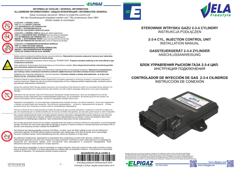 INFORMACJE OGÓLNE / GENERAL INFORMATION ALLGEMEINE INFORMATIONEN / ÎÁÙÀß ÈÍÔÎÐÌÀÖÈß / INFORMACIÓN GENERAL Gdzie montowaæ sterownik / Where to install the control unit Wo das Gassteuergerät eingebaut werden soll / Ãäå óñòàíîâèòü áëîê ÝÁÓ/ Dónde instalar el controlador - Z DALEKA od RÓDE£ WODY. - FAR from any WATER LEAKAGE. - VON WASSERQUELLEN FERNHALTEN - ÂÄÀËÈ îò ÏÎÏÀÄÀÍÈß ÂËÀÃÈ. - LEJOS DE CUALQUIER FUENTE DE AGUA. STEROWNIK WTRYSKU GAZU 2-3-4 CYLINDRY INSTRUKCJA POD£¥CZEÑ - Z DALEKA od ¯RÓDE£ CIEP£A (takich jak uk³ad wydechowy). - FAR from EXCESSIVE HEAT SOURCES (such as exhaust manifolds). - VON W? RMEQUELLEN FERNHALTEN (wie z.B. Auspuffsystem). - ÂÄÀËÈ îò ÈÑÒÎ×ÍÈÊΠÒÅÏËÀ (òàêèõ êàê âûõëîïíîé êîëëåêòîð). - LEJOS DE FUENTES DE CALOR (tales como el sistema de escape) 2-3-4 CYL. INJECTION CONTROL UNIT INSTALLATION MANUAL - Z DALEKA od PRZEWODÓW WYSOKIEGO NAPIÊCIA. - FAR from HIGH-VOLTAGE CABLES. - VON HOCHSPANNUNGSLEITUNGEN FERNHALTEN. - ÂÄÀËÈ îò ÂÛÑÎÊÎÂÎËÜÒÍÛÕ ÏÐÎÂÎÄÎÂ. - LEJOS DE CONDUCTOS DE ALTA TENSIÓN. Nale¿y wykonaæ po³¹czenia elektryczne bez u¿ycia konektorów. Odpowiednio izolowane po³¹czenie lutowane jest najbardziej skutecznym rodzajem po³¹czenia elektrycznego. GASSTEUERGERÄT 2-3-4 ZYLINDER ANSCHLUSSANWEISUNG Create efficient electrical connections without using any "POWER TAPS". Properly insulated soldering is the most effective type of electrical connection. Feste elektrische Verbindungen ohne Anwendung von Konnektoren erstellen. Eine entsprechend isolierte Lötverbindung bildet eine wirksamste elektrische Verbindung. Íåîáõîäèìî âûïîëíÿòü íåêîòîðûå ýëåêòðè÷åñêèå ñîåäèíåíèÿ áåç èñïîëüçîâàíèÿ ðàçú¸ìîâ. Ïðàâèëüíî èçîëèðîâàííîå ïðè ïîìîùè ïàéêè ñîåäèíåíèå ÿâëÿåòñÿ íàèáîëåå ýôôåêòèâíûì ñïîñîáîì ýëåêòðè÷åñêoão ïîäêëþ÷åíèÿ. Establecer las conexiones eléctricas sin uso del conectores. Conexión soldada y aislada adecuadamente es el tipo más efectivo de las conexiónes eléctricas Poinformuj klienta ¿e jeœli zostanie spalony bezpiecznik od systemu gazowego to mo¿na go wymieniæ i przywróciæ po³¹czenie z systemem gazowym. Zaleca siê, aby nie wymieniaæ bezpiecznika na inny o wiêkszej wartoœci natê¿enia pr¹du, poniewa¿ mo¿e to spowodowaæ nieodwracalne uszkodzenie. ÁËÎÊ ÓÏÐÀÂËÅÍÈß ÐÛÑÊÎÌ ÃÀÇÀ 2-3-4 ÖÈË. ÈÍÑÒÐÓÊÖÈß ÏÎÄÊËÞ×ÅÍÈß CONTROLADOR DE INYECCIÓN DE GAS 2-3-4 CILINDROS INSTRUCCIÓN DE CONEXIÓN Advise the customer that if the gas system fuse burns, the connections of the devices to which it is connected will be restored. It is strongly recommended not to replace the fuse with another one with a higher amperage rating since it may cause irreparable damage. Informieren Sie den Kunden, dass eine Sicherung am Gassystem ersetzt werden kann, wenn sie durchgebrannt ist und die Verbindung mit dem Gassystem dann wiederhergestellt werden kann. Es ist empfohlen, die Sicherung durch eine andere, mit höherer Stromstärke nicht zu ersetzen, da dies zu irreparablen Schäden führen kann. Óâåäîìèòå ïîëüçîâàòåëÿ, ÷òî åñëè ïåðåãîðèò ïðåäîõðàíèòåëü ãàçîâîé ñèñòåìû, åãî ìîæíî ïîìåíÿòü, ïîñëå ÷åãî ñîåäèíåíèå ñ ãàçîâîé ñèñòåìîé áóäåò âîññòàíîâëåíî. Íàñòîÿòåëüíî ðåêîìåíäóåòñÿ íå ìåíÿòü ïðåäîõðàíèòåëü íà äðóãîé ñ áîëåå âûñîêîé ñèëîé òîêà, ïîñêîëüêó îí ìîæåò íàíåñòè íåïîïðàâèìîå ïîâðåæäåíèå. Informe al cliente de que si está quemado el fusible del sistema de gas se puede reemplazar y restaurar la conexión al sistema de gas. Se recomienda que no cambie el fusible por otro de las corrientes más grandes, por que esto puede causar un dano irreparable. Aby unikn¹æ nieodwracalnych szkód, nie nale¿y otwieraæ obudowy sterownika z jakiegokolwiek powodu zw³aszcza, gdy silnik jest uruchomiony lub kluczyk jest w stacyjce. ELPIGAZ nie ponosi odpowiedzialnosci za szkody w mieniu lub obra¿enia, jeœli osoby nieuprawnione modyfikuj¹ jego urz¹dzenia. Takie manipulowanie spowoduje równie¿ utratê gwarancji. Do not open the Control Unit box for any reason, especially when the engine is running or the key is in the ignition, to avoid irreparable damage. ELPIGAZ will not be held responsible for damage to property or injuries to persons if unauthorised personnel tamper with its devices; such tampering will also invalidate the WARRANTY. Das Gehäuse des Gassteuergerätes auf keinen Fall öffnen, vor allem, wenn der Motor betätigt ist oder sich der Schlüssel im Lenkschloss befindet. ELPIGAZ haftet für Eigentumsschäden oder Verletzungen nicht, falls die Geräte durch unberechtigte Personen modifiziert werden. Solche Modifizierung wird den Verlust der Garantie zur Folge haben. Âî èçáåæàíèå íåîáðàòèìûõ ïîâðåæäåíèé íå âñêðûâàéòå áëîê óïðàâëåíèÿ ïî êàêîé-ëèáî ïðè÷èíå, îñîáåííî ïðè ðàáîòàþùåì äâèãàòåëå èëè åñëè êëþ÷ íàõîäèòñÿ â çàìêå çàæèãàíèÿ. ELPIGAZ íå íåñ¸ò îòâåòñòâåííîñòè çà ïîâðåæäåíèå èìóùåñòâà èëè ïîëó÷åííûå òðàâìû, åñëè ïîñòîðîííèå ëèöà âìåøèâàþòñÿ â óñòðîéñòâî îáîðóäîâàíèÿ. Òàêèå âìåøàòåëüñòâà ìîãóò òàêæå ïðèâåñòè ê ïîòåðå ãàðàíòèè. Para evitar danos irreversibles, no abra el controlador en ninguna situación, sobre todo cuando el motor está en marcha o l