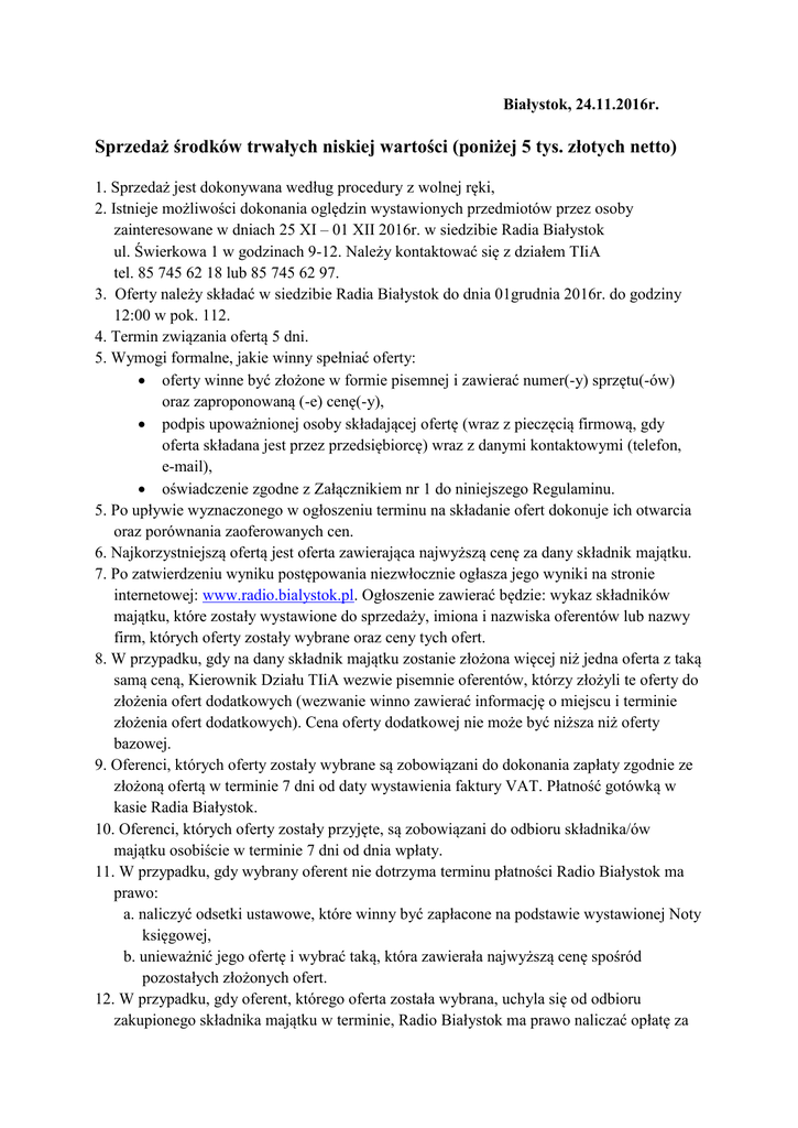 Białystok, 24.11.2016r. Sprzedaż środków trwałych niskiej wartości (poniżej 5 tys. złotych netto) 1. Sprzedaż jest dokonywana według procedury z wolnej ręki, 2. Istnieje możliwości dokonania oględzin wystawionych przedmiotów przez osoby zainteresowane w dniach 25 XI – 01 XII 2016r. w siedzibie Radia Białystok ul. Świerkowa 1 w godzinach 9-12. Należy kontaktować się z działem TIiA tel. 85 745 62 18 lub 85 745 62 97. 3. Oferty należy składać w siedzibie Radia Białystok do dnia 01grudnia 2016r. do godziny 12:00 w pok. 112. 4. Termin związania ofertą 5 dni. 5. Wymogi formalne, jakie winny spełniać oferty: oferty winne być złożone w formie pisemnej i zawierać numer(-y) sprzętu(-ów) oraz zaproponowaną (-e) cenę(-y), podpis upoważnionej osoby składającej ofertę (wraz z pieczęcią firmową, gdy oferta składana jest przez przedsiębiorcę) wraz z danymi kontaktowymi (telefon, e-mail), oświadczenie zgodne z Załącznikiem nr 1 do niniejszego Regulaminu. 5. Po upływie wyznaczonego w ogłoszeniu terminu na składanie ofert dokonuje ich otwarcia oraz porównania zaoferowanych cen. 6. Najkorzystniejszą ofertą jest oferta zawierająca najwyższą cenę za dany składnik majątku. 7. Po zatwierdzeniu wyniku postępowania niezwłocznie ogłasza jego wyniki na stronie internetowej: www.radio.bialystok.pl. Ogłoszenie zawierać będzie: wykaz składników majątku, które zostały wystawione do sprzedaży, imiona i nazwiska oferentów lub nazwy firm, których oferty zostały wybrane oraz ceny tych ofert. 8. W przypadku, gdy na dany składnik majątku zostanie złożona więcej niż jedna oferta z taką samą ceną, Kierownik Działu TIiA wezwie pisemnie oferentów, którzy złożyli te oferty do złożenia ofert dodatkowych (wezwanie winno zawierać informację o miejscu i terminie złożenia ofert dodatkowych). Cena oferty dodatkowej nie może być niższa niż oferty bazowej. 9. Oferenci, których oferty zostały wybrane są zobowiązani do dokonania zapłaty zgodnie ze złożoną ofertą w terminie 7 dni od daty wystawienia faktury VAT. Płatność gotówką w kasie Radia Białystok. 10. Oferenci, których oferty zostały przyjęte, są zobowiązani do odbioru składnika/ów majątku osobiście w terminie 7 dni od dnia wpłaty. 11. W przypadku, gdy wybrany oferent nie dotrzyma terminu płatności Radio Białystok ma prawo: a. naliczyć odsetki ustawowe, które winny być zapłacone na podstawie wystawionej Noty księgowej, b. unieważnić jego ofertę i wybrać taką, która zawierała najwyższą cenę spośród pozostałych złożonych ofert. 12. W przypadku, gdy oferent, którego oferta została wybrana, uchyla się od odbioru zakupionego składnika majątku w terminie, Radio Białystok ma prawo naliczać opłatę za jego przechowanie, w wysokości 1 % ceny brutto składnika majątku, za którą został on sprzedany, liczoną za każdy dodatkowy dzień przechowywania. 13. W przypadku, gdy oferent, którego oferta została wybrana, nie odbierze zakupionego środka trwałego w ciągu 14 dni, Radio Białystok ma prawo zastosować sankcję zgodnie z pkt. 11 lit. b. Załącznik nr 1 do Regulaminu sprzedaży likwidowanych składników majątku Polskiego Radia – Regionalnej Rozgłośni w Białymstoku „Radio Białystok” Spółka Akcyjna wzór oświadczenia o zapoznaniu się ze stanem technicznym likwidowanego składnika majątku Oświadczenie o zapoznaniu się ze stanem technicznym likwidowanego składnika majątku Niżej podpisany/a oświadczam, iż przed nabyciem likwidowanego składnika majątku Polskiego Radia – Regionalnej Rozgłośni w Białymstoku „Radio Białystok” Spółka Akcyjna w postaci ……………………………………………………………………………………… (opis likwidowanego składnika majątku) zapoznałem/łam się z jego stanem technicznym i nie zgłaszam w tym przedmiocie żadnych zastrzeżeń. …………………………………… (podpis) Lista środków do sprzedaży: Rok Produkcji Parametry Stan 2008 Aparat, ładowarka kabel CinchUSB, Futerał, Smycz, Instrukcja, CD z oprogramowaniem sprawny wyeksploatowany, bateria do wymiany, ślady użytkowania na obudowie 2007 Wej. Antena FM, AM, AUX, Pilot Wyeksploatowany, Odtwarzacz CD nie czyta płyt, radio szumi. 10 Palmtop Mio P560 2008 Palmtop, Uchwyt samochodowy, ładowarka, ładowarka samochodowa, instrukcja. System Windows Mobile 6 w polskiej lokalizacji, procesor Samsung S3C2440A 400 Mhz, pamięć wewnętrzna 2 GB, obsługa kart SD/MMC oraz SDHC, dotykowy ekran 3,5" o rozdzielczości 240 x 320 pikseli, karta WiFi, Bluetooth oraz odbiornik GPS SiRFstar III sprawny wyeksploatowany, bateria do wymiany, ślady użytkowania na obudowie 11 Magnetofon DAT PCM 2700 1992 13 Aparat fotograficzny Sony DSC-P92 2003 15 Kopiarka Toshiba 1210 1995 - 1992 1992 2005 2012 2007 Casio RR-140N Casio RR-140N Wallner OPUS VS505c Feljowes P70cm Uszkodzony, uszkodzone nóżki Uszkodzony, uszkodzone nóżki Uszkodzona, nie działa Uszkodzona, nie działa Uszkodzona, nie działa Uszkodzony, porwana tkanina reklamowa 2011 32 cale, Złącze LAN, AV, 3x HDMI, Optical, Component IN, VGA, Audio Out, 2x USB Uszkodzony, ekran od połowy w górę wyświetla co drugą linię, nie wyświetla kolorów LP. 2 5 16 17 18 19 20 21 Nazwa Aparat fotograficzny Panasonic TZ-4 Mini wieża Philips MCM 760/12 Kalkulator Kalkulator Niszczarka Niszczarka Niszczarka Rolap reklamowy Telewizor Sony 22 KDL32EX421BA EP Analog IN, Analog OUT, DIGITAL IN, DIGITAL OUT, REMOTE(37P) Aparat, kabel USB-USB, kabel CINCH-Jack, Instrukcja, karta pamięci Memory Stick 256 MB, zasilanie z baterii LR6 2010 wyeksploatowany, uszkodzony mechanizm nie przewija kasety sprawny wyeksploatowany, bateria do wymiany, ślady użytkowania na obudowie wyeksploatowana, ślady użytkowania na obudowie, uszkodzona 23 Mikrofalówka Panasonic 2000 Dimenion 4 wyeksploatowana 24 Mikrofalówka Samsung 1991 Classic Collecton wyeksploat
