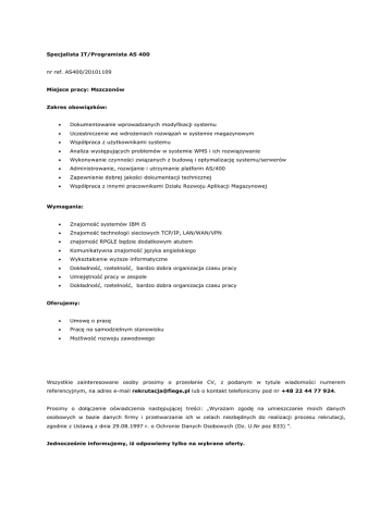 Specjalista IT/Programista AS 400 nr ref. AS400/20101109 Miejsce pracy: Mszczonów Zakres obowiązków: • Dokumentowanie wprowadzanych modyfikacji systemu • Uczestniczenie we wdrożeniach rozwiązań w systemie magazynowym • Współpraca z użytkownikami systemu • Analiza występujących problemów w systemie WMS i ich rozwiązywanie • Wykonywanie czynności związanych z budową i optymalizację systemu/serwerów • Administrowanie, rozwijanie i utrzymanie platform AS/400 • Zapewnienie dobrej jakości dokumentacji technicznej • Współpraca z innymi pracownikami Działu Rozwoju Aplikacji Magazynowej Wymagania: • Znajomość systemów IBM i5 • Znajomość technologii sieciowych TCP/IP, LAN/WAN/VPN • znajomość RPGLE będzie dodatkowym atutem • Komunikatywna znajomość języka angielskiego • Wykształcenie wyższe informatyczne • Dokładność, rzetelność, bardzo dobra organizacja czasu pracy • Umiejętność pracy w zespole • Dokładność, rzetelność, bardzo dobra organizacja czasu pracy Oferujemy: • Umowę o pracę • Pracę na samodzielnym stanowisku • Możliwość rozwoju zawodowego Wszystkie zainteresowane osoby prosimy o przesłanie CV, z podanym w tytule wiadomości numerem referencyjnym, na adres e-mail [email protected] lub o kontakt telefoniczny pod nr +48 22 44 77 924. Prosimy o dołączenie oświadczenia następującej treści: „Wyrażam zgodę na umieszczanie moich danych osobowych w bazie danych firmy i przetwarzanie ich w celach niezbędnych do realizacji procesu rekrutacji, zgodnie z Ustawą z dnia 29.08.1997 r. o Ochronie Danych Osobowych (Dz. U.Nr poz 833) ”. Jednocześnie informujemy, iż odpowiemy tylko na wybrane oferty.