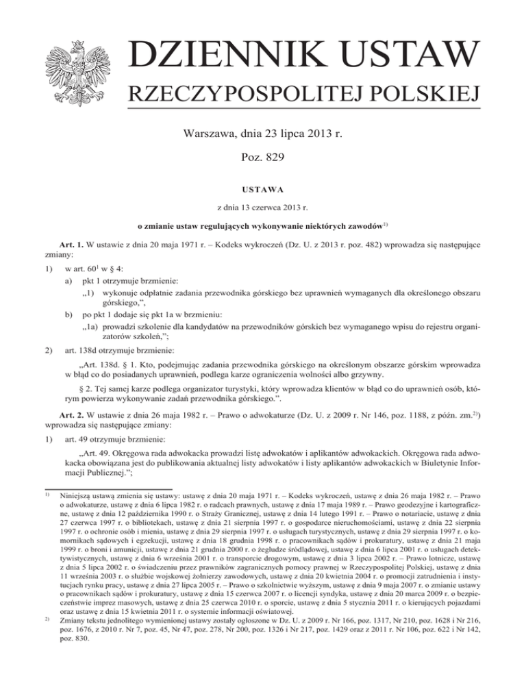 DZIENNIK USTAW RZECZYPOSPOLITEJ POLSKIEJ Warszawa, dnia 23 lipca 2013 r. Poz. 829 USTAWA z dnia 13 czerwca 2013 r. o zmianie ustaw regulujących wykonywanie niektórych zawodów1) Art. 1. W ustawie z dnia 20 maja 1971 r. – Kodeks wykroczeń (Dz. U. z 2013 r. poz. 482) wprowadza się następujące zmiany: 1)w art. 601 w § 4: a)pkt 1 otrzymuje brzmienie: „1)wykonuje odpłatnie zadania przewodnika górskiego bez uprawnień wymaganych dla określonego obszaru górskiego,”, b)po pkt 1 dodaje się pkt 1a w brzmieniu: „1a)prowadzi szkolenie dla kandydatów na przewodników górskich bez wymaganego wpisu do rejestru organizatorów szkoleń,”; 2)art. 138d otrzymuje brzmienie: „Art. 138d. § 1. Kto, podejmując zadania przewodnika górskiego na określonym obszarze górskim wprowadza w błąd co do posiadanych uprawnień, podlega karze ograniczenia wolności albo grzywny. § 2. Tej samej karze podlega organizator turystyki, który wprowadza klientów w błąd co do uprawnień osób, którym powierza wykonywanie zadań przewodnika górskiego.”. Art. 2. W ustawie z dnia 26 maja 1982 r. – Prawo o adwokaturze (Dz. U. z 2009 r. Nr 146, poz. 1188, z późn. zm.2)) wprowadza się następujące zmiany: 1)art. 49 otrzymuje brzmienie: „Art. 49. Okręgowa rada adwokacka prowadzi listę adwokatów i aplikantów adwokackich. Okręgowa rada adwokacka obowiązana jest do publikowania aktualnej listy adwokatów i listy aplikantów adwokackich w Biuletynie Informacji Publicznej.”; Niniejszą ustawą zmienia się ustawy: ustawę z dnia 20 maja 1971 r. – Kodeks wykroczeń, ustawę z dnia 26 maja 1982 r. – Prawo o adwokaturze, ustawę z dnia 6 lipca 1982 r. o radcach prawnych, ustawę z dnia 17 maja 1989 r. – Prawo geodezyjne i kartograficzne, ustawę z dnia 12 października 1990 r. o Straży Granicznej, ustawę z dnia 14 lutego 1991 r. – Prawo o notariacie, ustawę z dnia 27 czerwca 1997 r. o bibliotekach, ustawę z dnia 21 sierpnia 1997 r. o gospodarce nieruchomościami, ustawę z dnia 22 sierpnia 1997 r. o ochronie osób i mienia, ustawę z dnia 29 sierpnia 1997 r. o usługach turystycznych, ustawę z dnia 29 sierpnia 1997 r. o komornikach sądowych i egzekucji, ustawę z dnia 18 grudnia 1998 r. o pracownikach sądów i prokuratury, ustawę z dnia 21 maja 1999 r. o broni i amunicji, ustawę z dnia 21 grudnia 2000 r. o żegludze śródlądowej, ustawę z dnia 6 lipca 2001 r. o usługach detektywistycznych, ustawę z dnia 6 września 2001 r. o transporcie drogowym, ustawę z dnia 3 lipca 2002 r. – Prawo lotnicze, ustawę z dnia 5 lipca 2002 r. o świadczeniu przez prawników zagranicznych pomocy prawnej w Rzeczypospolitej Polskiej, ustawę z dnia 11 września 2003 r. o służbie wojskowej żołnierzy zawodowych, ustawę z dnia 20 kwietnia 2004 r. o promocji zatrudnienia i instytucjach rynku pracy, ustawę z dnia 27 lipca 2005 r. – Prawo o szkolnictwie wyższym, ustawę z dnia 9 maja 2007 r. o zmianie ustawy o pracownikach sądów i prokuratury, ustawę z dnia 15 czerwca 2007 r. o licencji syndyka, ustawę z dnia 20 marca 2009 r. o bezpieczeństwie imprez masowych, ustawę z dnia 25 czerwca 2010 r. o sporcie, ustawę z dnia 5 stycznia 2011 r. o kierujących pojazdami oraz ustawę z dnia 15 kwietnia 2011 r. o systemie informacji oświatowej. 2) Zmiany tekstu jednolitego wymienionej ustawy zostały ogłoszone w Dz. U. z 2009 r. Nr 166, poz. 1317, Nr 210, poz. 1628 i Nr 216, poz. 1676, z 2010 r. Nr 7, poz. 45, Nr 47, poz. 278, Nr 200, poz. 1326 i Nr 217, poz. 1429 oraz z 2011 r. Nr 106, poz. 622 i Nr 142, poz. 830. 1) Dziennik Ustaw – 2 – Poz. 829 2)w art. 66: a)w ust. 1: – pkt 2 otrzymuje brzmienie: „2) osób, które przez okres co najmniej 3 lat zajmowały stanowisko radcy lub starszego radcy Prokuratorii Generalnej Skarbu Państwa albo wykonywały zawód komornika;”, – pkt 4 otrzymuje brzmienie: „4) osób, które zdały egzamin sędziowski lub prokuratorski po dniu 1 stycznia 1991 r. lub egzamin notarialny po dniu 22 kwietnia 1991 r. oraz w okresie 5 lat przed złożeniem wniosku o wpis na listę adwokatów, łącznie przez okres co najmniej 3 lat: a)zajmowały stanowisko asesora sądowego, asesora prokuratorskiego, referendarza sądowego, starszego referendarza sądowego, aplikanta sądowego, aplikanta prokuratorskiego, asystenta prokuratora, asystenta sędziego lub były zatrudnione w Sądzie Najwyższym, Trybunale Konstytucyjnym lub w międzynarodowym organie sądowym, w szczególności w Trybunale Sprawiedliwości Unii Europejskiej lub Europejskim Trybunale Praw Człowieka i wykonywały zadania odpowiadające czynnościom asystenta sędziego lub b)wykonywały na podstawie umowy o pracę lub umowy cywilnoprawnej wymagające wiedzy prawniczej czynności bezpośrednio związane ze świadczeniem pomocy prawnej przez adwokata lub radcę prawnego w kancelarii adwokackiej, zespole adwokackim, spółce cywilnej, jawnej, partnerskiej, komandytowej lub komandytowo-akcyjnej, o których mowa w art. 4a ust. 1, lub kancelarii radcy prawnego, spółce cywilnej, jawnej, partnerskiej, komandytowej lub komandytowo-akcyjnej, o których mowa w art. 8 ust. 1 ustawy z dnia 6 lipca 1982 r. o radcach prawnych (Dz. U. z 2010 r. Nr 10, poz. 65, ze zm.3)), lub c)były zatrudnione w urzędach organów władzy publicznej lub w państwowych jednostkach organizacyjnych i wykonywały wymagające wiedzy prawniczej czynności bezpośrednio związane z tworzeniem projektów ustaw, rozporządzeń lub aktów prawa miejscowego;”, – w pkt 5 lit. a i b otrzymują brzmienie: „a) zajmowały stanowisko referendarza sądowego, starszego referendarza sądowego, aplikanta sądowego, aplikanta prokuratorskiego, asystenta sędziego, asystenta prokuratora lub b)wykonywały wymagające wiedzy prawniczej czynności bezpośrednio związane ze świadczeniem pomocy prawnej przez adwokata lub radcę prawnego na podstawie umowy o pracę lub umowy cywilnoprawnej w kancelarii adwokackiej, zespole adwokackim, spółce 