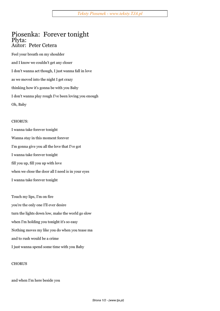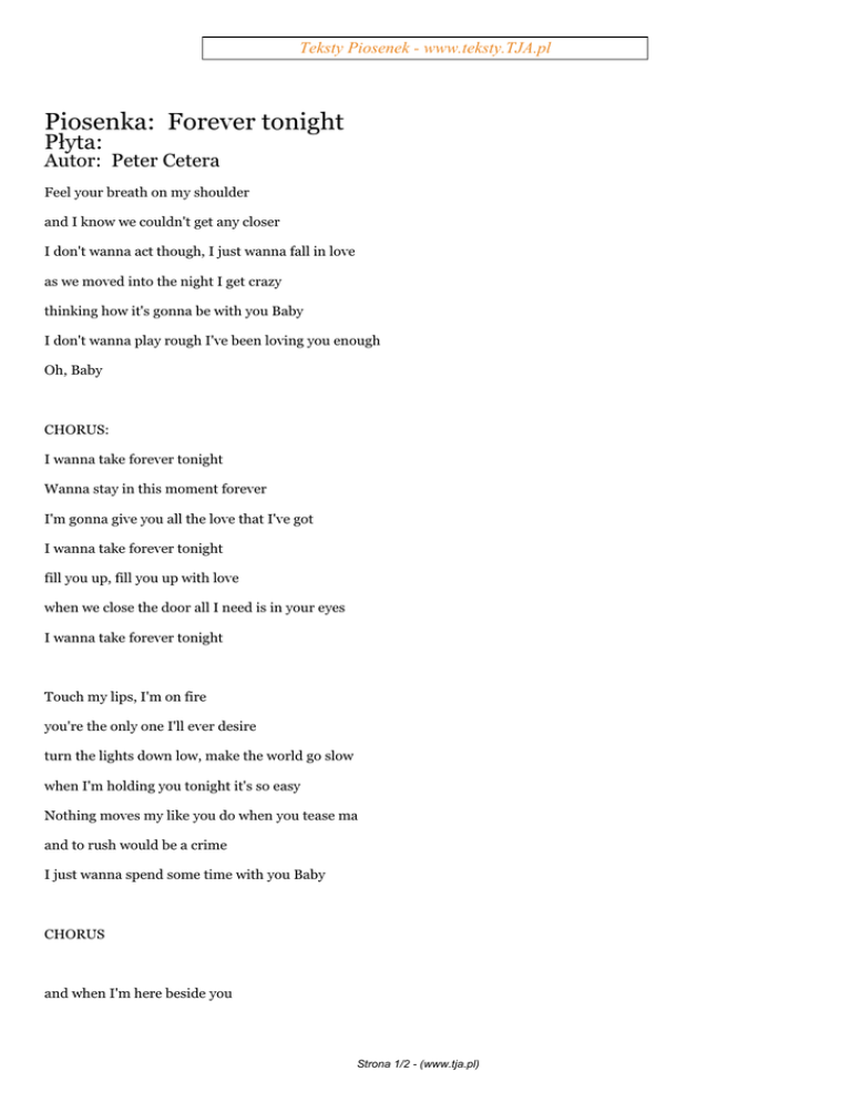 Teksty Piosenek - www.teksty.TJA.pl Piosenka: Forever tonight Płyta: Autor: Peter Cetera Feel your breath on my shoulder and I know we couldn't get any closer I don't wanna act though, I just wanna fall in love as we moved into the night I get crazy thinking how it's gonna be with you Baby I don't wanna play rough I've been loving you enough Oh, Baby CHORUS: I wanna take forever tonight Wanna stay in this moment forever I'm gonna give you all the love that I've got I wanna take forever tonight fill you up, fill you up with love when we close the door all I need is in your eyes I wanna take forever tonight Touch my lips, I'm on fire you're the only one I'll ever desire turn the lights down low, make the world go slow when I'm holding you tonight it's so easy Nothing moves my like you do when you tease ma and to rush would be a crime I just wanna spend some time with you Baby CHORUS and when I'm here beside you Strona 1/2 - (www.tja.pl) Teksty Piosenek - www.teksty.TJA.pl I wanna see what drives you out of my mind I never wanna leave I only wanna be with you 'cause I love how you feel your love so real 2 X CHORUS ***************************************** Polecamy Strony: www.opisy.tja.pl - Codzienie nowe opisy na GG www.rozmowki.tja.pl - Śmieszne Rozmówki www.tapeciarnia.pl - Mnustwo fajnych tapet na pulpit www.teledyski.tja.pl - Zawsze najnowsze teledyski www.lol2.pl - Śmieszne Filmiki, Kabarety www.wkinach.pl - Co jest grane w kinach ? Strona 2/2 - (www.tja.pl)
