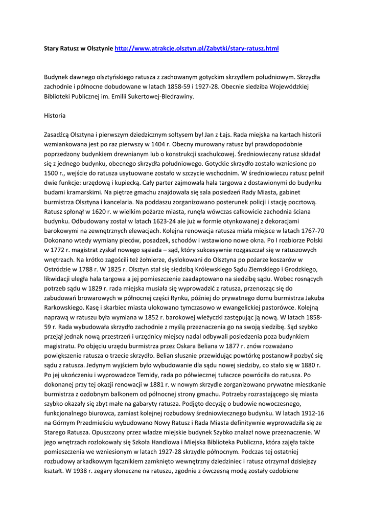 Stary Ratusz w Olsztynie http://www.atrakcje.olsztyn.pl/Zabytki/stary‐ratusz.html Budynek dawnego olsztyńskiego ratusza z zachowanym gotyckim skrzydłem południowym. Skrzydła zachodnie i północne dobudowane w latach 1858‐59 i 1927‐28. Obecnie siedziba Wojewódzkiej Biblioteki Publicznej im. Emilii Sukertowej‐Biedrawiny. Historia Zasadźcą Olsztyna i pierwszym dziedzicznym sołtysem był Jan z Łajs. Rada miejska na kartach historii wzmiankowana jest po raz pierwszy w 1404 r. Obecny murowany ratusz był prawdopodobnie poprzedzony budynkiem drewnianym lub o konstrukcji szachulcowej. Średniowieczny ratusz składał się z jednego budynku, obecnego skrzydła południowego. Gotyckie skrzydło zostało wzniesione po 1500 r., wejście do ratusza usytuowane zostało w szczycie wschodnim. W średniowieczu ratusz pełnił dwie funkcje: urzędową i kupiecką. Cały parter zajmowała hala targowa z dostawionymi do budynku budami kramarskimi. Na piętrze gmachu znajdowała się sala posiedzeń Rady Miasta, gabinet burmistrza Olsztyna i kancelaria. Na poddaszu zorganizowano posterunek policji i stację pocztową. Ratusz spłonął w 1620 r. w wielkim pożarze miasta, runęła wówczas całkowicie zachodnia ściana budynku. Odbudowany został w latach 1623‐24 ale już w formie otynkowanej z dekoracjami barokowymi na zewnętrznych elewacjach. Kolejna renowacja ratusza miała miejsce w latach 1767‐70 Dokonano wtedy wymiany pieców, posadzek, schodów i wstawiono nowe okna. Po I rozbiorze Polski w 1772 r. magistrat zyskał nowego sąsiada – sąd, który sukcesywnie rozgaszczał się w ratuszowych wnętrzach. Na krótko zagościli też żołnierze, dyslokowani do Olsztyna po pożarze koszarów w Ostródzie w 1788 r. W 1825 r. Olsztyn stał się siedzibą Królewskiego Sądu Ziemskiego i Grodzkiego, likwidacji uległa hala targowa a jej pomieszczenie zaadaptowano na siedzibę sądu. Wobec rosnących potrzeb sądu w 1829 r. rada miejska musiała się wyprowadzić z ratusza, przenosząc się do zabudowań browarowych w północnej części Rynku, później do prywatnego domu burmistrza Jakuba Rarkowskiego. Kasę i skarbiec miasta ulokowano tymczasowo w ewangelickiej pastorówce. Kolejną naprawą w ratuszu była wymiana w 1852 r. barokowej wieżyczki zastępując ją nową. W latach 1858‐ 59 r. Rada wybudowała skrzydło zachodnie z myślą przeznaczenia go na swoją siedzibę. Sąd szybko przejął jednak nową przestrzeń i urzędnicy miejscy nadal odbywali posiedzenia poza budynkiem magistratu. Po objęciu urzędu burmistrza przez Oskara Beliana w 1877 r. znów rozważano powiększenie ratusza o trzecie skrzydło. Belian słusznie przewidując powtórkę postanowił pozbyć się sądu z ratusza. Jedynym wyjściem było wybudowanie dla sądu nowej siedziby, co stało się w 1880 r. Po jej ukończeniu i wyprowadzce Temidy, rada po półwiecznej tułaczce powróciła do ratusza. Po dokonanej przy tej okazji renowacji w 1881 r. w nowym skrzydle zorganizowano prywatne mieszkanie burmistrza z ozdobnym balkonem od północnej strony gmachu. Potrzeby rozrastającego się miasta szybko okazały się zbyt małe na gabaryty ratusza. Podjęto decyzję o budowie nowoczesnego, funkcjonalnego biurowca, zamiast kolejnej rozbudowy średniowiecznego budynku. W latach 1912‐16 na Górnym Przedmieściu wybudowano Nowy Ratusz i Rada Miasta definitywnie wyprowadziła się ze Starego Ratusza. Opuszczony przez władze miejskie budynek Szybko znalazł nowe przeznaczenie. W jego wnętrzach rozlokowały się Szkoła Handlowa i Miejska Biblioteka Publiczna, która zajęła także pomieszczenia we wzniesionym w latach 1927‐28 skrzydle północnym. Podczas tej ostatniej rozbudowy arkadkowym łącznikiem zamknięto wewnętrzny dziedziniec i ratusz otrzymał dzisiejszy kształt. W 1938 r. zegary słoneczne na ratuszu, zgodnie z ówczesną modą zostały ozdobione postaciami Krzyżaka i oficera hitlerowskiego. Stary Ratusz był podówczas siedzibą młodzieżówki faszystowskiej – Hitlerjugend. Wieżyczka zegarowa spłonęła w 1942 r. i spadła na płytę Rynku. Ponownie ogień dotknął ratusz trzy lata później. Budynek ratusza został spalony przez czerwonoarmistów w 1945 r., definitywnie wtedy przepadły wnętrza. Odbudowany został w latach 1947‐50 r., niestety dokonano tego byle jak, zasypano piwnice, zlikwidowano szczyty w skrzydle południowym, dach tego skrzydła przekształcono w czterospadowy, zrezygnowano z odbudowy wieżyczki. Uważano go za zabytek niskiej klasy i nie doceniano go. Po II wojnie światowej ratusz pełnił rozmaite funkcje, zajmowała go biblioteka, Urząd Stanu Cywilnego, przychodnia lekarska. Na poddaszu kwaterowani byli prywatni mieszkańcy. W jednym z takich mieszkań w 1968 r. zaprószono ogień, co było przyczyną kolejnego pożaru dachu. Po dokonaniu w 1995 r. odkrywki zdobień w elewacji południowej przeprowadzono generalny remont ratusza. Trwał w latach 1996‐2003 i toczył się z wieloma przestojami, przyczyną był brak pieniędzy. W 2000 r. liczono się nawet z groźbą zawalenia ratusza. W wyniku remontu ostatecznie przywrócono gotycki wygląd elewacjom skrzydła południowego a 7 września 2000 r. zamontowano ponownie wieżyczkę nad skrzydłem południowym. Aktualnie całość budynku zajmuje Wojewódzka Biblioteka Publiczna, która jest właścicielką obiektu. Opis architektoniczny Ratusz jest piętrową budowlą trzyskrzydłową z arkadowym krużgankiem od wschodu zamykającym prostokątny dziedziniec. Skrzydło południowe gotyckie z portalem wejściowym w południowej elewacji jako jedyne jest nieotynkowane. Na parterze budynek ozdabiają zachowane fragmenty dekoracji gotyckich oraz okienko wagi miejskiej, które jest pozostałością po dawnej hali targowej. W szczycie wschodnim ratusza zrekonstruowana została triada portalowo‐okienna. Środkowe drzwi, ujęte podwójnym gotyckim „oślim grzbietem” i pojedynczym łukiem odcinkowym stanowiło daw