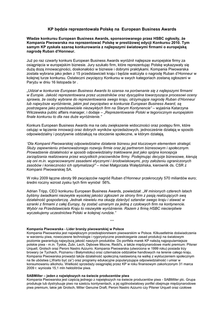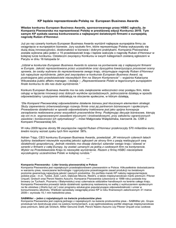 KP będzie reprezentowała Polskę na European Business Awards Władze konkursu European Business Awards, sponsorowanego przez HSBC ogłosiły, Ŝe Kompania Piwowarska ma reprezentować Polskę w prestiŜowej edycji Konkursu 2010. Tym samym KP zyskała szansę konkurowania z najlepszymi światowymi firmami o europejską nagrodę Ruban d’Honneur. JuŜ po raz czwarty konkurs European Business Awards wyróŜnił najlepsze europejskie firmy za osiągnięcia w europejskim biznesie. Jury szukało firm, które reprezentując Polskę wykazywały się duŜą dozą innowacyjności, doskonałości w biznesie i dobrymi praktykami. Kompania Piwowarska została wybrana jako jeden z 15 przedstawicieli kraju i będzie walczyła o nagrodę Ruban d’Honneur w kolejnej turze konkursu. Ostateczni zwycięzcy Konkursu w swych kategoriach zostaną ogłoszeni w ParyŜu w dniu 16 listopada br . „Udział w konkursie European Business Awards to szansa na porównanie się z najlepszymi firmami w Europie. Jakość reprezentowana przez uczestników oraz dyscyplina towarzysząca procesowi oceny sprawia, Ŝe osoby wybrane do reprezentowania swego kraju, otrzymujące nagrodę Ruban d’Honneur lub najwyŜsze wyróŜnienie, jakim jest zwycięstwo w konkursie European Business Award, są postrzegane jako przedstawiciele niezwykłych firm na Starym Kontynencie” – wyjaśnia Katarzyna Wilczewska public affairs manager, i dodaje – „Reprezentowanie Polski w tegorocznym europejskim finale konkursu to dla nas duŜe wyróŜnienie.” Konkurs European Business Awards ma na celu zwiększenie widoczności oraz postępu firm, które celując w łączenie innowacji oraz dobrych wyników sprzedaŜowych, jednocześnie działają w sposób odpowiedzialny i pozytywnie oddziałują na otoczenie społeczne, w którym działają. "Dla Kompanii Piwowarskiej odpowiedzialne działanie biznesu jest kluczowym elementem strategii. SłuŜy zapewnieniu zrównowaŜonego rozwoju firmie oraz jej partnerom biznesowym i społecznym. Prowadzenie działalności w sposób odpowiedzialny traktowane jest jako spójna koncepcja zarządzania realizowana przez wszystkich pracowników firmy. Podejmując decyzje biznesowe, kierują się oni m.in. wypracowanymi zasadami etycznymi i środowiskowymi, przy załoŜeniu ograniczonych zasobów i konieczności ich optymalizacji" – mówi Małgorzata Walędzińska, kierownik ds. CSR z Kompanii Piwowarskiej SA. W roku 2009 łączne obroty 99 zwycięzców nagród Ruban d’Honneur przekroczyły 570 miliardów euro; średni roczny wzrost zysku tych firm wyniósł 56%. Adrian Tripp, CEO konkursu European Business Awards, powiedział: „W minionych czterech latach byliśmy świadkami niezwykle wysokiej jakości zgłoszeń ze strony firm z pasją realizujących swą działalność gospodarczą. Jednak niewielu ma okazję dzierŜyć sztandar swego kraju i stawać w szranki z firmami z całej Europy, by zostać uznanym za jedną z czołowych firm na kontynencie. Wybór na Przedstawiciela Kraju to niezwykłe wyróŜnienie. Razem z firmą HSBC niecierpliwie wyczekujemy uczestnictwa Polski w kolejnej rundzie.” *** Kompania Piwowarska - Lider branŜy piwowarskiej w Polsce Kompania Piwowarska jest największym przedsiębiorstwem piwowarskim w Polsce. Kilkusetletnie doświadczenia w warzeniu piwa, nowoczesne technologie i rygorystyczne przestrzeganie zasad produkcji na światowym poziomie gwarantują najwyŜszą jakość naszych produktów. Do portfela marek KP naleŜą najpopularniejsze polskie piwa - m.in. Tyskie, śubr, Lech, Dębowe Mocne, Redd's, a takŜe międzynarodowe marki premium: Pilsner Urquell, Grolsch oraz Peroni Nastro Azzurro. Kompania Piwowarska (utworzona w 1999 roku) posiada trzy browary (w Tychach, Poznaniu i Białymstoku) oraz czternaście oddziałów handlowych na terenie całego kraju. Kompania Piwowarska prowadzi takŜe działalność społeczną nastawioną na walkę z wykluczeniem społecznym na tle ubóstwa („Warto być za”) oraz programy edukacyjne popularyzujące odpowiedzialność i umiar w konsumowaniu alkoholu. Wielkość sprzedaŜy osiągniętej przez KP w roku finansowym zakończonym 31 marca 2009 r. wyniosła 15,1 mln hektolitrów piwa. SABMiller – jeden z największych na świecie producentów piwa Kompania Piwowarska jest częścią jednego z największych na świecie producentów piwa - SABMiller plc. Grupa produkuje lub dystrybuuje piwo na sześciu kontynentach, a jej ogólnoświatowy portfel obejmuje międzynarodowe piwa premium, takie jak Grolsch, Miller Genuine Draft, Peroni Nastro Azzurro czy Pilsner Urquell oraz czołowe marki lokalne, takie jak Aquila, Castle, Miller Lite, Snow czy Tyskie. SABMiller jest jedną z największych na świecie (poza USA) firm rozlewających produkty Coca-Coli. W roku finansowym zakończonym 31 marca 2009 SABMiller osiągnął przychody w wysokości 25,3 mld USD oraz wypracował zysk brutto w wysokości 3,4 mld USD. SABMiller plc jest notowany na giełdach papierów wartościowych w Londynie i Johannesburgu. Dodatkowych informacji udziela: Katarzyna Wilczewska Kierownik ds. Public Affairs KOMPANIA PIWOWARSKA SA [email protected] Tel: +48 61 667 77 65 Tel. kom.: +48 601 887 966