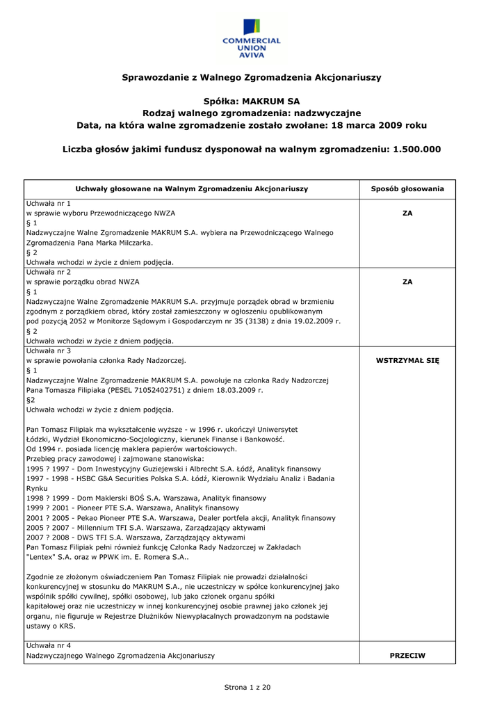 Sprawozdanie z Walnego Zgromadzenia Akcjonariuszy Spółka: MAKRUM SA Rodzaj walnego zgromadzenia: nadzwyczajne Data, na która walne zgromadzenie zostało zwołane: 18 marca 2009 roku Liczba głosów jakimi fundusz dysponował na walnym zgromadzeniu: 1.500.000 Uchwały głosowane na Walnym Zgromadzeniu Akcjonariuszy Uchwała nr 1 w sprawie wyboru Przewodniczącego NWZA §1 Nadzwyczajne Walne Zgromadzenie MAKRUM S.A. wybiera na Przewodniczącego Walnego Zgromadzenia Pana Marka Milczarka. §2 Uchwała wchodzi w życie z dniem podjęcia. Uchwała nr 2 w sprawie porządku obrad NWZA §1 Nadzwyczajne Walne Zgromadzenie MAKRUM S.A. przyjmuje porządek obrad w brzmieniu zgodnym z porządkiem obrad, który został zamieszczony w ogłoszeniu opublikowanym pod pozycją 2052 w Monitorze Sądowym i Gospodarczym nr 35 (3138) z dnia 19.02.2009 r. §2 Uchwała wchodzi w życie z dniem podjęcia. Uchwała nr 3 w sprawie powołania członka Rady Nadzorczej. §1 Nadzwyczajne Walne Zgromadzenie MAKRUM S.A. powołuje na członka Rady Nadzorczej Pana Tomasza Filipiaka (PESEL 71052402751) z dniem 18.03.2009 r. §2 Uchwała wchodzi w życie z dniem podjęcia. Sposób głosowania ZA ZA WSTRZYMAŁ SIĘ Pan Tomasz Filipiak ma wykształcenie wyższe - w 1996 r. ukończył Uniwersytet Łódzki, Wydział Ekonomiczno-Socjologiczny, kierunek Finanse i Bankowość. Od 1994 r. posiada licencję maklera papierów wartościowych. Przebieg pracy zawodowej i zajmowane stanowiska: 1995 ? 1997 - Dom Inwestycyjny Guziejewski i Albrecht S.A. Łódź, Analityk finansowy 1997 - 1998 - HSBC G&A Securities Polska S.A. Łódź, Kierownik Wydziału Analiz i Badania Rynku 1998 ? 1999 - Dom Maklerski BOŚ S.A. Warszawa, Analityk finansowy 1999 ? 2001 - Pioneer PTE S.A. Warszawa, Analityk finansowy 2001 ? 2005 - Pekao Pioneer PTE S.A. Warszawa, Dealer portfela akcji, Analityk finansowy 2005 ? 2007 - Millennium TFI S.A. Warszawa, Zarządzający aktywami 2007 ? 2008 - DWS TFI S.A. Warszawa, Zarządzający aktywami Pan Tomasz Filipiak pełni również funkcję Członka Rady Nadzorczej w Zakładach "Lentex" S.A. oraz w PPWK im. E. Romera S.A.. Zgodnie ze złożonym oświadczeniem Pan Tomasz Filipiak nie prowadzi działalności konkurencyjnej w stosunku do MAKRUM S.A., nie uczestniczy w spółce konkurencyjnej jako wspólnik spółki cywilnej, spółki osobowej, lub jako członek organu spółki kapitałowej oraz nie uczestniczy w innej konkurencyjnej osobie prawnej jako członek jej organu, nie figuruje w Rejestrze Dłużników Niewypłacalnych prowadzonym na podstawie ustawy o KRS. Uchwała nr 4 Nadzwyczajnego Walnego Zgromadzenia Akcjonariuszy PRZECIW Strona 1 z 20 MAKRUM Spółka Akcyjna z dnia 18 marca 2009 r. w sprawie upowa_nienia do nabycia akcji własnych Spółki oraz okreslenia warunków przeprowadzenia skupu akcji Nadzwyczajne Walne Zgromadzenie Akcjonariuszy MAKRUM S.A., działajac na podstawie art. 362 § 1 pkt 8 i § 2, art. 365 § 1 i 2 oraz art. 393 pkt 6 Kodeksu spółek handlowych., uchwala, co nastepuje: §1 1. Upowa_nia sie Spółke do nabywania jej akcji własnych w celu ich dalszej odsprzeda_y na nastepujacych warunkach: a) ilosc akcji nabywanych w okresie upowa_nienia nie mo_e przekroczyc 8 338 099 (osiem milionów trzysta trzydziesci osiem tysiecy dziewiecdziesiat dziewiec), b) Spółka mo_e nabywac akcje własne w terminie do dnia 31 grudnia 2010 r., c) łaczna cena nabycia akcji własnych powiekszona o koszty ich nabycia nie mo_e przekroczyc kwoty 7.590.000,00.zł (siedem milionów piecset dziewiecdziesiat tysiecy złotych), d) minimalna cena zakupu za jedna akcje wynosi 0,01 zł (jeden grosz) a maksymalna cena zakupu jednej akcji nie mo_e przekroczyc 3,00 zł (trzy złote), e) w granicach cenowych okreslonych wy_ej, Rada Nadzorca mo_e okreslic minimalna i maksymalna cene nabywania własnych akcji, po których Zarzad bedzie zobowiazany dokonywac nabycia, f) w granicach cenowych okreslonych powy_ej, cena akcji własnych nabywanych w transakcji pakietowej musi zmiescic sie w granicach plus/minus 15 % (pietnascie procent) ceny zamkniecia z danego dnia na Giełdzie Papierów Wartosciowych w Warszawie S.A., g) akcje własne beda nabywane za posrednictwem firmy inwestycyjnej na rynku regulowanym lub w transakcjach pakietowych na GPW w Warszawie z zastrze_eniem, _e Spółka nie nabedzie akcji własnych w transakcjach pakietowych od Pana Rafała Jerzy oraz podmiotów z nim powiazanych, h) upowa_nienie do nabywania akcji własnych wygasa równie_ z chwila wyczerpania srodków kapitału rezerwowego utworzonego na ich nabycie, i) termin rozpoczecia i zakonczenia nabywania akcji Zarzad poda do publicznej wiadomosci, zgodnie przepisami regulujacymi obrót papierami wartosciowymi spółek publicznych , j) Zarzad, kierujac sie interesem Spółki, po zasiegnieciu opinii Rady Nadzorczej mo_e zakonczyc nabywanie akcji przed upływem okresu lub przed wyczerpaniem całosci srodków przeznaczonych na ich nabycie, albo te_ zrezygnowac z nabycia akcji w całosci lub w czesci. §2 Walne Zgromadzenie zobowiazuje i upowa_nia Zarzad Spółki do podjecia wszelkich czynnosci faktycznych i prawnych niezbednych do nabycia akcji własnych Spółki zgodnie z trescia niniejszej uchwały oraz uchwały o utworzeniu kapitału rezerwowego przeznaczonego na skup akcji. Zarzad Spółki jest upowa_niony do okreslenia pozostałych zasad nabywania akcji własnych Spółki, w zakresie nieuregulowanym w § 1 niniejszej uchwały. §3 Uchwała wchodzi w _ycie z dniem podjecia. Uchwała nr 5 Nadzwyczajnego Walnego Zgromadzenia Akcjonariuszy MAKRUM Spółka Akcyjna z dnia 18 marca 2009 r. w sprawie utworzenia kapitału rezerwowego z przeznaczeniem na realizacje skupu przez Strona 2 z 20 PRZECIW Spółke akcji własnych. Nadzwyczajne Walne Zgromadzenie Akcjonariuszy MAKRUM S.A., działajac na podstawie art. 396 § 4 i 5 w zwiazku z art. 345 § 1 i 4 Kodeksu spółek handlowych oraz art. 35 ust. 1 pkt 5 Statutu MAKRUM S.A., uchwala co nastepuje: §1 1. Utworzyc ka