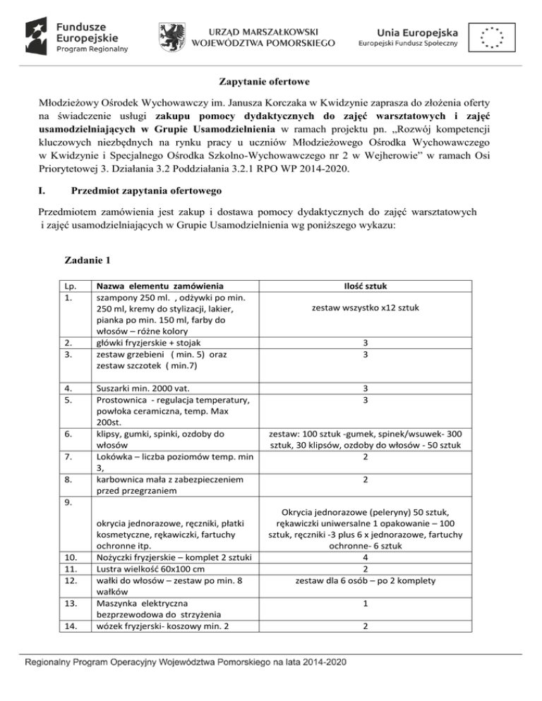 Zapytanie ofertowe Młodzieżowy Ośrodek Wychowawczy im. Janusza Korczaka w Kwidzynie zaprasza do złożenia oferty na świadczenie usługi zakupu pomocy dydaktycznych do zajęć warsztatowych i zajęć usamodzielniających w Grupie Usamodzielnienia w ramach projektu pn. „Rozwój kompetencji kluczowych niezbędnych na rynku pracy u uczniów Młodzieżowego Ośrodka Wychowawczego w Kwidzynie i Specjalnego Ośrodka Szkolno-Wychowawczego nr 2 w Wejherowie” w ramach Osi Priorytetowej 3. Działania 3.2 Poddziałania 3.2.1 RPO WP 2014-2020. I. Przedmiot zapytania ofertowego Przedmiotem zamówienia jest zakup i dostawa pomocy dydaktycznych do zajęć warsztatowych i zajęć usamodzielniających w Grupie Usamodzielnienia wg poniższego wykazu: Zadanie 1 Lp. 1. 2. 3. 4. 5. 6. 7. 8. Nazwa elementu zamówienia szampony 250 ml. , odżywki po min. 250 ml, kremy do stylizacji, lakier, pianka po min. 150 ml, farby do włosów – różne kolory główki fryzjerskie + stojak zestaw grzebieni ( min. 5) oraz zestaw szczotek ( min.7) Suszarki min. 2000 vat. Prostownica - regulacja temperatury, powłoka ceramiczna, temp. Max 200st. klipsy, gumki, spinki, ozdoby do włosów Lokówka – liczba poziomów temp. min 3, karbownica mała z zabezpieczeniem przed przegrzaniem Ilość sztuk zestaw wszystko x12 sztuk 3 3 3 3 zestaw: 100 sztuk -gumek, spinek/wsuwek- 300 sztuk, 30 klipsów, ozdoby do włosów - 50 sztuk 2 2 9. 10. 11. 12. 13. 14. okrycia jednorazowe, ręczniki, płatki kosmetyczne, rękawiczki, fartuchy ochronne itp. Nożyczki fryzjerskie – komplet 2 sztuki Lustra wielkość 60x100 cm wałki do włosów – zestaw po min. 8 wałków Maszynka elektryczna bezprzewodowa do strzyżenia wózek fryzjerski- koszowy min. 2 Okrycia jednorazowe (peleryny) 50 sztuk, rękawiczki uniwersalne 1 opakowanie – 100 sztuk, ręczniki -3 plus 6 x jednorazowe, fartuchy ochronne- 6 sztuk 4 2 zestaw dla 6 osób – po 2 komplety 1 2 15. 16. kosze, na kółkach środki do dezynfekcji narzędzi i skóry, cążki, radełko, pilniki po 3 sztuki poduszka do manicure po sztuce w zestawie, bloki polerskie po sztuce w zestawie, patyczki do manicure narzędzia do hybrydy: lampa, nabłyszczacz, lakiery, kliner, zmywacz, aceton, oliwka pojemność min. 100 ml 17. bezopiłkowe waciki 18. 19. 20. 21. 22. 23. żele budujące jednofazowe tipsy - ozdoby paznokci: klej lampa do pracy miska z masagerem do pedicure frezarka do pięt z końcówkami sól do zmiękczania skóry wielkość opakowania min. 100 g, tarka, kremy zmiękczające do pedicure- min. 100 ml, separatory zestaw dla 6 osób, patyczki – opakowanie lampa -2 sztuki , nabłyszczacz - 6 sztuk, lakiery 15 sztuk, kline 1l , zmywa 1l, aceton 1l, oliwka po 6 sztuk 6 rolek 6 sztuk zestaw – 18 3 2 1 makijaż i akcesoria + zabiegi kosmetyczne tarki - 12 sztuk, sól do zmiękczana skóry - 12 sztuk, kremy zmiękczające do paznokci - 18 sztuk, separatory - 18 sztuk 6 zestawów henny- plus akcesoria szczoteczki- 12 sztuk, waciki- 12 sztuk tusze -12 sztuk – do różnych rodzajów cer, pudry 12 sztuk- do różnych rodzajów cer, kremy do różnych rodzajów cer- 12 sztuk, maseczki do różnych rodzajów cer 12 sztuk, kremy preparaty na zabiegi kosmetyczne, - kremy pudry po 50 ml opakowane, waciki - 12 opakowań, pędzle - 12 sztuk, cienie do powiek - 6 zestawów po 9 kolorów, toniki do różnych rodzajów cer- 12 sztuk, mleczka kosmetyczne do różnych rodzajów cer - 12 sztuk po min. 100 ml, gąbeczki do nakładania makijażu depilacja i akcesoria plastry do depilacji ciała i wąsika po 6 zestawów, zestaw do depilacji gorącym woskiem - 2 sztuki 24. henna i akcesoria 25. 26. 27. szafka do kosmetyków 28 artykuły spożywcze oraz artykuły biurowe na zajęcia warsztatowe i zajęcia usamodzielniające szafka min. 5 półek, szerokość min. 60 cm. karton papieru - A-4, markery- 6 zestawów, 20 długopisów, ołówki 20 sztuk, 20 notesów, 5 kg cukru, 10 kg mąki, 30 jajek, 10 galaretek, 10 opakowań cukru wanilinowego, 10 op. proszku do pieczenia, 5 kostek margaryny do pieczenia, 3 puszki owoców, 5 kg mięsa drobiowego, 1 kg soli, 10 kg warzyw, 15 kg ziemniaka, 2 op. kaszy, 2 op. ryżu, 20 deko pieprzu, 0,5 kg. Przyprawy typu vegetta. Zadanie 2 29. fotel fryzjerski: 2 (dwie sztuki) - regulacja wysokości na siłowniku pneumatycznym - siedzisko obrotowe (360 stopni) - chromowana podstawa - gumowa obwoluta na podstawie zapobiegająca rysowaniu podłogi w wersji z podstawą - siedzisko tapicerowane materiałem welurowym - szerokość siedziska – min. 65 cm - wysokość oparcia – min 45 cm - wysokość min. siedziska - 40 cm - wysokość max. siedziska - 50 cm II. Warunki udziału w postępowaniu 1) W zapytaniu mogą wziąć udział Oferenci, którzy: a) Posiadają potencjał finansowy do realizacji zadania. 2) Dodatkowe warunki dotyczące realizacji usługi: a) Realizacja usługi do 20.11.2016r. – dostawy zakupionego towaru do MOW w Kwidzynie, ul. Moniuszki 5, 82-500 Kwidzyn. b) Potwierdzenie prawidłowej realizacji usługi odbędzie się na podstawie protokołów odbioru. Zamawiający ma prawo nie przyjąć towaru, jeżeli nie spełni on jego oczekiwań dotyczących jakości – materiały mają pozwolić na realizację warsztatów na wysokim poziomie, przy wykorzystaniu do tego celu produktów wysokiej jakości. III. Kryterium wyboru oferty Cena – 100%, IV. Termin i sposób składania ofert 1) oferta powinna zostać sporządzona na formularzu ofertowym według wzoru stanowiącego załącznik nr 1 do zapytania ofertowego; 2) Podpisane oferty należy składać do dnia 2.11.2016 roku do godz: 15.00 w Młodzieżowym Ośrodku Wychowawczym w Kwidzynie, ul. Moniuszki 5, 82500 Kwidzyn. V. Informacje na temat zakresu wykluczenia: W celu uniknięcia konfliktu interesów, zamówienie nie może być udzielone podmiotom powiązanym osobowo lub kapitałowo z zamawiającym. Przez powiązania kapitałowe lub osobowe rozumie się wzajemne powiązania między zamawiającym lub osobami u