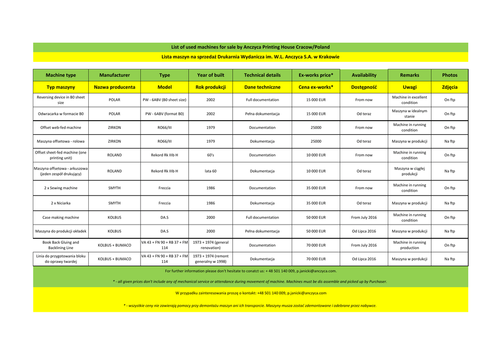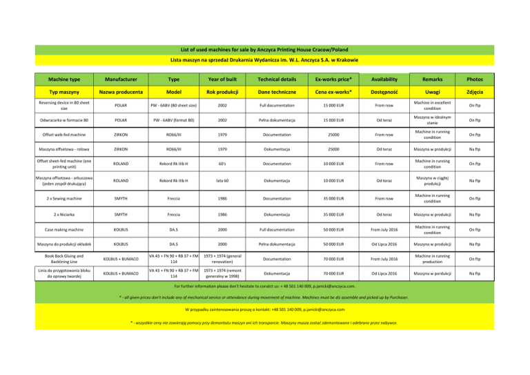 List of used machines for sale by Anczyca Printing House Cracow/Poland Lista maszyn na sprzedaż Drukarnia Wydanicza im. W.L. Anczyca S.A. w Krakowie Machine type Manufacturer Type Year of built Technical details Ex-works price* Availability Remarks Photos Typ maszyny Nazwa producenta Model Rok produkcji Dane techniczne Cena ex-works* Dostępność Uwagi Zdjęcia Reversing device in B0 sheet size POLAR PW - 6ABV (B0 sheet size) 2002 Full documentation 15 000 EUR From now Machine in excellent condition On ftp Odwracarka w formacie B0 POLAR PW - 6ABV (format B0) 2002 Pełna dokumentacja 15 000 EUR Od teraz Maszyna w idealnym stanie On ftp Offset web-fed machine ZIRKON RO66/III 1979 Documentation 25000 From now Machine in running condition On ftp Maszyna offsetowa - rolowa ZIRKON RO66/III 1979 Dokumentacja 25000 Od teraz Maszyna w produkcji Na ftp Offset sheet-fed machine (one printing unit) ROLAND Rekord Rk IIIb H 60's Documentation 10 000 EUR From now Machine in running condition On ftp Maszyna offsetowa - arkuszowa (jeden zespół drukujący) ROLAND Rekord Rk IIIb H lata 60 Dokumentacja 10 000 EUR Od teraz Maszyna w ciągłej produkcji Na ftp 2 x Sewing machine SMYTH Freccia 1986 Documentation 35 000 EUR From now Machine in running condition On ftp 2 x Niciarka SMYTH Freccia 1986 Dokumentacja 35 000 EUR Od teraz Maszyna w produkcji Na ftp Case making machine KOLBUS DA.S 2000 Full documentation 50 000 EUR From July 2016 Machine in running condition On ftp Maszyna do produkcji okładek KOLBUS DA.S 2000 Pełna dokumentacja 50 000 EUR Od Lipca 2016 Maszyna w produkcji Na ftp Book Back Gluing and Backlining Line KOLBUS + BUMACO VA 43 + FN 90 + RB 37 + FM 114 1973 + 1974 (general renovation) Documentation 70 000 EUR From July 2016 Machine in running production On ftp Linia do przygotowania bloku do oprawy twardej KOLBUS + BUMACO VA 43 + FN 90 + RB 37 + FM 114 1973 + 1974 (remont generalny w 1998) Dokumentacja 70 000 EUR Od Lipca 2016 Maszyna w pordukcji Na ftp For further information please don't hesitate to conatct us: + 48 501 140 009, [email protected]. * - all given prices don't include any of mechanical service or attendance during movement of machine. Machines must be dis assemble and picked up by Purchaser. W przypadku zainteresowania proszę o kontakt: +48 501 140 009, [email protected] * - wszystkie ceny nie zawierają pomocy przy demontażu maszyn ani ich transporcie. Maszyny musza zostać zdemontowane i odebrane przez nabywce.
