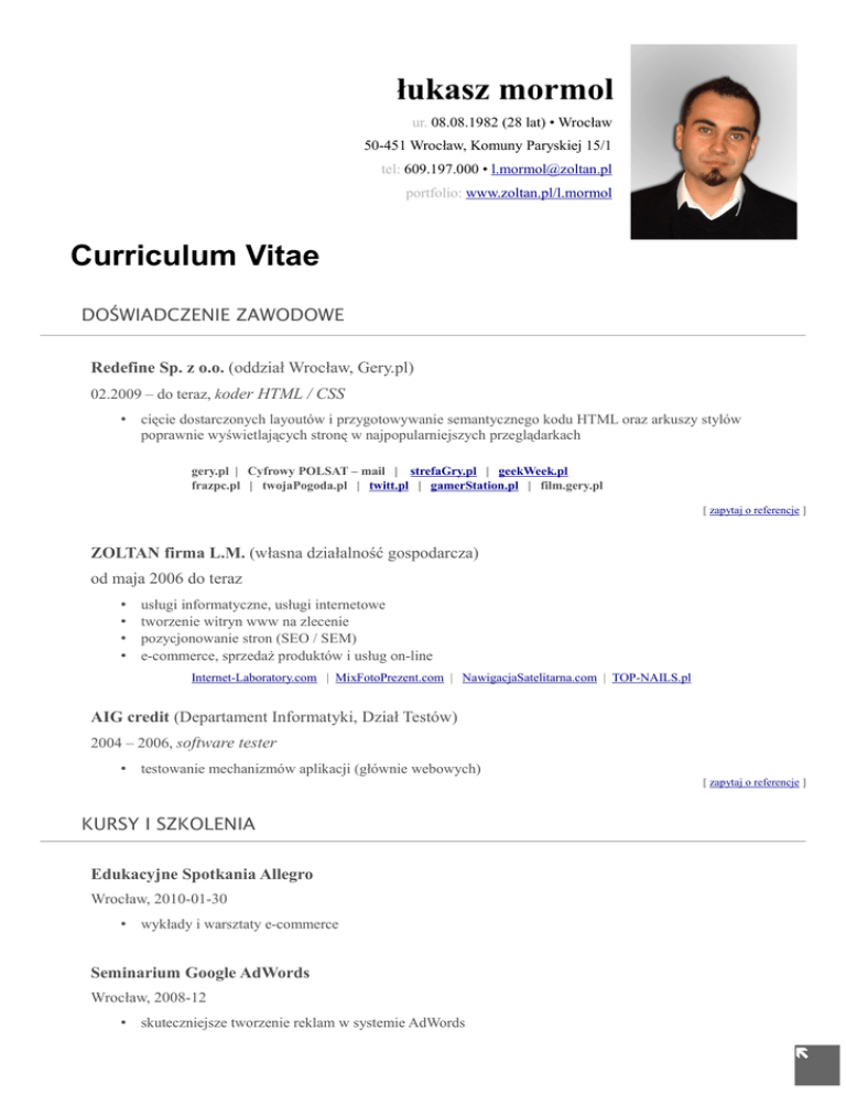łukasz mormol ur. 08.08.1982 (28 lat) • Wrocław 50-451 Wrocław, Komuny Paryskiej 15/1 tel: 609.197.000 • [email protected] portfolio: www.zoltan.pl/l.mormol Curriculum Vitae DOŚWIADCZENIE ZAWODOWE Redefine Sp. z o.o. (oddział Wrocław, Gery.pl) 02.2009 – do teraz, koder HTML / CSS • cięcie dostarczonych layoutów i przygotowywanie semantycznego kodu HTML oraz arkuszy stylów poprawnie wyświetlających stronę w najpopularniejszych przeglądarkach gery.pl | Cyfrowy POLSAT – mail | strefaGry.pl | geekWeek.pl frazpc.pl | twojaPogoda.pl | twitt.pl | gamerStation.pl | film.gery.pl [ zapytaj o referencje ] ZOLTAN firma L.M. (własna działalność gospodarcza) od maja 2006 do teraz • • • • usługi informatyczne, usługi internetowe tworzenie witryn www na zlecenie pozycjonowanie stron (SEO / SEM) e-commerce, sprzedaż produktów i usług on-line Internet-Laboratory.com | MixFotoPrezent.com | NawigacjaSatelitarna.com | TOP-NAILS.pl AIG credit (Departament Informatyki, Dział Testów) 2004 – 2006, software tester • testowanie mechanizmów aplikacji (głównie webowych) [ zapytaj o referencje ] KURSY I SZKOLENIA Edukacyjne Spotkania Allegro Wrocław, 2010-01-30 • wykłady i warsztaty e-commerce Seminarium Google AdWords Wrocław, 2008-12 • skuteczniejsze tworzenie reklam w systemie AdWords EDUKACJA Policealna Szkoła E-Biznesu 2005-2007 • przyswajanie wiedzy z zakresu przedsiębiorczości w Internecie (e-biznes, e-commerce) Politechnika Wrocławska 2001-2004 • studiowałem na wydziale Elektroniki i Telekomunikacji (inżynieria dźwięku) studia te nie zostały przeze mnie ukończone Liceum Ogólnokształcące 1997-2001 • profil informatyczny UMIEJĘTNOŚCI bardzo dobra znajomość XHTML, CSS, DOM, CSS Box Model, standardów W3C dobra znajomość Adobe Photoshop poparta dużym doświadczeniem umiejętność optymalizacji kodu stron dla najpopularniejszych przeglądarek umiejętne posługiwanie się narzędziem Firebug obsługa SVN, zaznajomiony z jQuery, MooTools język angielski: w piśmie/dobry, w mowie/dostateczny • prawo jazdy (kat. B, A) • • • • • • ZAINTERESOWANIA • kocham podróże motocyklem • nie mniej lubię aktywny wypoczynek zimą (narciarstwo) • wielką frajdę sprawia mi gra w badmintona Z wyrazami uznania i szacunku, Łukasz Mormol Wyrażam zgodę na przechowywanie i przetwarzanie moich danych osobowych zawartych w mojej ofercie pracy dla potrzeb niezbędnych do realizacji procesu rekrutacji zgodnie z Ustawą z dnia 29.08.1997 o ochronie danych osobowych, j.t. Dz. U. z 2002 roku, Nr 101 poz. 926 z późn. zm.