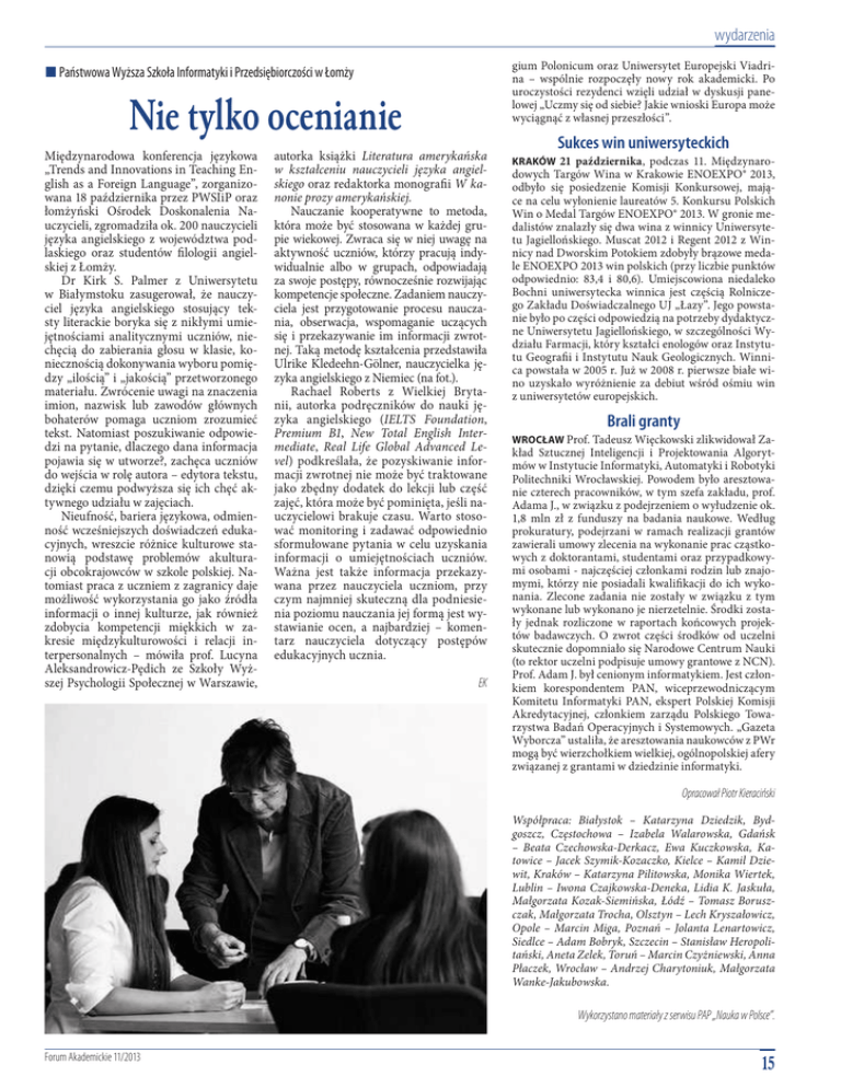 wydarzenia gium Polonicum oraz Uniwersytet Europejski Viadrina – wspólnie rozpoczęły nowy rok akademicki. Po uroczystości rezydenci wzięli udział w dyskusji panelowej „Uczmy się od siebie? Jakie wnioski Europa może wyciągnąć z własnej przeszłości”. ! Państwowa Wyższa Szkoła Informatyki i Przedsiębiorczości w Łomży Nie tylko ocenianie Międzynarodowa konferencja językowa „Trends and Innovations in Teaching English as a Foreign Language”, zorganizowana 18 października przez PWSIiP oraz łomżyński Ośrodek Doskonalenia Nauczycieli, zgromadziła ok. 200 nauczycieli języka angielskiego z województwa podlaskiego oraz studentów filologii angielskiej z Łomży. Dr Kirk S. Palmer z Uniwersytetu w Białymstoku zasugerował, że nauczyciel języka angielskiego stosujący teksty literackie boryka się z nikłymi umiejętnościami analitycznymi uczniów, niechęcią do zabierania głosu w klasie, koniecznością dokonywania wyboru pomiędzy „ilością” i „jakością” przetworzonego materiału. Zwrócenie uwagi na znaczenia imion, nazwisk lub zawodów głównych bohaterów pomaga uczniom zrozumieć tekst. Natomiast poszukiwanie odpowiedzi na pytanie, dlaczego dana informacja pojawia się w utworze?, zachęca uczniów do wejścia w rolę autora – edytora tekstu, dzięki czemu podwyższa się ich chęć aktywnego udziału w zajęciach. Nieufność, bariera językowa, odmienność wcześniejszych doświadczeń edukacyjnych, wreszcie różnice kulturowe stanowią podstawę problemów akulturacji obcokrajowców w szkole polskiej. Natomiast praca z uczniem z zagranicy daje możliwość wykorzystania go jako źródła informacji o innej kulturze, jak również zdobycia kompetencji miękkich w zakresie międzykulturowości i relacji interpersonalnych – mówiła prof. Lucyna Aleksandrowicz-Pędich ze Szkoły Wyższej Psychologii Społecznej w Warszawie, autorka książki Literatura amerykańska w kształceniu nauczycieli języka angielskiego oraz redaktorka monografii W kanonie prozy amerykańskiej. Nauczanie kooperatywne to metoda, która może być stosowana w każdej grupie wiekowej. Zwraca się w niej uwagę na aktywność uczniów, którzy pracują indywidualnie albo w grupach, odpowiadają za swoje postępy, równocześnie rozwijając kompetencje społeczne. Zadaniem nauczyciela jest przygotowanie procesu nauczania, obserwacja, wspomaganie uczących się i przekazywanie im informacji zwrotnej. Taką metodę kształcenia przedstawiła Ulrike Kledeehn-Gölner, nauczycielka języka angielskiego z Niemiec (na fot.). Rachael Roberts z Wielkiej Brytanii, autorka podręczników do nauki języka angielskiego (IELTS Foundation, Premium B1, New Total English Intermediate, Real Life Global Advanced Level) podkreślała, że pozyskiwanie informacji zwrotnej nie może być traktowane jako zbędny dodatek do lekcji lub część zajęć, która może być pominięta, jeśli nauczycielowi brakuje czasu. Warto stosować monitoring i zadawać odpowiednio sformułowane pytania w celu uzyskania informacji o umiejętnościach uczniów. Ważna jest także informacja przekazywana przez nauczyciela uczniom, przy czym najmniej skuteczną dla podniesienia poziomu nauczania jej formą jest wystawianie ocen, a najbardziej – komentarz nauczyciela dotyczący postępów edukacyjnych ucznia. EK Sukces win uniwersyteckich KRAKÓW 21 października, podczas 11. Międzynarodowych Targów Wina w Krakowie ENOEXPO® 2013, odbyło się posiedzenie Komisji Konkursowej, mające na celu wyłonienie laureatów 5. Konkursu Polskich Win o Medal Targów ENOEXPO® 2013. W gronie medalistów znalazły się dwa wina z winnicy Uniwersytetu Jagiellońskiego. Muscat 2012 i Regent 2012 z Winnicy nad Dworskim Potokiem zdobyły brązowe medale ENOEXPO 2013 win polskich (przy liczbie punktów odpowiednio: 83,4 i 80,6). Umiejscowiona niedaleko Bochni uniwersytecka winnica jest częścią Rolniczego Zakładu Doświadczalnego UJ „Łazy”. Jego powstanie było po części odpowiedzią na potrzeby dydaktyczne Uniwersytetu Jagiellońskiego, w szczególności Wydziału Farmacji, który kształci enologów oraz Instytutu Geografii i Instytutu Nauk Geologicznych. Winnica powstała w 2005 r. Już w 2008 r. pierwsze białe wino uzyskało wyróżnienie za debiut wśród ośmiu win z uniwersytetów europejskich. Brali granty WROCŁAW Prof. Tadeusz Więckowski zlikwidował Za- kład Sztucznej Inteligencji i Projektowania Algorytmów w Instytucie Informatyki, Automatyki i Robotyki Politechniki Wrocławskiej. Powodem było aresztowanie czterech pracowników, w tym szefa zakładu, prof. Adama J., w związku z podejrzeniem o wyłudzenie ok. 1,8 mln zł z funduszy na badania naukowe. Według prokuratury, podejrzani w ramach realizacji grantów zawierali umowy zlecenia na wykonanie prac cząstkowych z doktorantami, studentami oraz przypadkowymi osobami - najczęściej członkami rodzin lub znajomymi, którzy nie posiadali kwalifikacji do ich wykonania. Zlecone zadania nie zostały w związku z tym wykonane lub wykonano je nierzetelnie. Środki zostały jednak rozliczone w raportach końcowych projektów badawczych. O zwrot części środków od uczelni skutecznie dopomniało się Narodowe Centrum Nauki (to rektor uczelni podpisuje umowy grantowe z NCN). Prof. Adam J. był cenionym informatykiem. Jest członkiem korespondentem PAN, wiceprzewodniczącym Komitetu Informatyki PAN, ekspert Polskiej Komisji Akredytacyjnej, członkiem zarządu Polskiego Towarzystwa Badań Operacyjnych i Systemowych. „Gazeta Wyborcza” ustaliła, że aresztowania naukowców z PWr mogą być wierzchołkiem wielkiej, ogólnopolskiej afery związanej z grantami w dziedzinie informatyki. Opracował Piotr Kieraciński Współpraca: Białystok – Katarzyna Dziedzik, Bydgoszcz, Częstochowa – Izabela Walarowska, Gdańsk – Beata Czechowska-Derkacz, Ewa Kuczkowska, Katowice – Jacek Szymik-Kozaczko, Kielce – Kamil Dziewit, Kraków – Katarzyna Pil