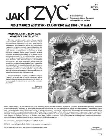NR 5 22 IV 2013 WROCŁAW NIEPERIODYCZNY ORGAN STOWARZYSZENIA MĘDRCÓW WROCŁAWSKICH Z SIEDZIBĄ W INSTYTUCIE „LITERATKA” PROLETARIUSZE WSZYSTKICH KRAJÓW KTOŚ WAS ZROBIŁ W WAŁA KULINARIA, CZYLI SŁÓW PARĘ OD GOŃCA NACZELNEGO Telewizje wszelkich maści i odcieni koncentrują się, przed świętami zwłaszcza, na sztuce kulinarnej. Dzięki temu bezrobotni i ich rodziny, w tym dzieci, mogą zobaczyć jak się piecze francuską kaczkę. Kaczka jest ciężkostrawna i nadmierne jej spożycie nie służy higienie odżywiania. Niedługo wszakże łaki i nasypy zazielenią się szczawiem, mleczem, lebiodą i innymi jarzynami co spowoduje, że My, Naród Polski napełnimy żołądki zdrową żywnością. Na deser mirabelki i ulęgałki, pod warunkiem, że nie dorwie nas rozwścieczony sadownik. Pod koniec XVIII wieku w kraju o nazwie Francja na posadzie królowej zatrudniona była niejaka Maria Antonina, która dowiedziawszy się, że bezrobotni paryżanie chcą żreć, a nie mają chleba, poradziła im (tym paryżanom), żeby jedli ciastka. Poddani nieco rozczarowali się radą królowej i po paru latach zawieźli ją drabiniastym wózkiem na Plac Rewolucji, gdzie przy pomocy gilotyny oddzielono Jej głowę od tułowia. Wniosek z tego, a nawet morał, że o kwestiach związanych z odżywianiem należy się wypowiadać z dyplomatyczną ostrożnością. Przy okazji informuję wszystkich uczestników strajków i rewolucji, że jak na razie, po każdym zwycięstwie jedynie słusznej sprawy, po okresie euforii i nadzieje, do władzy zawsze wracają królowie,prezydenci, prezesi albo nawet jakiś Józef Stalin. Cały goniec Stanisław Szelc Święta, święta i święta. Cały czas biało, smutno i szaro. Jak można napisać w takich warunkach tekst wesoły i urodziwy. Wychodzi tekst upierdliwy. Przecież od grudnia Bóg się rodzi i przedziera się przez śnieg. Wesołego Alleluja, nieźle nas tym roku buja. Wiadomo jednak, że gdy ukaże się piąty numer naszej gazety „Jak Rzyć”, słońce będzie świecić, a Wielkanoc będzie już tylko wspomnieniem. To przez nas ustalona nowa, świecka tradycja i dlatego nasza redakcja składa wszystkim czytelnikom najserdeczniejsze życzenia, Wesołego Jajka i miłości. Gdy jest miłość, rodzą się gorące uczucia i rozpuszczają śnieg, co w przypadku obecnych anomalii pogodowych jest bardzo pożądane. Poza tym, lepiej późno, niż wcale. Drogi czytelniku, zwróć uwagę na świąteczną kartkę, którą publikujemy. Przyjrzyj się uważnie, a zauważysz, że Jezus ma cztery stopy. Żaden to fotomontaż, oto przykład. jak Poczta Polska wyobraża sobie nowoczesne święta. Może te dodatkowe nogi wyrosły Jezuskowi od przedzierania się przez śnieg, kto wie? I na koniec cytat z „Ewangelii według kolorów 1234515, 50–51” 50. Rzekła przejęta Krupa do Dody: Na Woronicza ukazała się na szybie pieta. 51. Żachnęła się Doda: Żadna tam pieta, to Tadla nosi na rękach Kreta. vice goniec Maciej Żurawski 1 LEGENDY WROCŁAWIA I DOLNEGO ŚLĄSKA WESOŁEGO JAJKA! Bawiąc się jajeczkiem... Wróć! Łamiąc się jajeczkiem, tak sobie świątecznie dywaguję... Co było pierwsze – jajko czy kura?... Już starożytni Rzymianie... lubili zaczynać “ab ovo”, czyli “od jaja”. U nas też jeszcze w latach komuny dobrze było zdanie zacząć: „ja–ja–ko–były– partyzant...” A mówi się też np. “Ale jaja!” albo “Jaja jak berety!” Tzn.: “ale śmieszne!” Bardzo śmieszne. Nie ma sensu, ale z jajem. No bo co można zrobić z takim jajem?... Owszem, pisankę. A są różne szkoły. Widziałem w telewizji, że można malowane jajeczka skrobać brzytwą. Osobiście bym nie ryzykował i nie każdemu radzę, bo to trudna sztuka i trzeba dużo samozaparcia. A samozadowolenie już niekoniecznie. A już jak się omsknie, aj!... Nie, bez jaj. Można też polewać roztopionym woskiem (który, jak wiadomo, parzy!), a potem zdrapywać. Masakra! Można też zwyczajnie – malowanką, pędzelkowaniem; można w cebuli albo w burakach obgotować. Koloru nabierze, ale i stwardnieje. Bo musi być na twardo. Jaja intrygowały ludzi od zawsze. Intrygowały na dworach, w salonach i w alkowach. I jest to wynikiem atawistycznych ciągot. Z czegoś się to bierze. Nie twierdzę, że człowiek wykluł się z jaja... Ale mówi się: “Czy chcesz w dziób?!” albo “Zamknij dziób!” Albo się mówi: Chodzić spać z kurami. (Czy to nie jest zboczenie?) Mówi się, że człowiek ma szczątkową kość ogonową, w zaniku. (Niektórzy mają nie tylko ogon w zaniku, ale o tym się nie mówi.) Po co mu taki ogon? Zapytajcie “Ptaśka”. Ten sam motyw przechował się w przysłowiach i porzekadłach ludowych, np: „Jajko mądrzejsze od kury” albo „Lepiej stracić jajko niż kurę” (i tu bym polemizował!) Tak to w wyrażeniach językowych zapisana jest nasze jajcarskie pochodzenie. Człowiek jest urodzonym jajcarzem. Nie przypadkiem najmądrzejszych określa się mianem „jajogłowi”, najpodobniejsi są – jednojajowi, a najfajniejsi – dwujajowi. Można powiedzieć: z jajka powstałeś i... gdzie się obrócisz, wszędzie jaja. A co jeszcze można z takim jajeczkiem? Przede wszystkim, oczywiście, można stłuc jajeczko, ale kto raz sobie stłukł, ten wie, że to niemiłe. Trzeba więc uważać i – jak to mówią: obchodzić się z jajkiem jak z jajkiem. Bo nie odkryję Ameryki, jeśli powiem, że jajka są bardzo delikatne. Ale czasem taka ofiara jest konieczna. Np. Kolumb stłukł. Inaczej też nie odkryłby Ameryki. I tak przeszło do historii „jajko Kolumba”. Po prostu stłukł je i postawił na swoim. (Oczywiście – stole, nie jajeczku.) Ale, co tam! ja potrafię nie tylko jajko postawić, ale tak zrobić, że mnie się jajko odbija. Dwa dni czasem. Nie żeby było z gumy, ale źle trawię. Jednak tradycja każe, więc się umartwiam. A propos tej tradycji: podobno zwyczaj jedzenia jaj na twardo w święta Wielkan