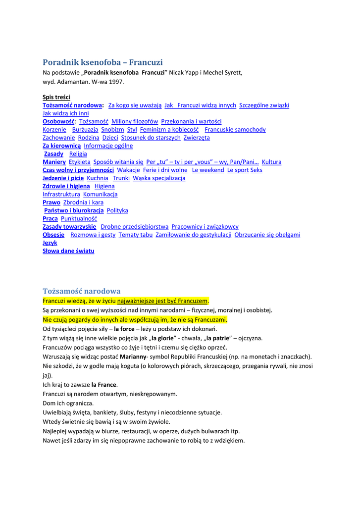 Poradnik ksenofoba – Francuzi Na podstawie „Poradnik ksenofoba Francuzi” Nicak Yapp i Mechel Syrett, wyd. Adamantan. W-wa 1997. Spis treści Tożsamość narodowa: Za kogo się uważają Jak Francuzi widzą innych Szczególne związki Jak widzą ich inni Osobowość: Tożsamość Miliony filozofów Przekonania i wartości Korzenie Burżuazja Snobizm Styl Feminizm a kobiecość Francuskie samochody Zachowanie Rodzina Dzieci Stosunek do starszych Zwierzęta Za kierownicą Informacje ogólne Zasady Religia Maniery Etykieta Sposób witania się Per „tu” – ty i per „vous” – wy, Pan/Pani… Kultura Czas wolny i przyjemności Wakacje Ferie i dni wolne Le weekend Le sport Seks Jedzenie i picie Kuchnia Trunki Wąska specjalizacja Zdrowie i higiena Higiena Infrastruktura Komunikacja Prawo Zbrodnia i kara Państwo i biurokracja Polityka Praca Punktualność Zasady towarzyskie Drobne przedsiębiorstwa Pracownicy i związkowcy Obsesje Rozmowa i gesty Tematy tabu Zamiłowanie do gestykulacji Obrzucanie się obelgami Język Słowa dane światu Tożsamość narodowa Francuzi wiedzą, że w życiu najważniejsze jest być Francuzem. Są przekonani o swej wyższości nad innymi narodami – fizycznej, moralnej i osobistej. Nie czują pogardy do innych ale współczują im, że nie są Francuzami. Od tysiącleci pojęcie siły – la force – leży u podstaw ich dokonań. Z tym wiążą się inne wielkie pojęcia jak „la glorie” - chwała, „la patrie” – ojczyzna. Francuzów pociąga wszystko co żyje i tętni i czemu się ciężko oprzeć. Wzruszają się widząc postać Marianny- symbol Republiki Francuskiej (np. na monetach i znaczkach). Nie szkodzi, że w godle mają koguta (o kolorowych piórach, skrzeczącego, przegania rywali, nie znosi jaj). Ich kraj to zawsze la France. Francuzi są narodem otwartym, nieskrępowanym. Dom ich ogranicza. Uwielbiają święta, bankiety, śluby, festyny i niecodzienne sytuacje. Wtedy świetnie się bawią i są w swoim żywiole. Najlepiej wypadają w biurze, restauracji, w operze, dużych bulwarach itp. Nawet jeśli zdarzy im się niepoprawne zachowanie to robią to z wdziękiem. Za kogo się uważają Francuzi uważają się za jedyny prawdziwie cywilizowany naród na świecie, którego posłannictwem jest oświecanie ludzkości. Są znawcami wszystkich liczących się dziedzin. Jeśli na czymś się nie znają, to jest nieistotne. Jako, że Francja wygrała prawie wszystkie wojny, w których uczestniczyła, przyjmują, że ostateczny wynik każdej potyczki jest ich zwycięstwem. Francuzi cokolwiek robią, uznają to za błyskotliwe. Od renesansu do czasów Chiraca a może i dzisiaj, francuscy politycy widzieli i widzą Francję jaśniejącą blaskiem a siebie prorokami świata. Jak Francuzi widzą innych Francuzi wielkodusznie akceptują konieczność istnienia innych narodów. Anglicy Anglikami interesują się, chociaż uważają ich za bezmyślnych, prymitywnych, godnych politowania, pozbawionych gustu, zajmujących się głównie uprawianiem ogródka, grą w krykieta i spożywaniem w pubach ciężkiego, słodkiego i ciepłego piwa. Anglikom nie należy ufać. Turystów angielskich odwiedzających Calais nazywają „les fuck-offs”, a wszystkich Anglików za „perfide” (nie ustalono, czy Napoleon został otruty na Wsypie Św. Heleny) ale po kieliszku whisky potrafią wiele wybaczyć. Niemcy Francuzi nie czują nienawiści do Niemców ale nie darzą ich sympatią. Są przekonani o ich znacznej niższości kulturowej, choć łaskawie pozwalają im na przewagę gospodarczą. Odczuwają też przewagę polityczną nad Niemcami, państwem, które po I wojnie wraz z utratą kolonii zniknęło z areny międzynarodowej. Francuzi też nie mają już kolonii ale mają terytoria zamorskie. Francuskie prawodawstwo, język i kultura przetrwały na wszystkich kontynentach – od Kanady po Nowe Hybrydy, od Indochin po Gujanę Francuską, od Wybrzeża Kości Słoniowej po Liban. Francuzi mają jednak z Niemcami wiele cech wspólnych: są formalistami, zachowują dystans, uznają czystość rasy, wierzą w celowość dziejów. Hiszpanie O Hiszpanach Francuzi mówią, że są dumni, hałaśliwi i produkują za dużo wina, czym szkodzą uprawie winorośli na francuskim Południu. Szwajcarzy i Belgowie W stosunku do tych narodów Francuzi nie odczuwają jednocześnie podziwu i pogardy. Szwajcarzy stali się przedmiotem żartów w reklamach telewizyjnych. Są gościnni ale są maniakami czystości a ich francuszczyzna jest dziwaczna. Belgowie uznawani są za tępych i pozbawionych finezji. Belg jest dla Francuza typem „nieprzemakalnym” i źródłem dowcipów. Dowcipy często dyktuje zazdrość, bo standard życia Belgów jest czasem wyższy. Szczególne związki Wspólnotę Europejską Francuzi uznają za zbędną ale skoro już istnieje to jej stworzenie przypisują sobie ( uznając ją np. za dzieło Jeana Monneta). Francuzi lubią decydować o wydawaniu funduszy unijnych. W przeszłości różnie układały się stosunki Francji z USA, których terytorium w dużej części należało do Francji jak i z Kanadą, którą Francuzi zaludnili. Różnice kanadyjskiej wersji francuskiego (Quebec) są duże i wymagają czasem tłumaczenia ścieżki dźwiękowej filmu. Francuzi mają szacunek do amerykańskiej konstytucji i prawodawstwa i tego, że Amerykanie pogonili Anglików (też z pomocą Francuzów) ale nie mogą znieść amerykańskości. Francuzi zdołali uwieść kilka pokoleń Amerykanów nie odwzajemniając ich uczuć. Jak widzą ich inni Francuzi w oczach wielu są niekonsekwentni. Jest to błędna ocena, która bierze się z niezrozumienia Francuzów, którzy ważne decyzje podejmują pod kątem korzyści własnej. Francuzi uważają, że konsekwencja w sposobie postępowania tchnie nudą. Francuzi przekonani o swojej wyższości nie bardzo interesują się tym, jak inni ich postrzegają. Osobowość Sekrety duszy francuskiej Każdy Francuz 